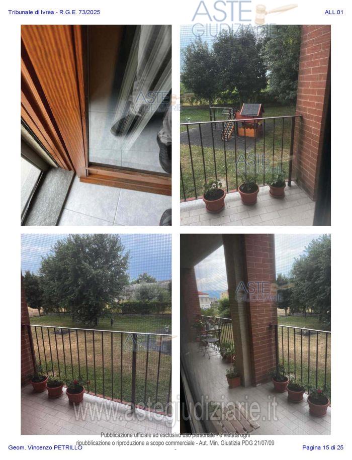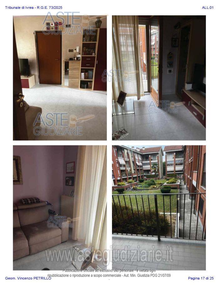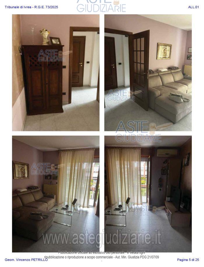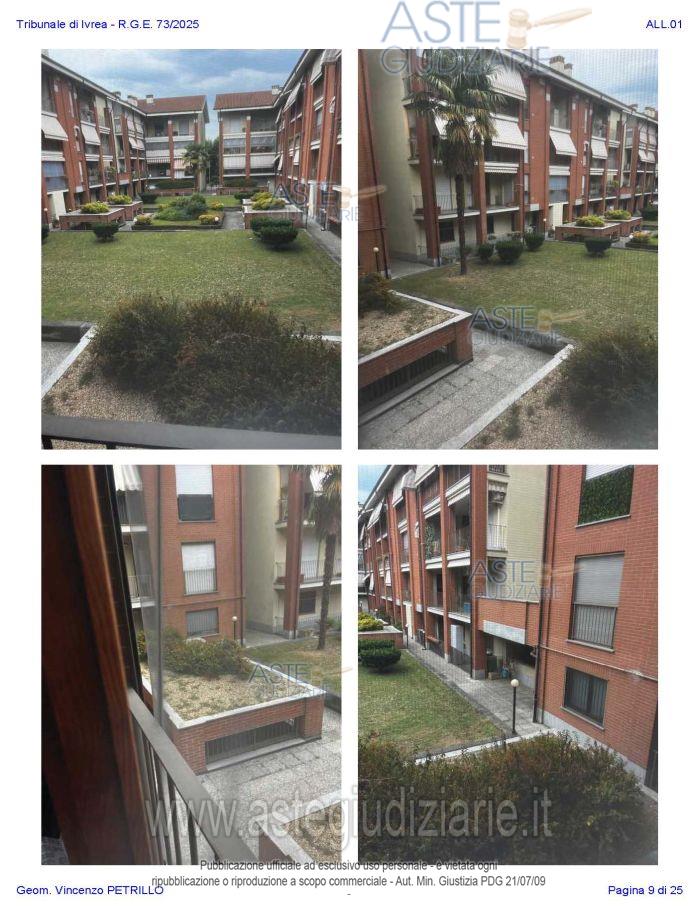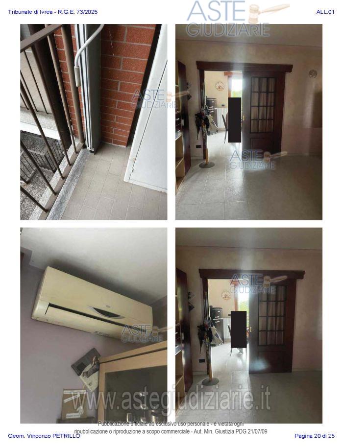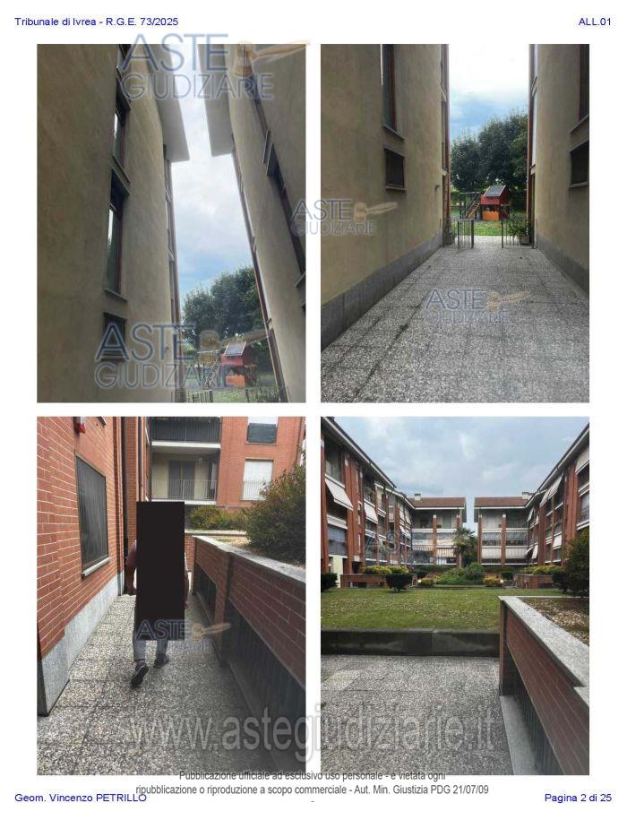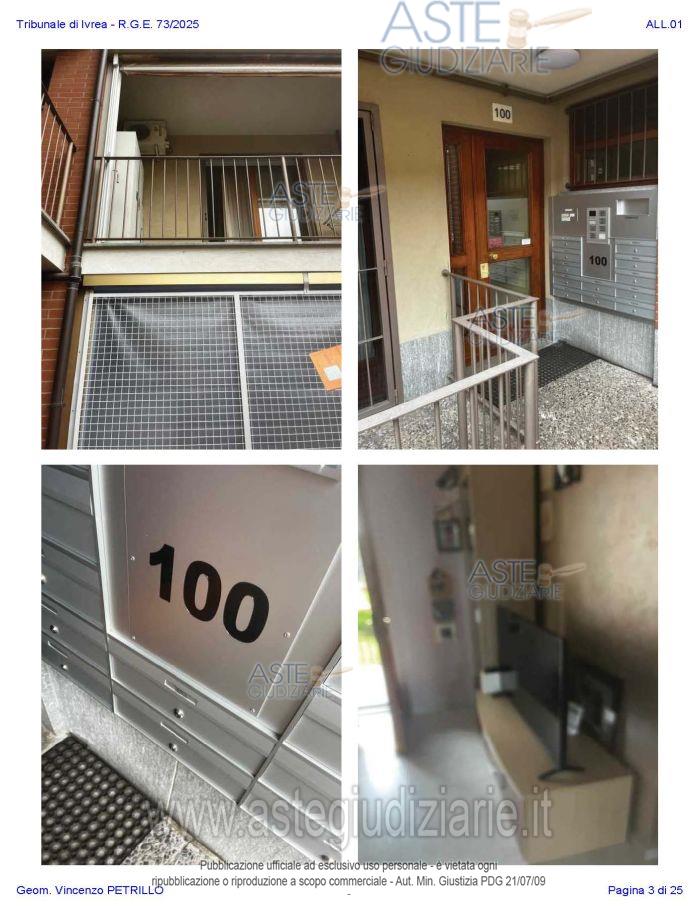 Vendita all'asta Senza incanto, con gara telematica asincrona - LOTTO UNICO: Alloggio al piano primo distinto con il n. di interno 10, composto da ingresso-soggiorno, cucina, due camere, un bagno, disimpegno, e due balconi; oltre al piano interrato: cantina pertinenziale, distinta con il numero di interno 17c. Prezzo base € 97.500,00 (offerta minima € 73.125,00). Data inizio operazioni di vendita: 27/01/2026 ore 10:00. Professionista delegato alla vendita Avv. Nicole Peretti - Email "nicoleperetti@virgilio.it"; Cell. 3479270567. Custode Giudiziario Torino Ifir Piemonte - Email "richiestevisite.ivrea@ivgpiemonte.it"; Tel. 011482822. Rif. Tribunale di Ivrea - Espropriazione immobiliare (cartabia) n. 73/2025