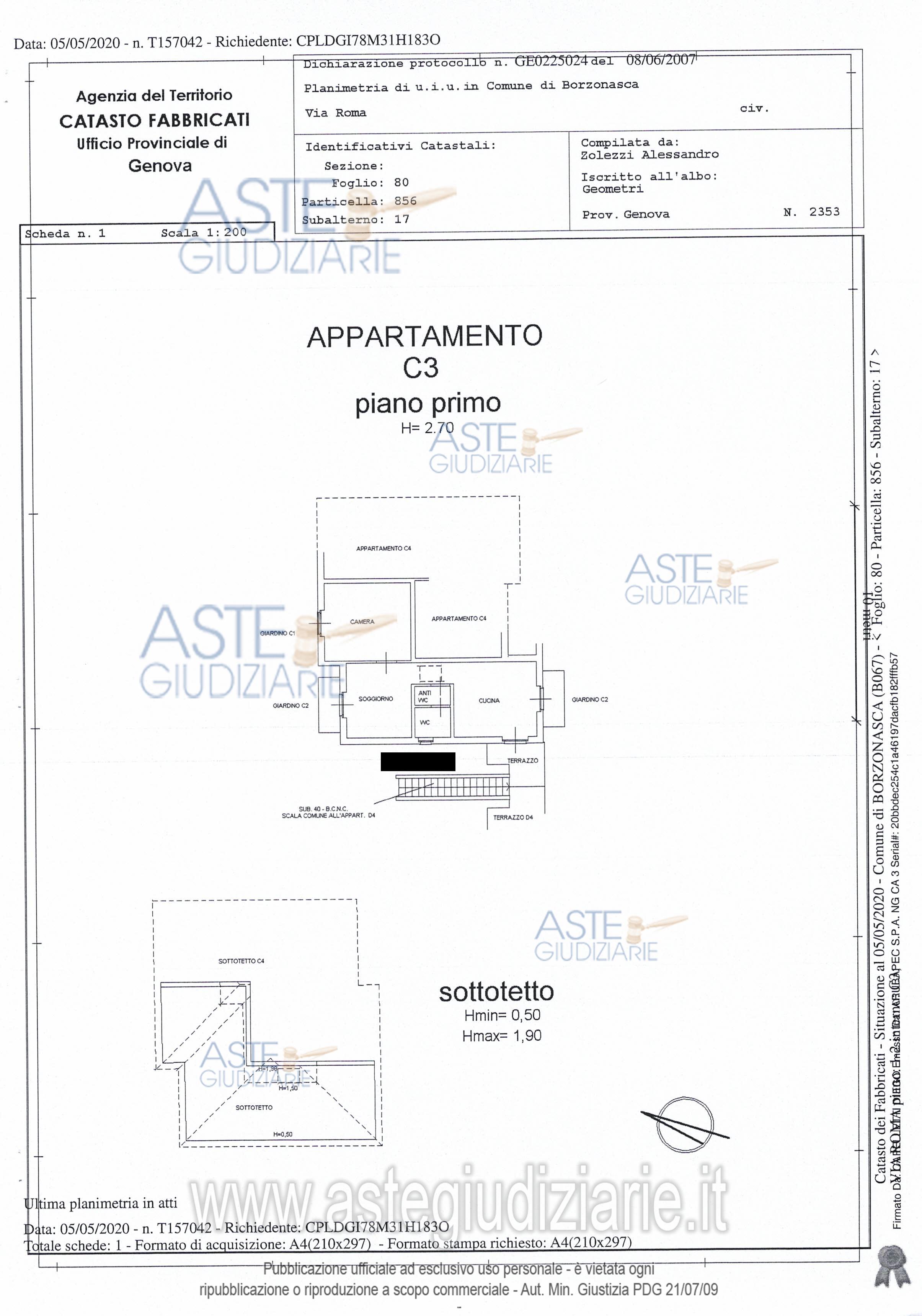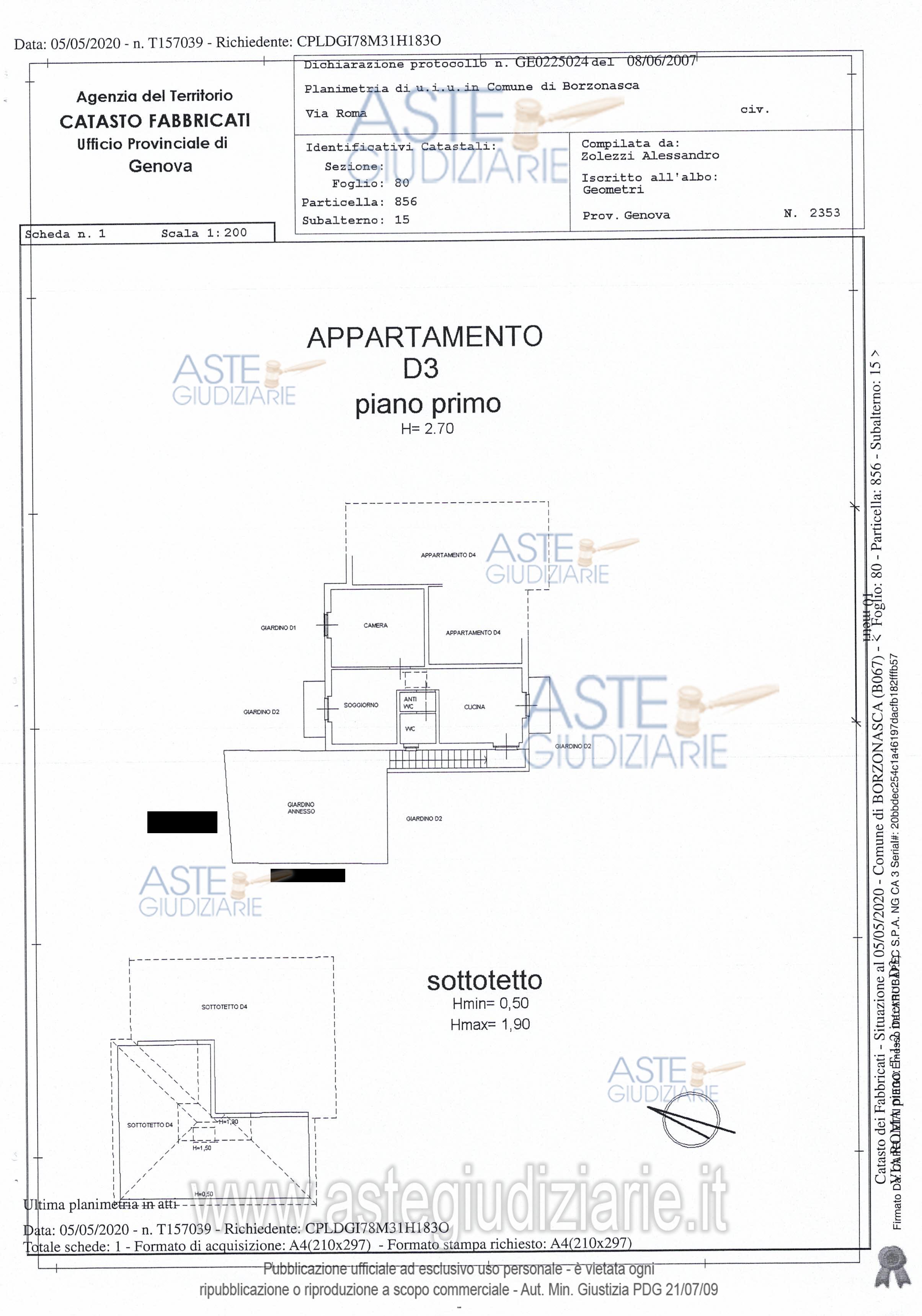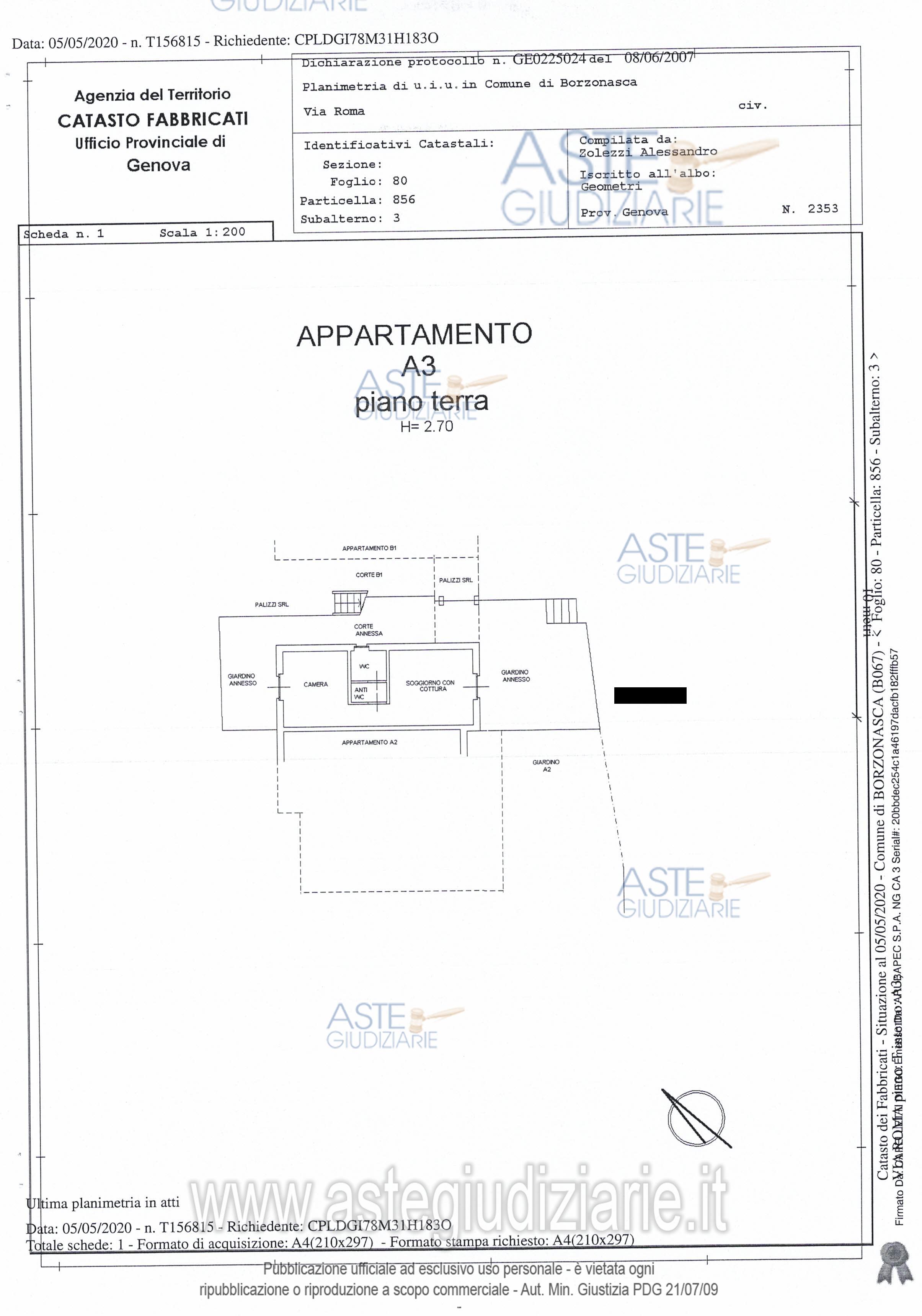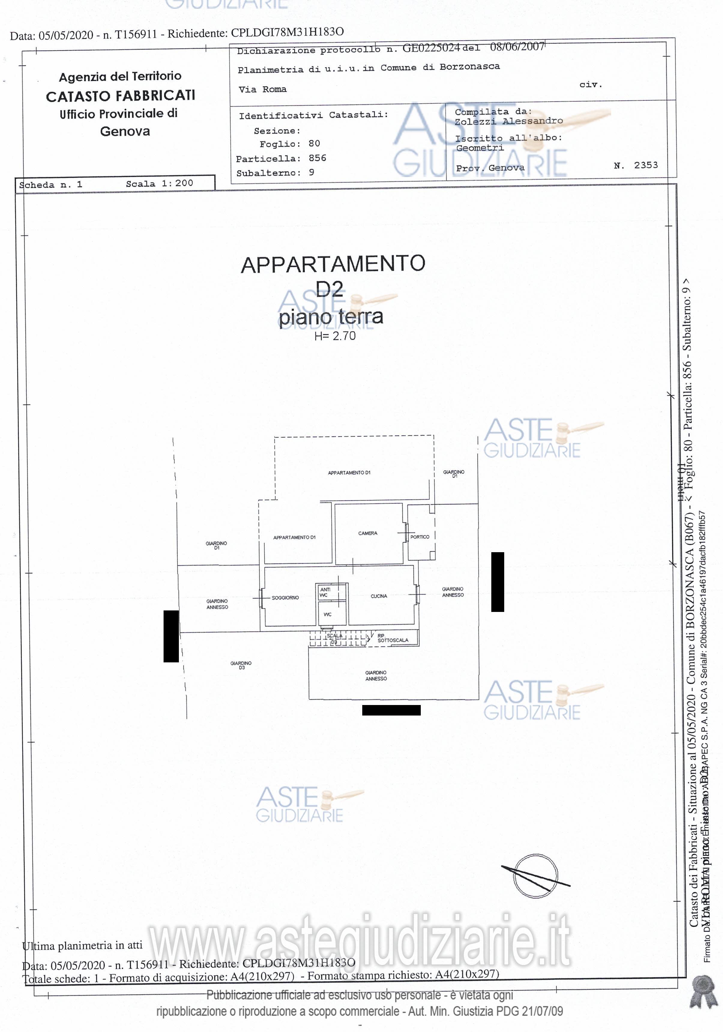 Vendita all'asta Senza incanto, con gara telematica sincrona mista - LOTTO UNICO: LOTTO1 -BENE1:1/1 Diritto proprietà appartamento ubicato a Borzonasca (Ge) Via Roma edificio A int 1 p.T; BENE 2; 1/1 Diritto proprietà appartamento ubicato a Borzonasca (Ge) Via Roma edificio A int 2 p.T; BENE 3: 1/1 Diritto proprietà appartamento ubicato a Borzonasca (Ge) Via Roma, edificio A int 3 p.T; BENE: 4 1/1 Diritto proprietà appartamento ubicato a Borzonasca (Ge) Via Roma edificio A int 1 p.1-2; BENE 5:1/1 Diritto proprietà appartamento ubicato a Borzonasca (Ge) Via Roma edificio A int 1 p.T-1-2 . Prezzo base € 16.593,67 (offerta minima € 12.445,26). Data vendita 15/04/2026 ore 12:00. Professionista delegato alla vendita Avv. Paola Bruni Prencipe - Email "studioavvbruni@libero.it"; Cell. 0104075392; Tel. 3272357296. Custode Giudiziario Sovemo Srl - Email "visitegenova@sovemo.com"; Cell. 0105299253; Tel. 0105299253. Rif. Tribunale di Genova - Esecuzione immobiliare post legge 80 n. 657/2019