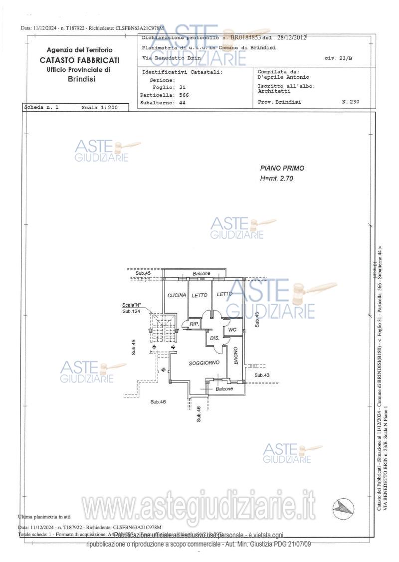 Vendita all'asta Senza incanto - LOTTO 1: Quota di 1000/1000 del diritto di proprietà di un appartamento destinato a civile abitazione sita in Brindisi alla Via Benedetto Brin al civico 23/b a piano primo scala N (Fog.31 p.lla 566 sub 44) Box auto al piano seminterrato. (Fog.31 p.lla 566 Sub 76) Via Benedetto Brin ,23/b p.S1. Prezzo base € 200.343,25 (offerta minima € 150.260,00). Data vendita 09/04/2026 ore 11:30. Rif. Ente Ministero delle Imprese e del Made in Italy - Liquidazione coatta n. 193/2024