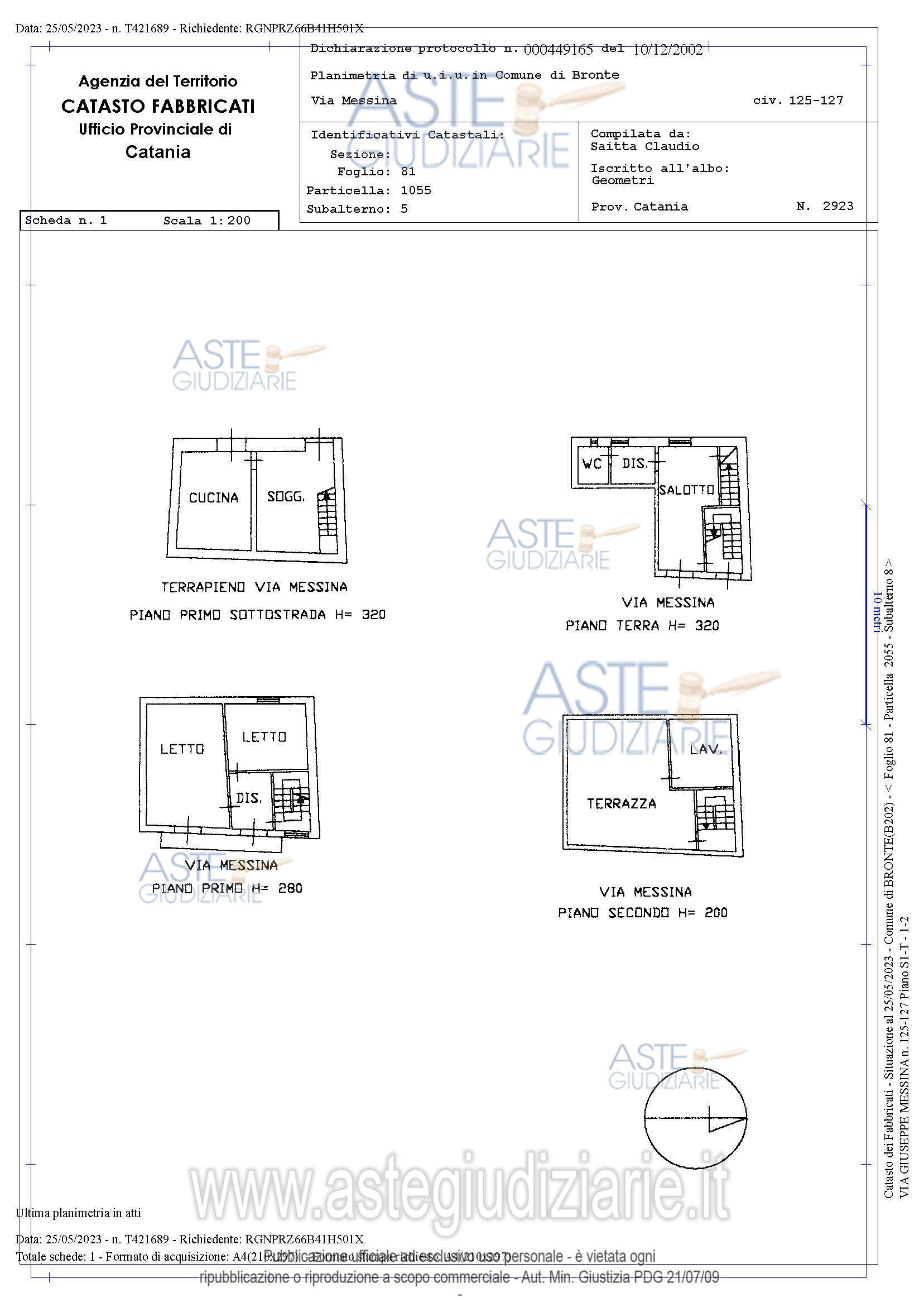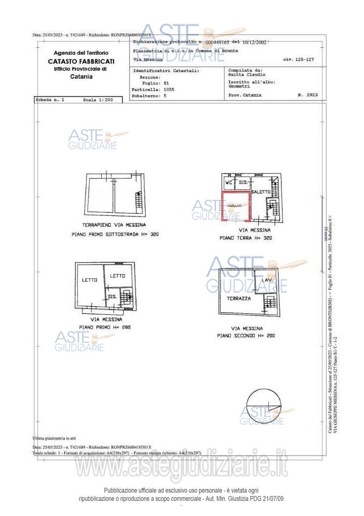 Vendita all'asta Senza incanto, con gara telematica sincrona mista - LOTTO UNICO: LOTTO UNICO Fabbricato per civile abitazione sito in Bronte (CT) Via Messina nn. 123-125-127, articolato su quattro livelli (piani sottostrada, terra, primo e secondo), costituito al piano sottostrada da due vani e servizio, di circa mq 43,91, al piano terra da un garage, di circa mq 15,08, un vano, servizio e ripostiglio, di circa mq 36,12, al piano primo da un due vani e accessori, di circa mq 51,20, al piano secondo da una lavanderia di circa mq 17,15 e un’ampia terrazza di circa mq 30,00. Prezzo base € 24.750,00 (offerta minima € 18.562,50). Data vendita 19/05/2026 ore 10:00. Professionista delegato alla vendita Avv. Massimo Bongiovanni - Email "studiolegale.bongiovanni@gmail.com"; Tel. 095388875. Custode Giudiziario Avv. Massimo Bongiovanni - Email "studiolegale.bongiovanni@gmail.com"; Tel. 095388875. Rif. Tribunale di Catania - Esecuzione immobiliare post legge 80 n. 472/2020