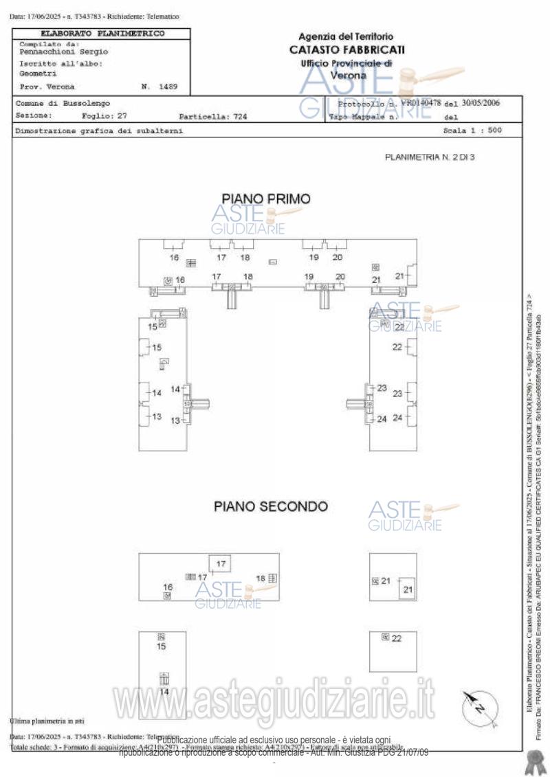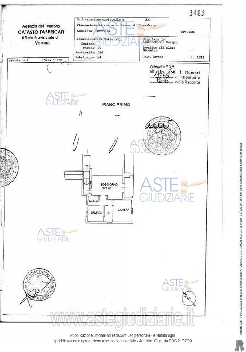 Vendita all'asta Senza incanto, con gara telematica sincrona mista - LOTTO UNICO: LOTTO UNICO - In Comune di Bussolengo (VR), Via Erino Girelli n°23, in Condominio "Tre Corti", piena proprietà di appartamento al piano primo e di autorimessa al piano interrato. Sono compresi i proporzionali diritti di comproprietà su enti e spazi comuni (art. 1117 c.c.), ivi compresa l’area di sedime e pertinenza del fabbricato, in particolare la scala (sub 58), lo scivolo delle autorimesse e la corsia di manovra interrata (subb. 52- 59) e l’ampia corte comune visibile al piano terra (sub. 51). Prezzo base € 98.426,12 (offerta minima € 73.819,59). Data vendita 16/07/2026 ore 14:00. Giudice: Francesco Fontana.