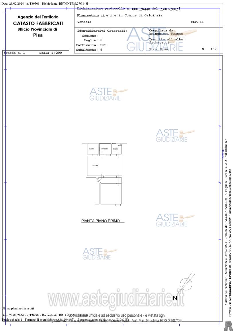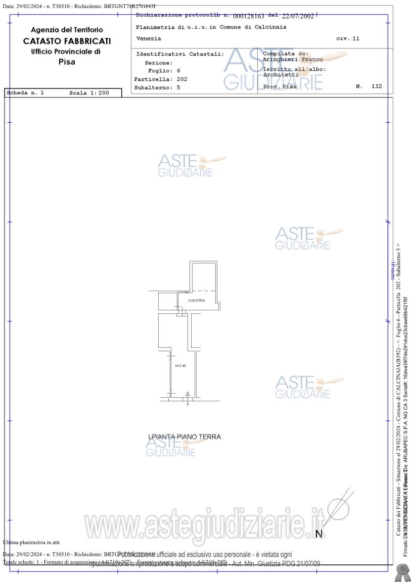 Vendita all'asta Senza incanto, con gara telematica asincrona - LOTTO UNICO: appartamento sito in Via Venezia n. 9-11, piano T-1 - Calcinaia (PI), con accesso da Via Venezia sia tramite un vano scala comune sia con accesso diretto, composto al piano terreno da soggiorno, cucina/pranzo, bagno, rip./sottoscala e locale di sgombero mentre il piano primo, accessibile sia tramite scala interna che tramite ulteriore accesso dal vano scala condominiale, da disimpegno, cucina, n. 3 camere e bagno. Prezzo base € 33.750,00 (offerta minima € 25.312,50). Data inizio operazioni di vendita: 30/10/2025 ore 11:00. Professionista delegato alla vendita Dott. Mario Pieri - Email "mario@studiomariopieri.it"; Cell. 3356167912; Tel. 05711735094. Custode Giudiziario Dott. Cosimo Erriquez - Email "ivgpisa@astagiudiziaria.com"; Cell. 3468748140; Tel. 050554790. Rif. Tribunale di Pisa - Espropriazione immobiliare (cartabia) n. 174/2023