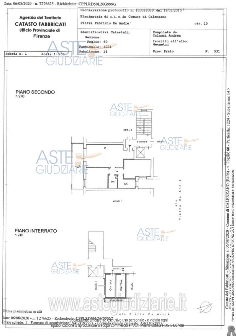 Vendita all'asta Competitiva - LOTTO 1: LOTTO A: appartamento in Calenzano, Piazza De Andrè n. 10, al piano secondo e composto da soggiorno con angolo cottura, disimpegno, due bagni, due camere e terrazzo a loggia. Sono pertinenza due cantine ed una autorimessa posti al piano seminterrato. L'offerente dovrà dichiarare di possedere i requisiti richiesti per i beneficiari degli alloggi di edilizia agevolata. Prendere visione dei documenti pubblicati. Si rende noto che la procedura ha già ricevuto un'offerta irrevocabile di acquisto. Prezzo base € 158.775,00 (offerta minima € 158.775,00). Data vendita 14/05/2026 ore 10:00. Giudice Dott. Enrico Capanna. Professionista delegato alla vendita Not. Laura Biagioli - Email "studio@notaiobiagioli.it"; Tel. 0574592532. Curatore Stefano Conti - Email "dott.conti@studioccpf.it"; Tel. 0574564993. Rif. Tribunale di Prato - Fallimentare (nuovo rito) n. 24/2020