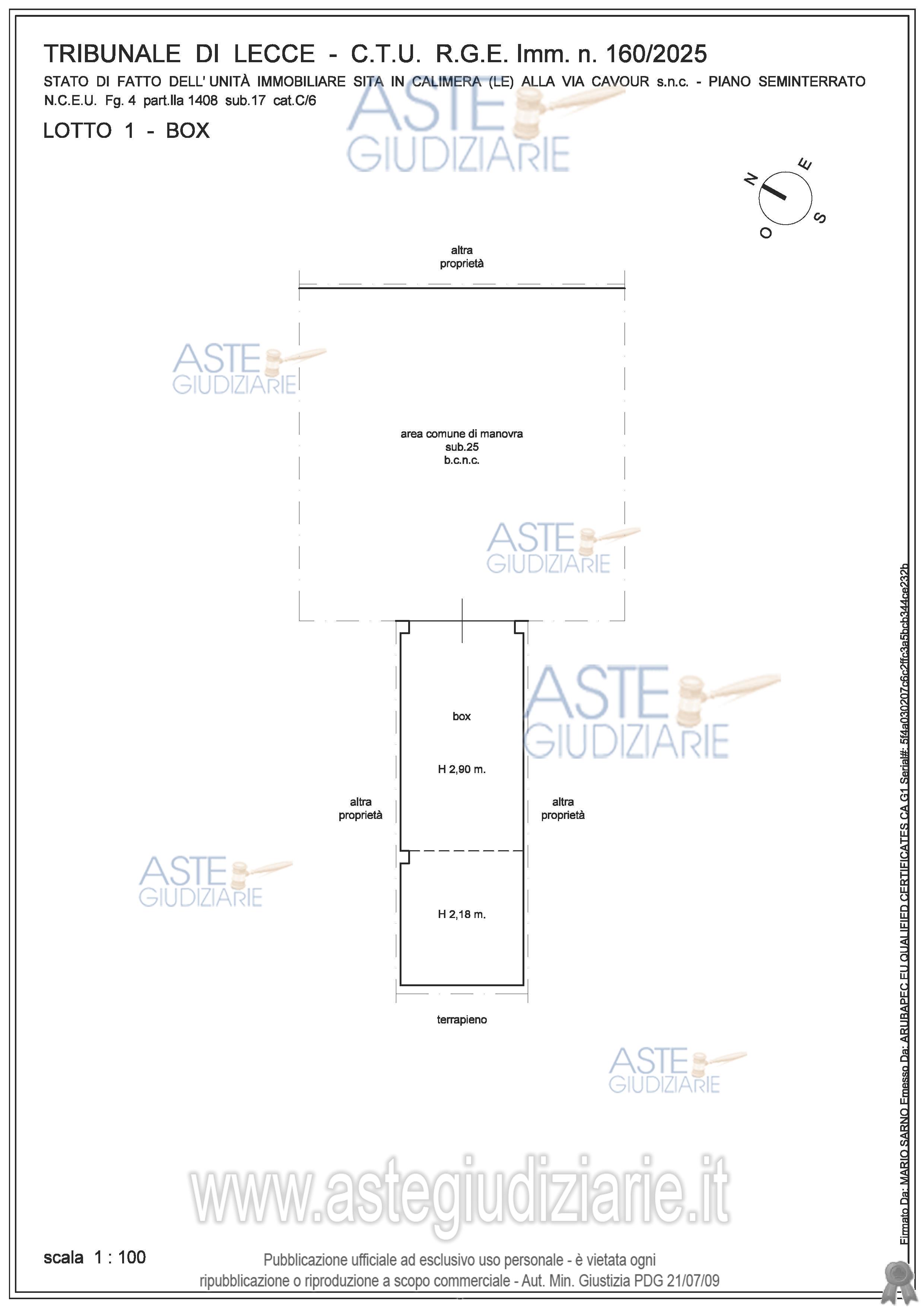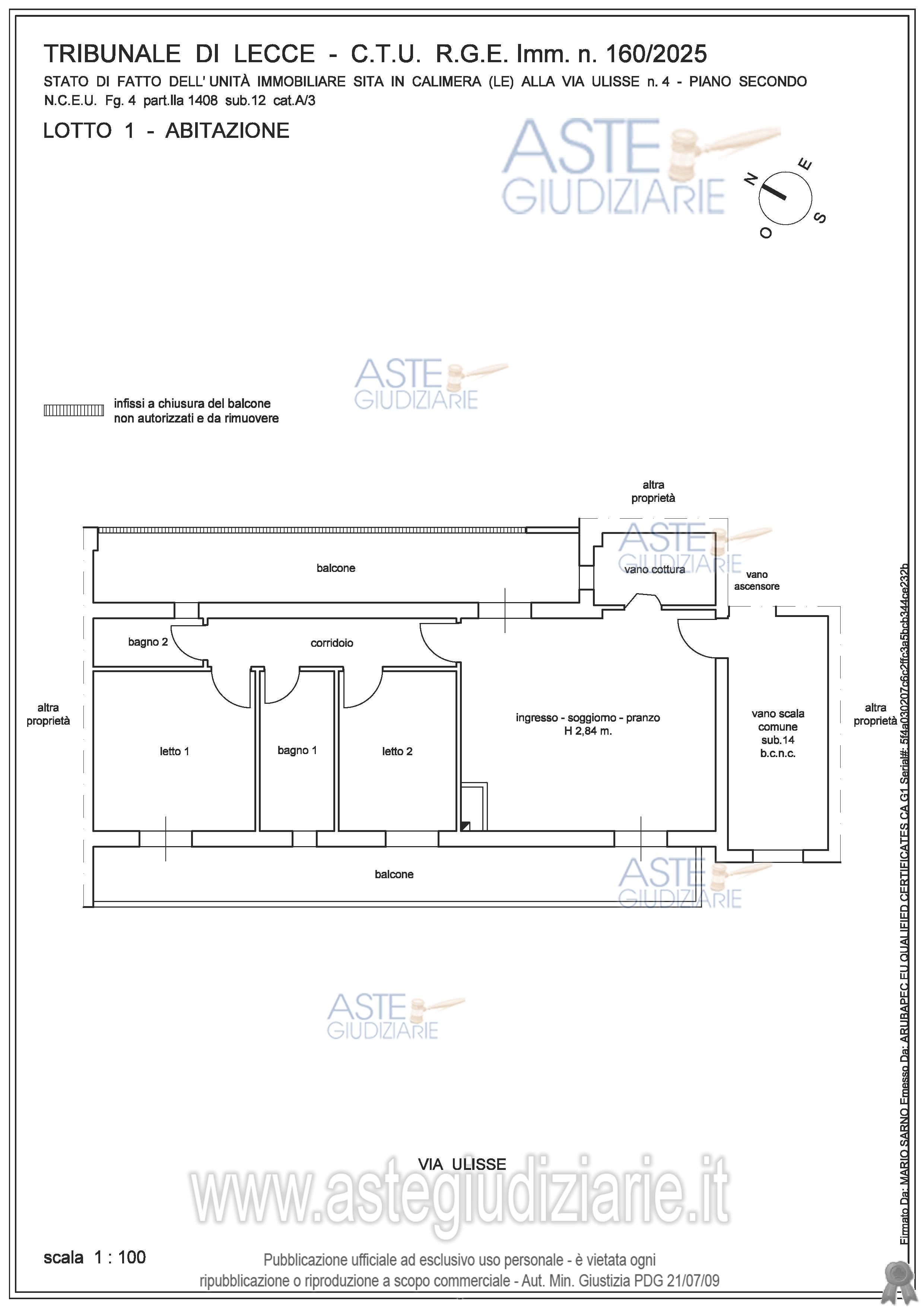 Vendita all'asta Senza incanto, con gara telematica asincrona - LOTTO UNICO: Piena proprietà per la quota di 1000/1000 di appartamento con box singolo sito in CALIMERA alla via Ulisse n.4 e via Cavour snc, della superficie commerciale di 101,24 mq. Prezzo base € 62.500,00 (offerta minima € 46.875,00). Data inizio operazioni di vendita: 28/05/2026 ore 12:30. Professionista delegato alla vendita Avv. Bianca Maria Sanasi D'arpe - Email "sanasibianca@libero.it"; Cell. 3388436477. Custode Giudiziario Avv. Bianca Maria Sanasi D'arpe - Email "sanasibianca@libero.it"; Cell. 3388436477. Rif. Tribunale di Lecce - Espropriazione immobiliare (cartabia) n. 160/2025