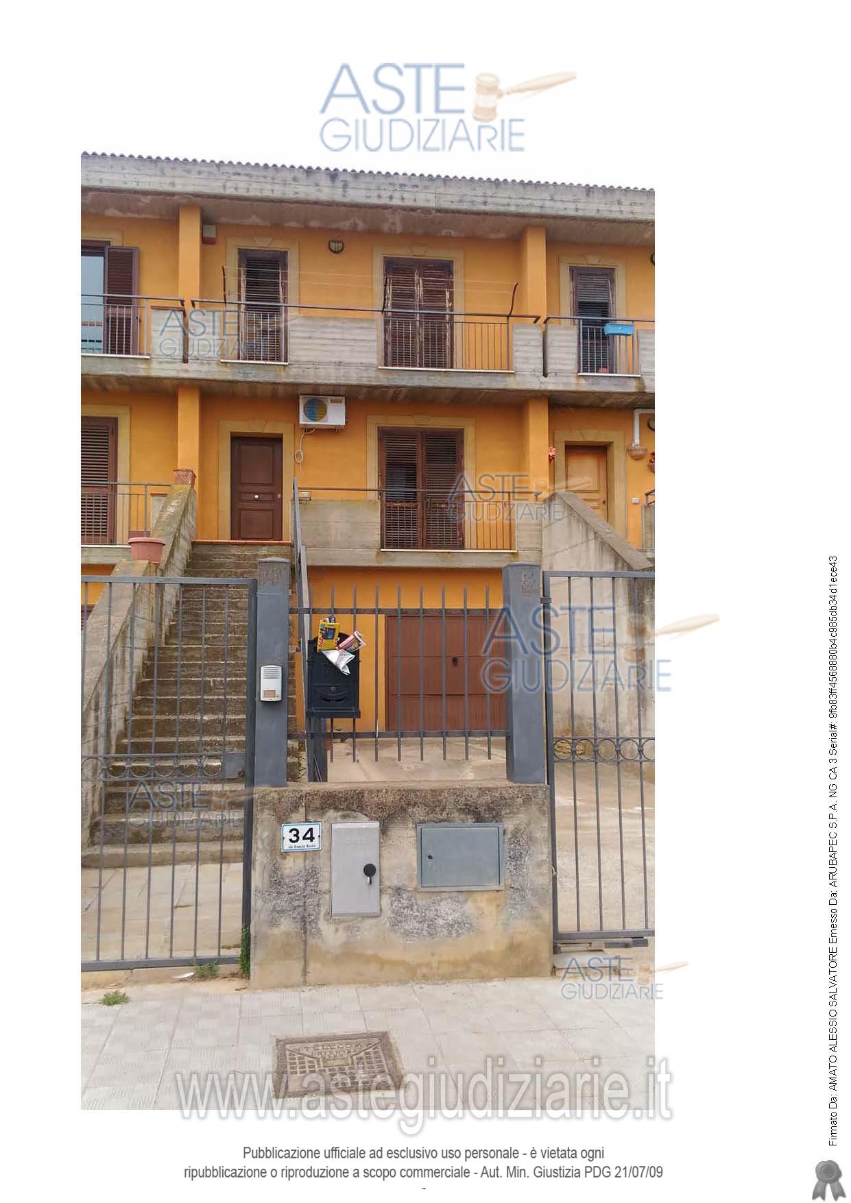 Vendita all'asta Senza incanto, con gara telematica sincrona mista - LOTTO UNICO: Proprietà superficiaria su alloggio unifamiliare in villetta a schiera, censita al Catasto dei Fabbricati in Caltagirone Fg. 161 p.lla 1064 sub. 2 cat. A/2, cl. 3, vani 8, Rendita € 413,17 piano S1 – T – 1, in Caltagirone, via E. Basile n. 34, c.da Boschigliolo – Largo Ballone, periferia sud del centro abitato, sup. coperta di mq 68,00 circa, distribuito su tre livelli. Prezzo base € 64.736,71 (offerta minima € 48.552,53). Data vendita 04/03/2026 ore 10:30. Giudice Agata Maria Patrizia Cavallaro. Professionista delegato alla vendita Avv. Graziella Randazzo - Email "graziellarandazzo@libero.it"; Cell. 3386143968; Tel. 0933339751. Custode Giudiziario Avv. Graziella Randazzo - Email "graziellarandazzo@libero.it"; Cell. 3386143968; Tel. 0933339751. Rif. Tribunale di Caltagirone - Esecuzione immobiliare post legge 80 n. 39/2016