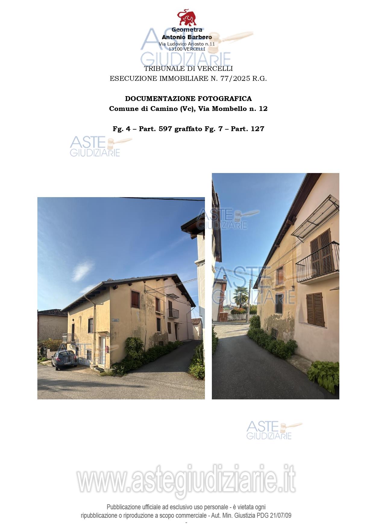 Vendita all'asta Senza incanto, con gara telematica asincrona - LOTTO UNICO: Immobile di civile abitazione con corte e terreni agricoli attigui, sito in Camino (AL), via Mombello n. 12. Prezzo base € 27.000,00 (offerta minima € 20.250,00). Data inizio operazioni di vendita: 15/06/2026 ore 09:30. Professionista delegato alla vendita Avv. Elena Boccadoro - Email "elena.boccadoro@gmail.com"; Tel. 0161255128. Custode Giudiziario Avv. Elena Boccadoro - Email "elena.boccadoro@gmail.com"; Tel. 0161255128. Rif. Tribunale di Vercelli - Espropriazione immobiliare (cartabia) n. 77/2025