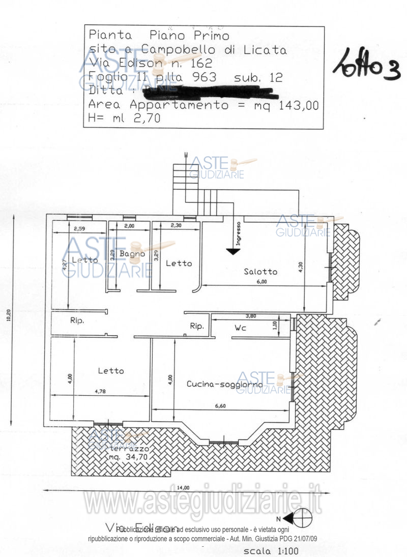 Vendita all'asta Senza incanto, con gara telematica sincrona mista - LOTTO 3: Piena proprietà per la quota di 1000/1000 di appartamento sito in al piano primo composto da ingresso comunicante con ampio salotto, cucina-soggiorno con lavanderia, tre camere da letto, un bagno e due ripostigli. Prezzo base € 12.970,00 (offerta minima € 9.728,00). Data vendita 11/03/2026 ore 09:30. Giudice Matteo De Nes. Professionista delegato alla vendita Avv. Irene Fragapani. Custode Giudiziario Avv. Irene Fragapani - Email "irene.fragapani@libero.it". Rif. Tribunale di Agrigento - Esecuzione immobiliare post legge 80 n. 31/2021