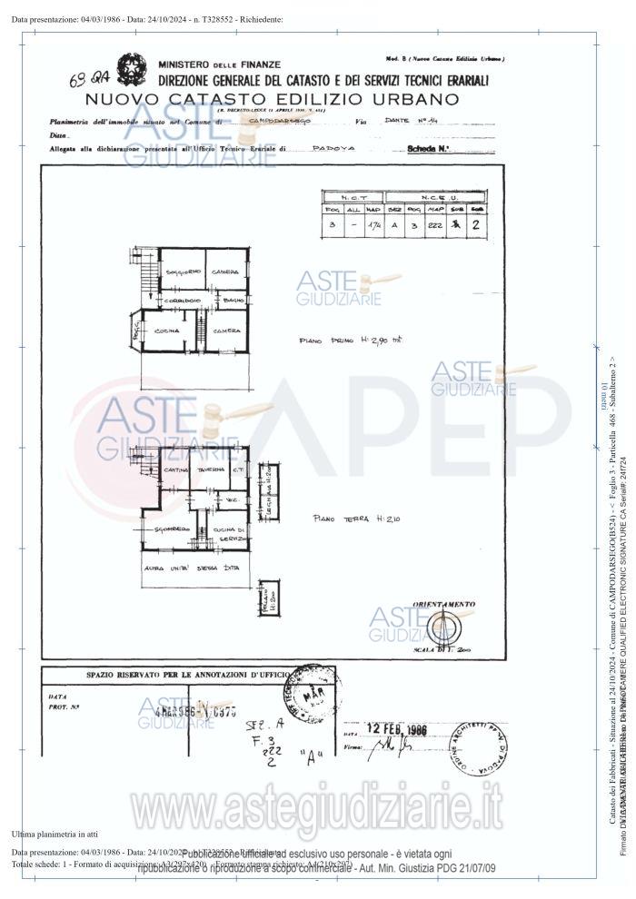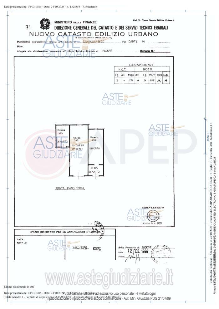 Vendita all'asta Senza incanto, con gara telematica sincrona - LOTTO UNICO: Lotto Unico - piena proprietà di abitazione con deposito/ricovero attrezzi siti in Comune di Campodarsego (PD), via D. Alighieri n. 14 e precisamente trattasi di fabbricato unifamiliare su due piani fuori terra, da ristrutturare, con garage al piano terra della superficie complessiva di mq. 189 e un deposito/ricovero attrezzi in distacco, da demolire, per una cubatura disponibile di mc. 589, il tutto insistente sua area coperta e scoperta esclusiva di catastali mq. 880. Occupato. Prezzo base € 142.000,00 (offerta minima € 106.500,00). Data vendita 17/02/2026 ore 10:00. Giudice Rossi. Professionista delegato alla vendita Not. Mario Caracciolo - Email "aste@apepnotai.it"; Tel. 049651228. Custode Giudiziario Apep - Email "visita@apepnotai.it"; Tel. 049651228. Rif. Tribunale di Padova - Espropriazione immobiliare (cartabia) n. 126/2024