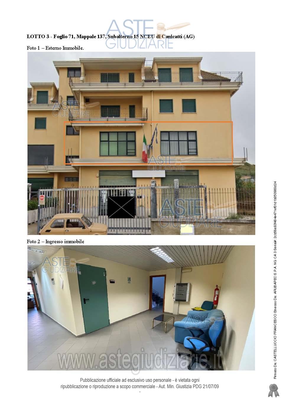 Vendita all'asta Senza incanto, con gara telematica sincrona mista - LOTTO 3: Piena proprietà per la quota di 1000/1000 di ufficio sito in Canicattì (Agrigento),Via Armando Diaz n.35. Composto da: n. 7 vani adibiti ad ufficio - n. 1 vano adibito a localeserver - n. 3 vani adibiti a ripostiglio- n. 1 ingresso - n.5 wc con antibagno - n.1 wc disabili - n.1corridoio di collegamento tra i vani. Posto al piano primo sviluppa una superficie lordacomplessiva di circa mq 506,40. Prezzo base € 345.706,50 (offerta minima € 259.280,00). Data vendita 28/04/2026 ore 17:00. Giudice Luigi Vivacqua. Professionista delegato alla vendita Alessandra Balistreri. Custode Giudiziario Avv. Alessandra Balistreri - Email "ale.balistreri@gmail.com"; Cell. 3888708298. Rif. Tribunale di Agrigento - Esecuzione immobiliare post legge 80 n. 105/2023