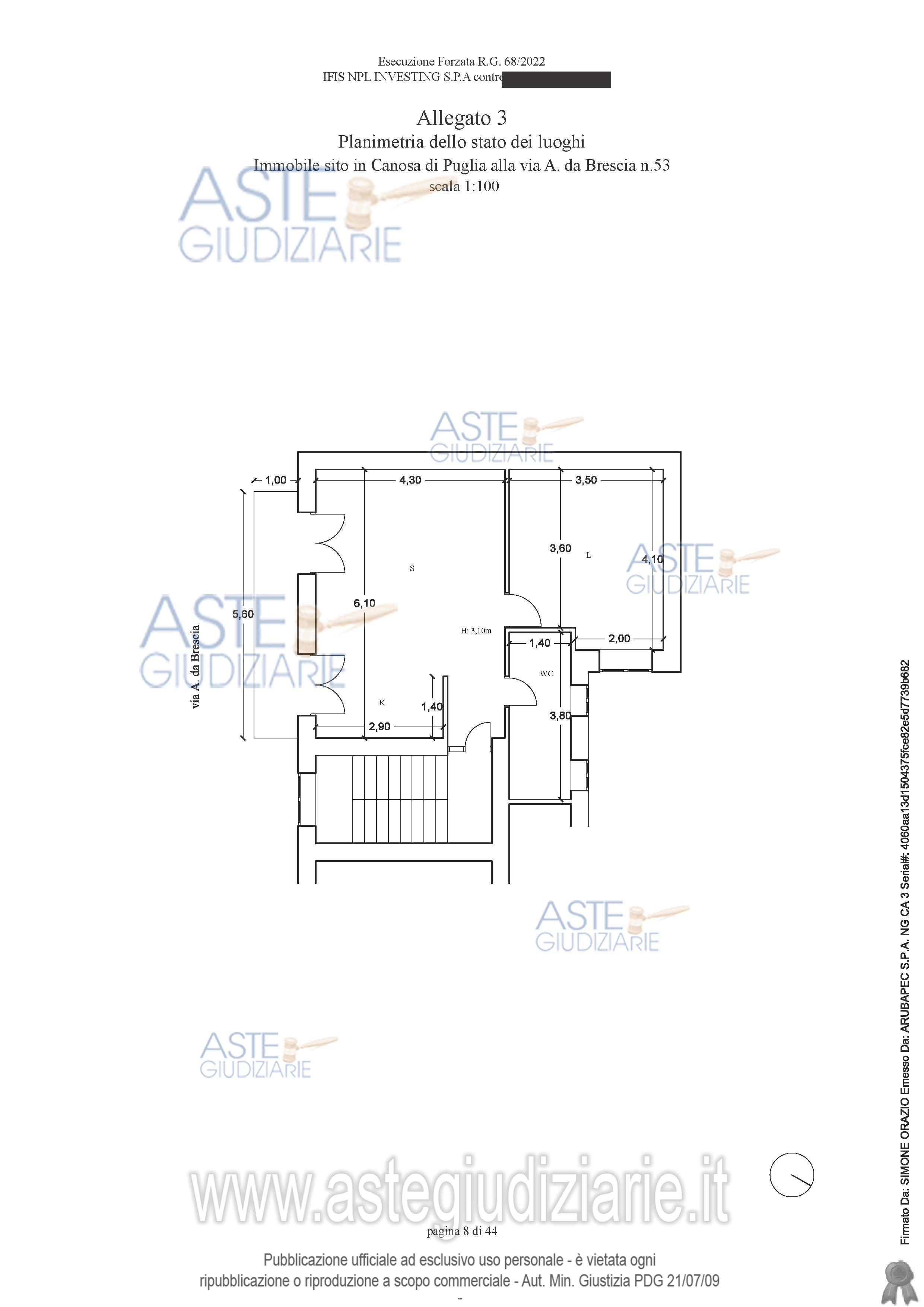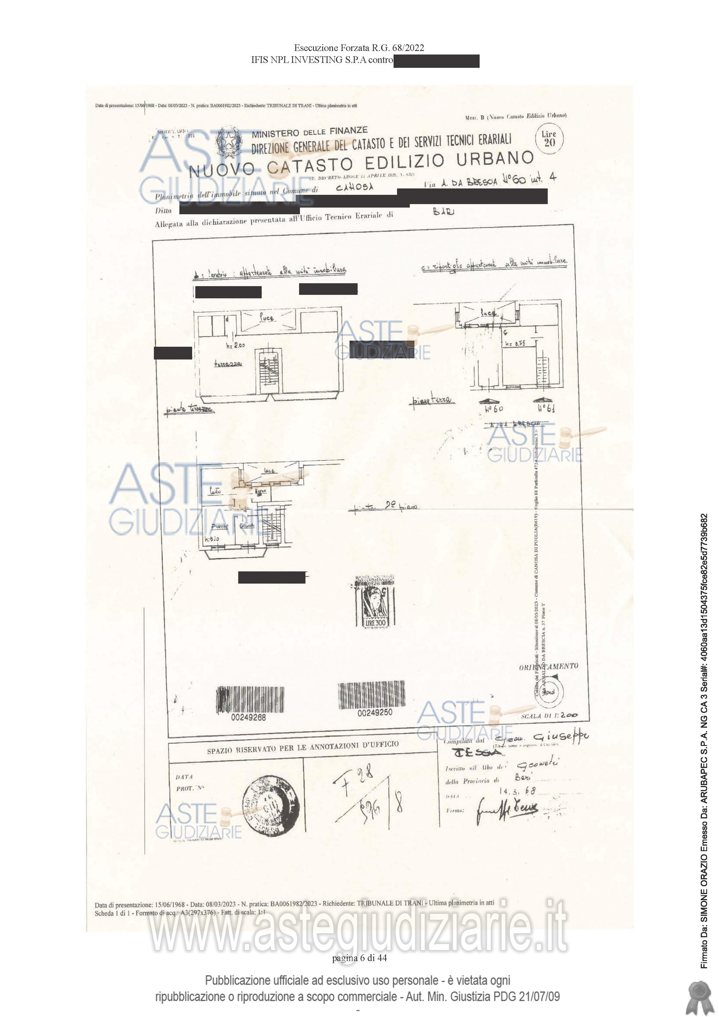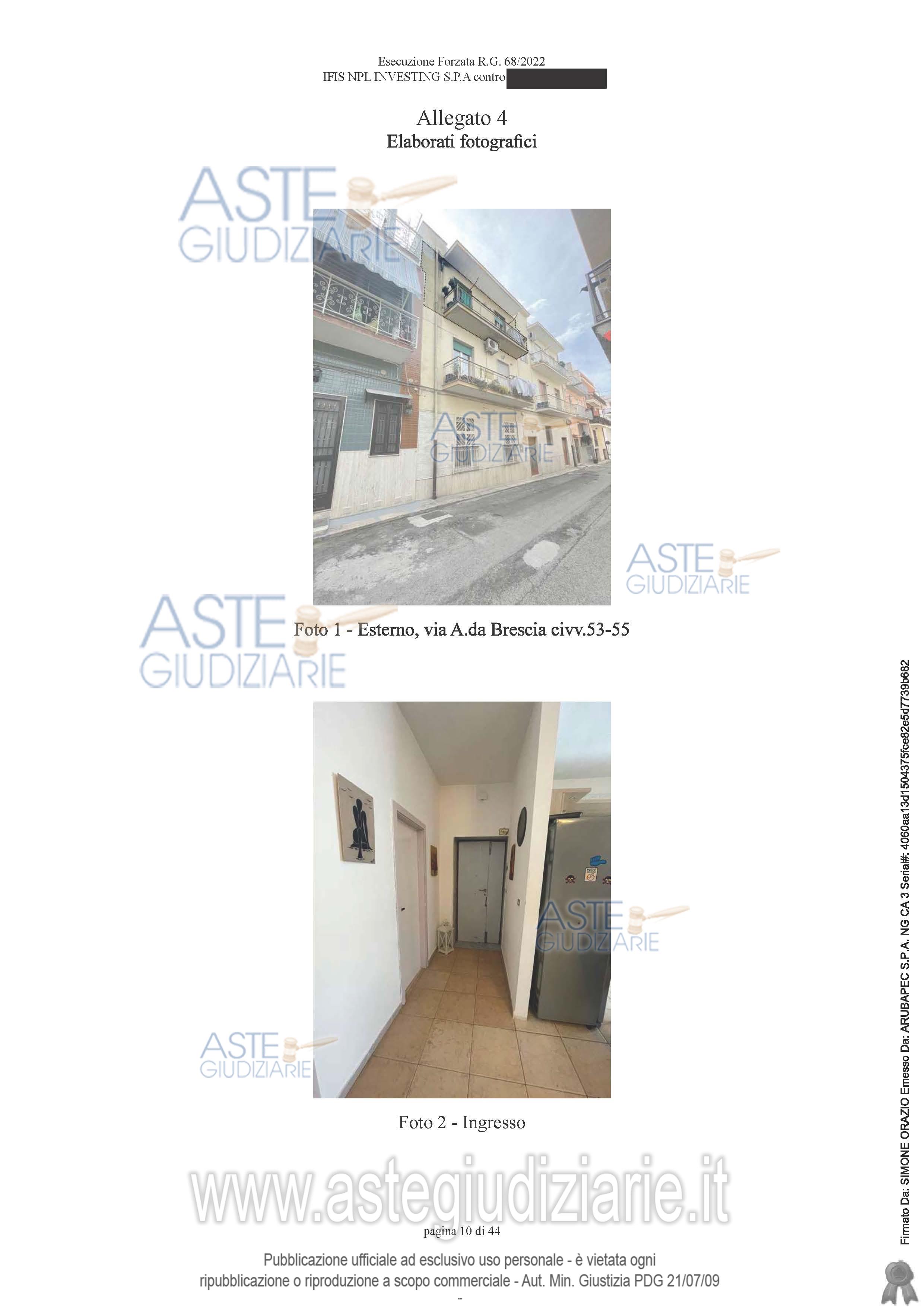 Vendita all'asta Senza incanto, con gara telematica sincrona - LOTTO UNICO: Piena proprietà per la quota di 1/1 di appartamento in Canosa di Puglia alla Via Arnaldo da Brescia n.53, secondo piano, della superficie lorda di mq.73,10 nonchè piena proprietà per la quota di 1/1 di locale a piano terra in Canosa di Puglia alla Via Arnaldo da Brescia n.55 della superficie lorda di mq.9,60. Prezzo base € 36.763,12 (offerta minima € 27.572,34). Data vendita 22/01/2026 ore 10:30. Giudice Diletta Calò. Professionista delegato alla vendita Avv. Cosimo Marzocca - Email "cosimo.marzocca@ordineavvocatitrani.it". Custode Giudiziario Avv. Cosimo Marzocca - Email "cosimo.marzocca@ordineavvocatitrani.it". Rif. Tribunale di Trani - Esecuzione immobiliare post legge 80 n. 68/2022