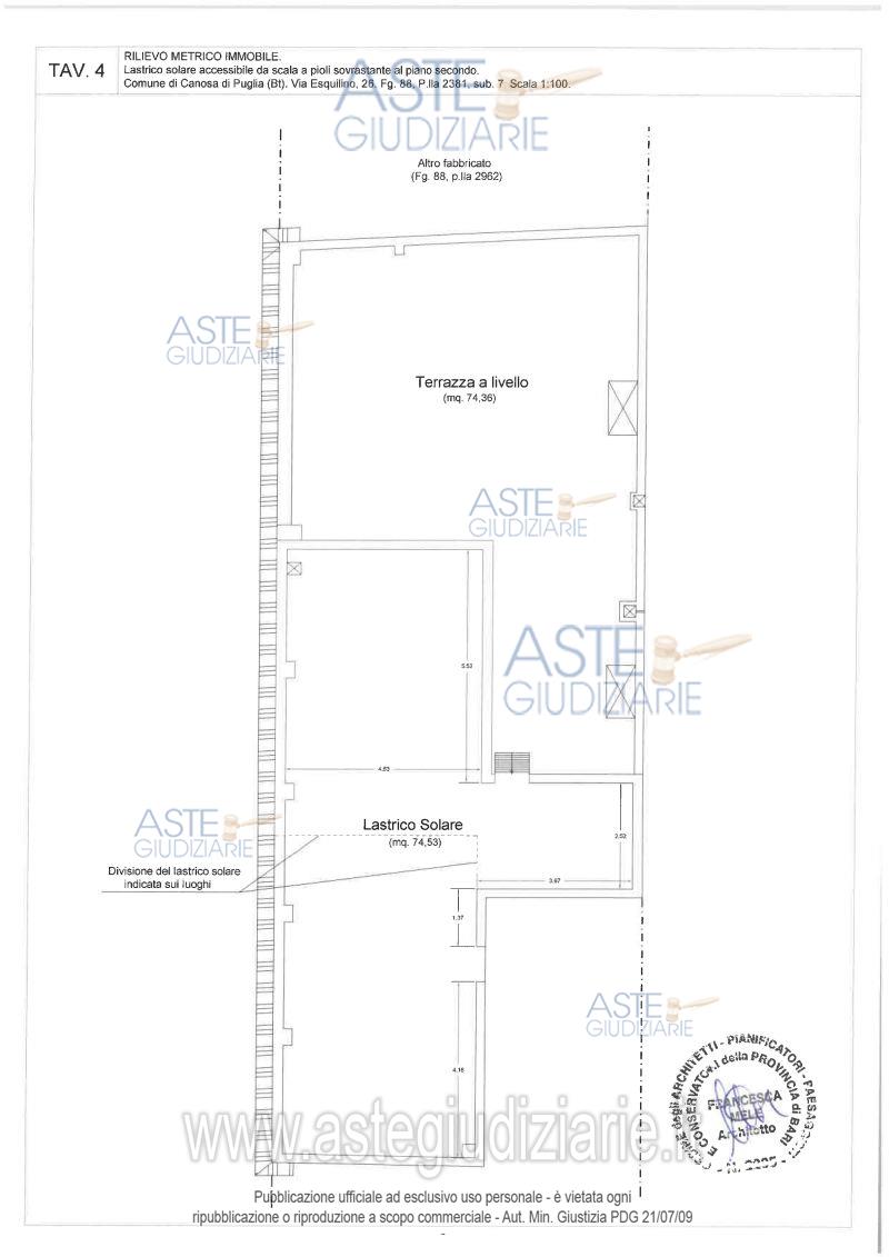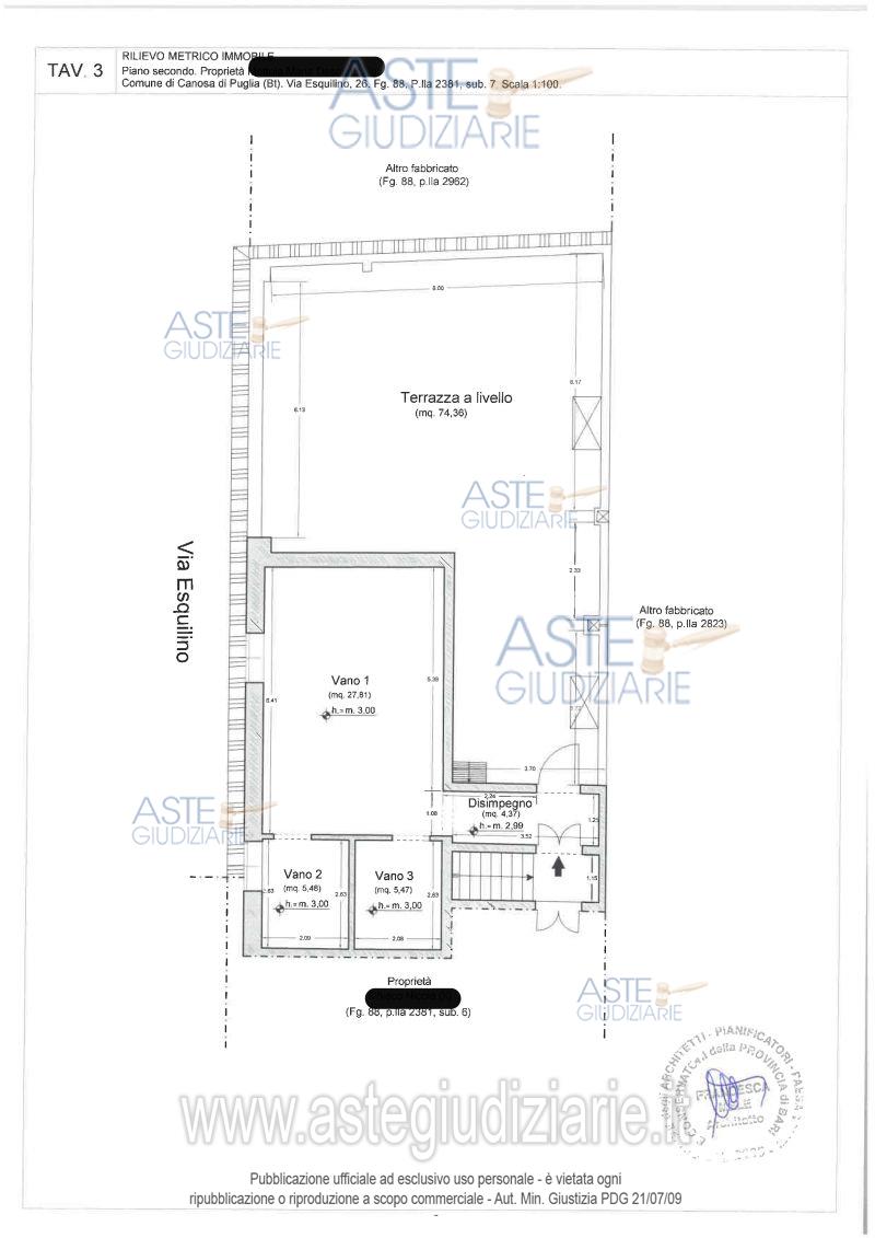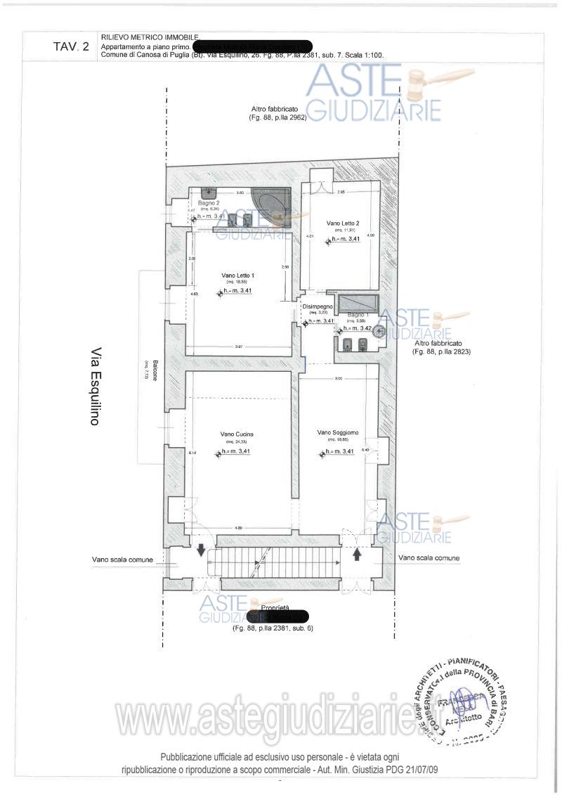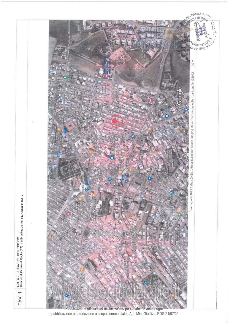 Vendita all'asta Senza incanto, con gara telematica sincrona - LOTTO 2: Piena proprietà per la quota di 1000/1000 dell’appartamento ubicato in Canosa di Puglia (BT) alla via Esquilino n. 26, piano 1-2. Identificato nel N.C.E.U. del Comune di Canosa di Puglia al foglio 88, particella 2381, subalterno 7, categoria A/3, classe 3^, vani 5,5, via Esquilino n. 26, piano 1-2, rendita euro 312,46. Prezzo base € 70.026,83 (offerta minima € 52.520,12). Data vendita 17/06/2026 ore 11:00. Professionista delegato alla vendita Dott. Giovanna Panzuto - Email "giovanna.panzuto@gmail.com". Custode Giudiziario Dott. Giovanna Panzuto - Email "giovanna.panzuto@gmail.com". Rif. Tribunale di Trani - Esecuzione immobiliare post legge 80 n. 54/2023