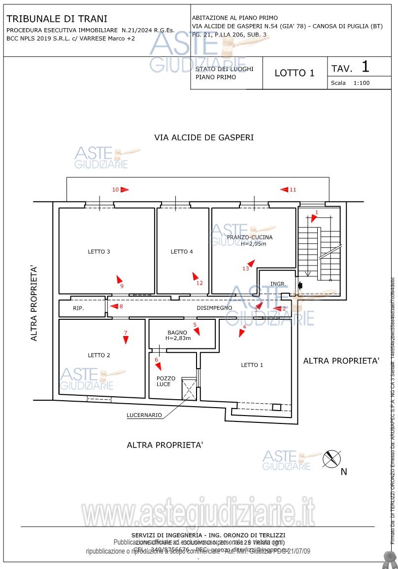 Vendita all'asta Senza incanto, con gara telematica sincrona - LOTTO UNICO: Piena proprietà dell'appartamento occupante l’intero primo piano (int. 01), del fabbricato al n.54 (già n. 78) di Via A. De Gasperi a Canosa di Puglia (BT), con porta a destra di chi salendo le scale giunge sul ballatoio, privo di ascensore, della superficie di circa 134,54 mq., altezza interna utile 2,95 metri, composto di ingresso, corridoio, soggiorno-pranzo con cucinino a vista, quattro camere da letto, un bagno, un ripostiglio, un grande balcone prospiciente la Via principale ed un pozzo luce interno. Prezzo base € 71.028,86 (offerta minima € 53.271,64). Data vendita 09/04/2026 ore 10:00. Giudice Francesca Pastore. Professionista delegato alla vendita Avv. Avv. Ruggiero Corvasce - Email "avvocatoruggierocorvasce@gmail.com"; Cell. 3495384679. Custode Giudiziario Avv. Avv. Ruggiero Corvasce - Email "avvocatoruggierocorvasce@gmail.com"; Cell. 3495384679. Rif. Tribunale di Trani - Espropriazione immobiliare (cartabia) n. 21/2024