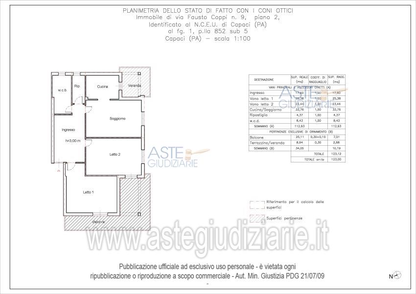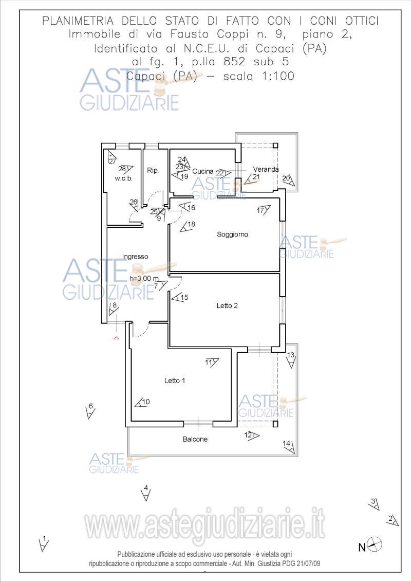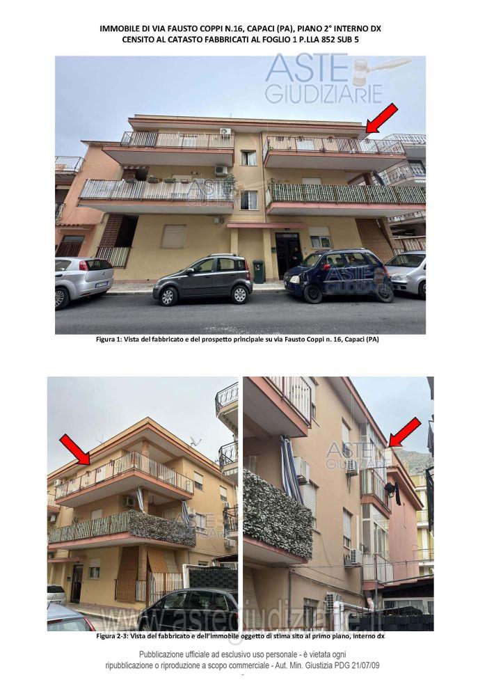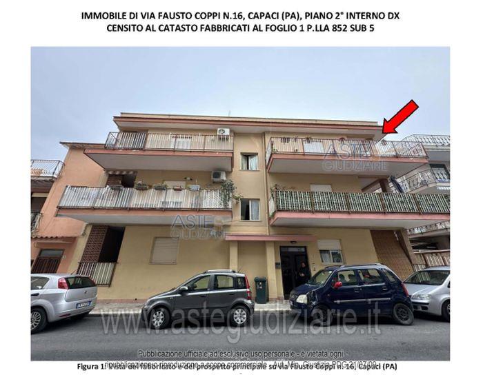 Vendita all'asta Senza incanto, con gara telematica sincrona mista - LOTTO UNICO: LOTTO UNICO: piena proprietà di un Appartamento sito in Capaci (PA) via Fausto Coppi 16, erroneamente indicato catastalmente al civ. 9, posto al piano secondo, interno dx, identificato al N.C.E.U. di Capaci al foglio 1 p.lla 852 sub.5 cat. A/4, classe 4, Consistenza 5,5, vani Superficie catastale totale 117 mq, totale escluse aree scoperte mq 109, rendita euro 187,47 confinante con via Fausto Coppi ad Ovest, con scala condominiale e con proprietà aliena a Nord, con area libera a Sud e ad Est. Prezzo base € 85.000,00 (offerta minima € 63.750,00). Data vendita 27/03/2026 ore 10:30. Professionista delegato alla vendita Avv. Giovanni Rizzo - Email "giovanni_rizzo@hotmail.it"; Tel. 0917910068. Custode Giudiziario Avv. Giovanni Rizzo - Email "giovanni_rizzo@hotmail.it"; Tel. 0917910068. Rif. Tribunale di Palermo - Esecuzione immobiliare post legge 80 n. 6/2022