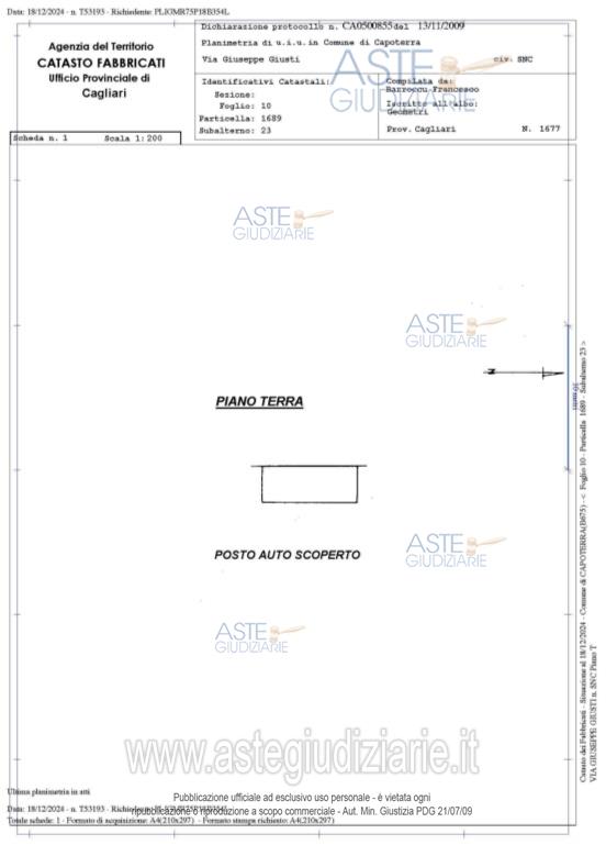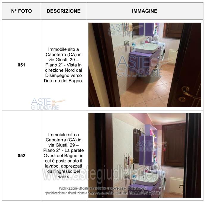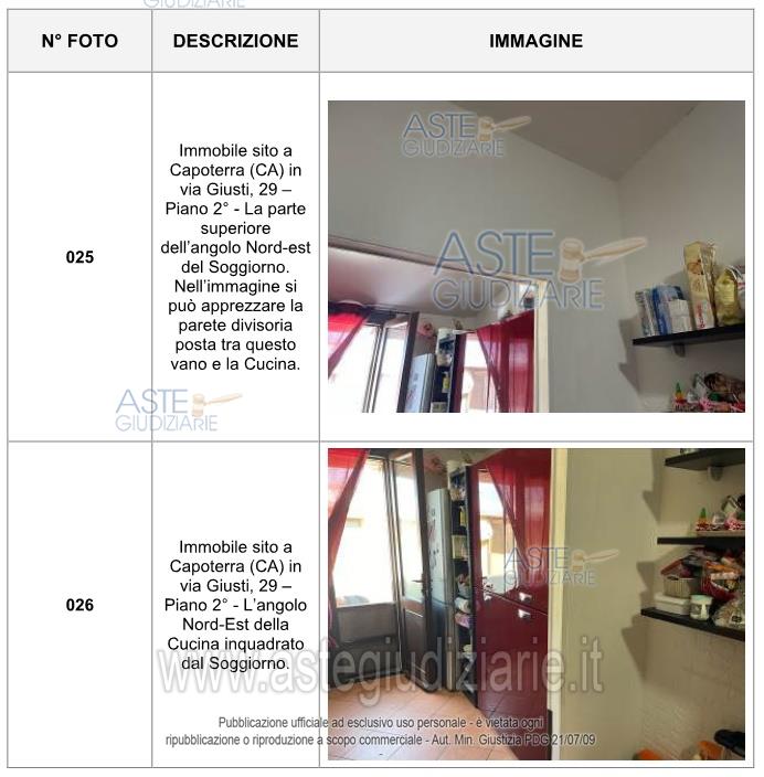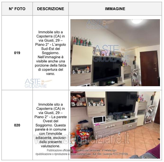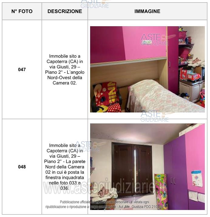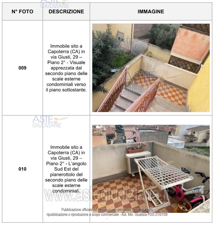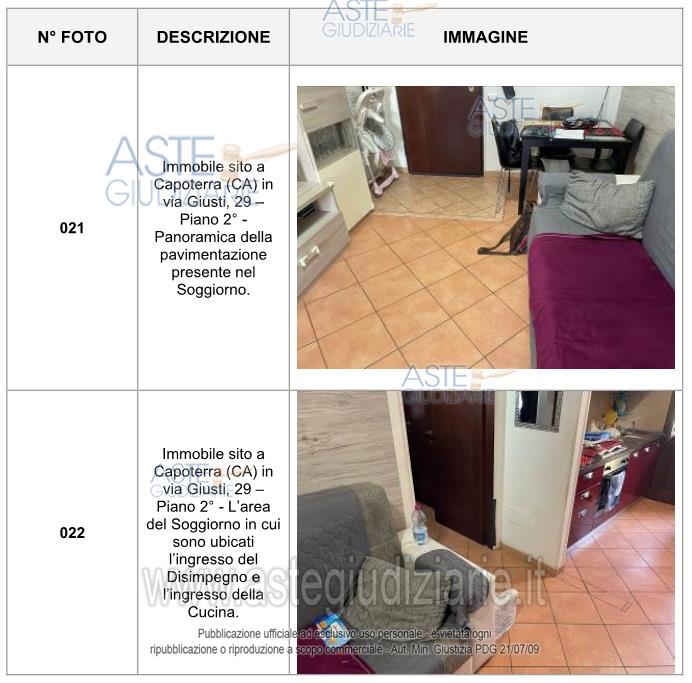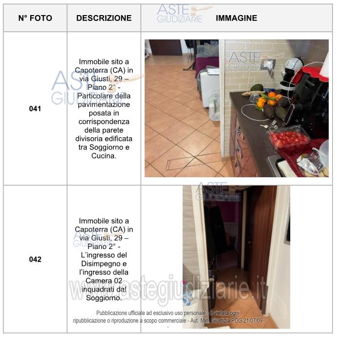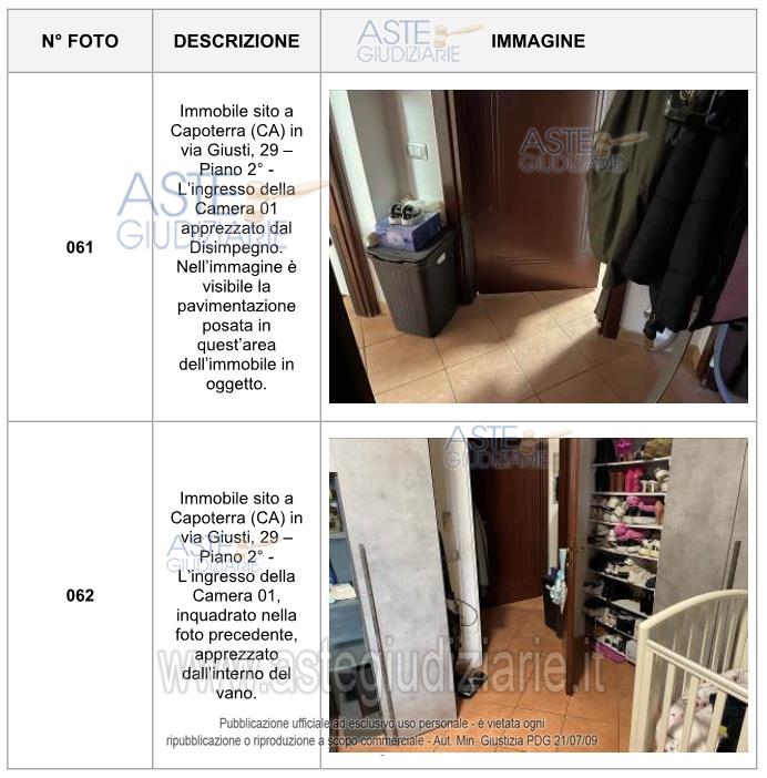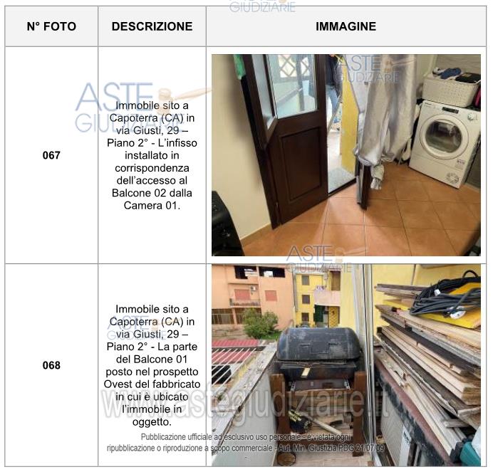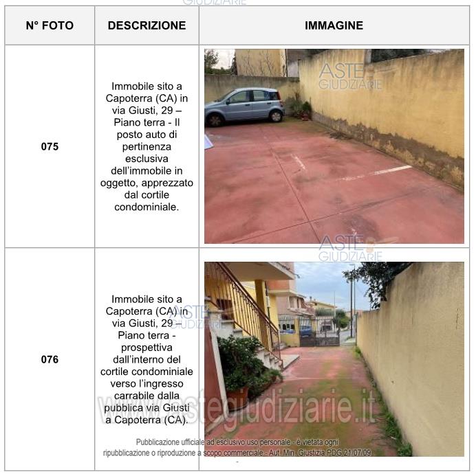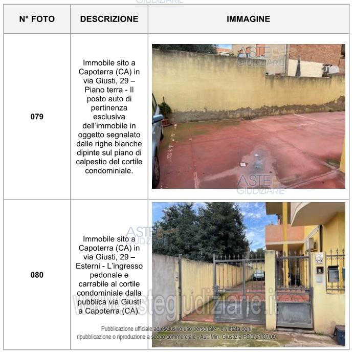 Vendita all'asta Senza incanto, con gara telematica asincrona - LOTTO UNICO: Quota pari a 1/1 del diritto di proprietà sull’immobile in comune di Capoterra (CA), via Giusti n°29, immobile ad uso abitazione di tipo economico posto al piano secondo, distinto nel Catasto Fabbricati del predetto Comune al foglio 10, particella 1689, sub. 31, cat. A/3, classe 3, consistenza 4 vani, superficie catastale totale 67 mq, nonché posto auto scoperto al piano terra, distinto nel Catasto Fabbricati al foglio 10, particella 1689, sub. 23, cat. C/6, classe 1, superficie catastale totale 17 mq. Prezzo base € 93.730,00 (offerta minima € 70.297,50). Data inizio operazioni di vendita: 11/12/2025 ore 15:30. Professionista delegato alla vendita Rag. Matteo Deidda Gagliardo - Email "matteo.deiddagagliardo@gmail.com"; Tel. 070501685. Custode Giudiziario Ivg Cagliari - Email "ivg.visiteimmobili@tiscali.it"; Tel. 0702299036. Rif. Tribunale di Cagliari - Espropriazione immobiliare (cartabia) n. 208/2024