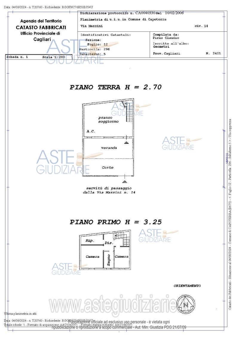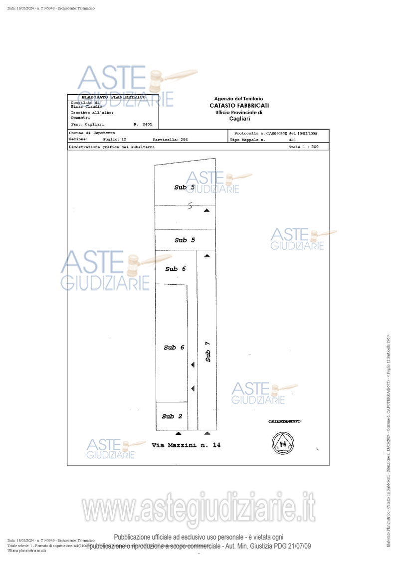Vendita all'asta Senza incanto, con gara telematica asincrona - LOTTO UNICO: Quota pari ad 1/1 del diritto di proprieta` della unita` immobiliare indipendente sita nel Comune di Capoterra (CA), Via Mazzini n. 19, (pur se nella visura catastale e nella C.E. risulta al n. 14), in una zona centrale e residenziale del Comune di Capoterra, anche se non ricadente in centro storico, piani terra e primo, distinta al N.C.E.U. al Foglio 12, Mappale 554, sub 5, Categoria A/2 Classe 5, consist. 5,5 vani, superficie catastale totale 129 mq (totale escluse aree scoperte 118 mq), Rendita € 397,67. Prezzo base € 132.400,00 (offerta minima € 99.300,00). Data inizio operazioni di vendita: 08/04/2026 ore 17:00. Giudice Valentina Frongia. Professionista delegato alla vendita Avv. Maria Paola Nieddu - Email "avv.nieddumpaola@libero.it"; Cell. 3476865052; Tel. 070531974. Custode Giudiziario Ivg Cagliari - Email "ivg.visiteimmobili@tiscali.it"; Tel. 0702299036. Rif. Tribunale di Cagliari - Espropriazione immobiliare (cartabia) n. 195/2023
