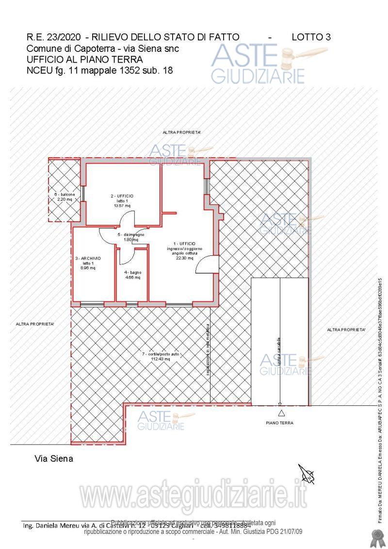 Vendita all'asta Senza incanto, con gara telematica asincrona - LOTTO 3: LOTTO 3: quota pari a 1/1 del diritto di PROPRIETA’ sull’appartamento uso ufficio sito a CAPOTERRA, piano terra, via Siena, identificati al NCEU, foglio 11, mappale 1352, subalterno 18, categ. A/3, Classe 2, vani 4, sup. catastale mq. 69, rendita euro 247,90. Prezzo base € 72.000,00 (offerta minima € 54.000,00). Data inizio operazioni di vendita: 19/05/2026 ore 16:00. Professionista delegato alla vendita Dott. Elena Loddo - Email "studioelenaloddo@gmail.com"; Tel. 0707967825. Custode Giudiziario Ivg Cagliari - Email "ivg.visiteimmobili@tiscali.it"; Tel. 0702299036. Rif. Tribunale di Cagliari - Esecuzione immobiliare post legge 80 n. 23/2020
