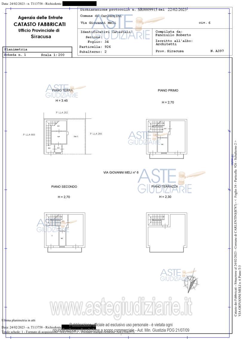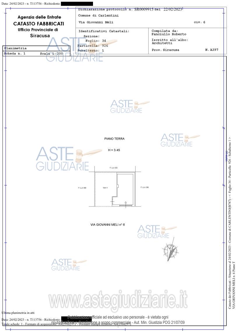 Vendita all'asta Senza incanto, con gara telematica sincrona mista - LOTTO UNICO: Intera proprietà di abitazione in Carlentini (SR), Via G. Meli n. 6 (recte n. 4), piano T-1, censita al N.C.E.U. del Comune di Carlentini al Fg. 34, p.lla 926, sub. 2, cat. A/4, consistenza 5,5 vani, superficie catastale totale 95,00 mq, totale escluse le aree scoperte 85,00 mq, con garage di pertinenza posto al piano terra del civico n. 6 della stessa via censito al N.C.E.U. del Comune di Carlentini al Fg. 34, p.lla 926, sub. 1, cat. C/6, consistenza 17 mq, superficie catastale 17 mq. Prezzo base € 36.393,75 (offerta minima € 27.295,31). Data vendita 21/01/2026 ore 11:00. Giudice Maria Cristina Di Stazio. Professionista delegato alla vendita Avv. Gabriele Galota - Email "galota.gabriele@gmail.com"; Tel. 09311562510. Rif. Tribunale di Siracusa - Contenzioso civile n. 311/2018