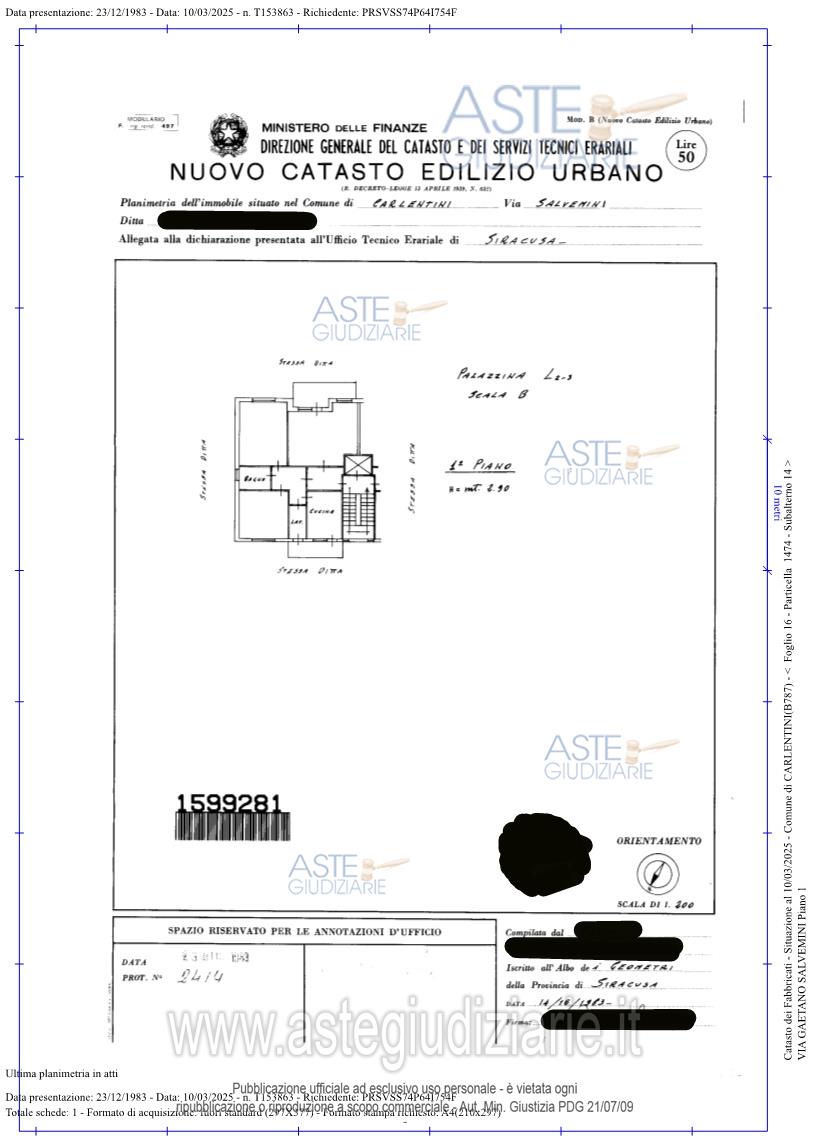 Vendita all'asta Senza incanto, con gara telematica sincrona mista - LOTTO 1: Piena ed intera proprietà di appartamento in Carlentini (SR), Via Gaetano Salvemini n. 9, piano 1, scala B, int. 4, Palazzina L2/3, in N.C.E.U. al foglio 16, p.lla 1474 sub 14, cat. A/3, cl. 3, consistenza 5,5 vani, superficie catastale totale mq 98 – totale escluse aree scoperte mq 94, R.C. € 340,86, Via Gaetano Salvemini piano 1, Classe Energetica “E”, giusta attestato di prestazione energetica del 24/07/2025, a firma dell’esperto stimatore. Prezzo base € 53.010,00 (offerta minima € 39.757,50). Data vendita 15/05/2026 ore 11:00. Giudice Giuseppe Solarino. Professionista delegato alla vendita Avv. Paolo Munafò - Email "avv.paolomunafo@mbcg.it"; Cell. 3387429274; Tel. 09311562510. Custode Giudiziario Avv. Paolo Munafò - Email "avv.paolomunafo@mbcg.it"; Cell. 3387429274; Tel. 09311562510. Rif. Tribunale di Siracusa - Espropriazione immobiliare (cartabia) n. 26/2024