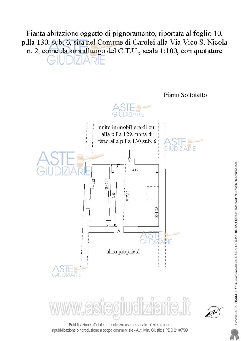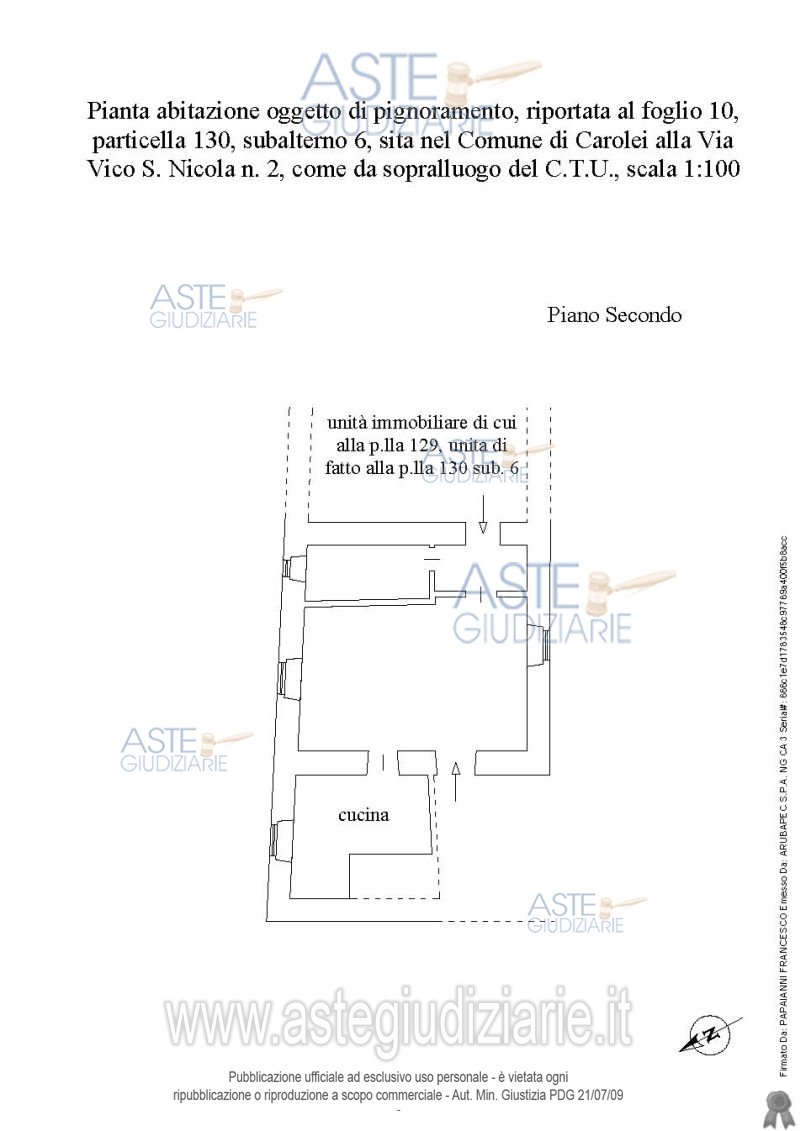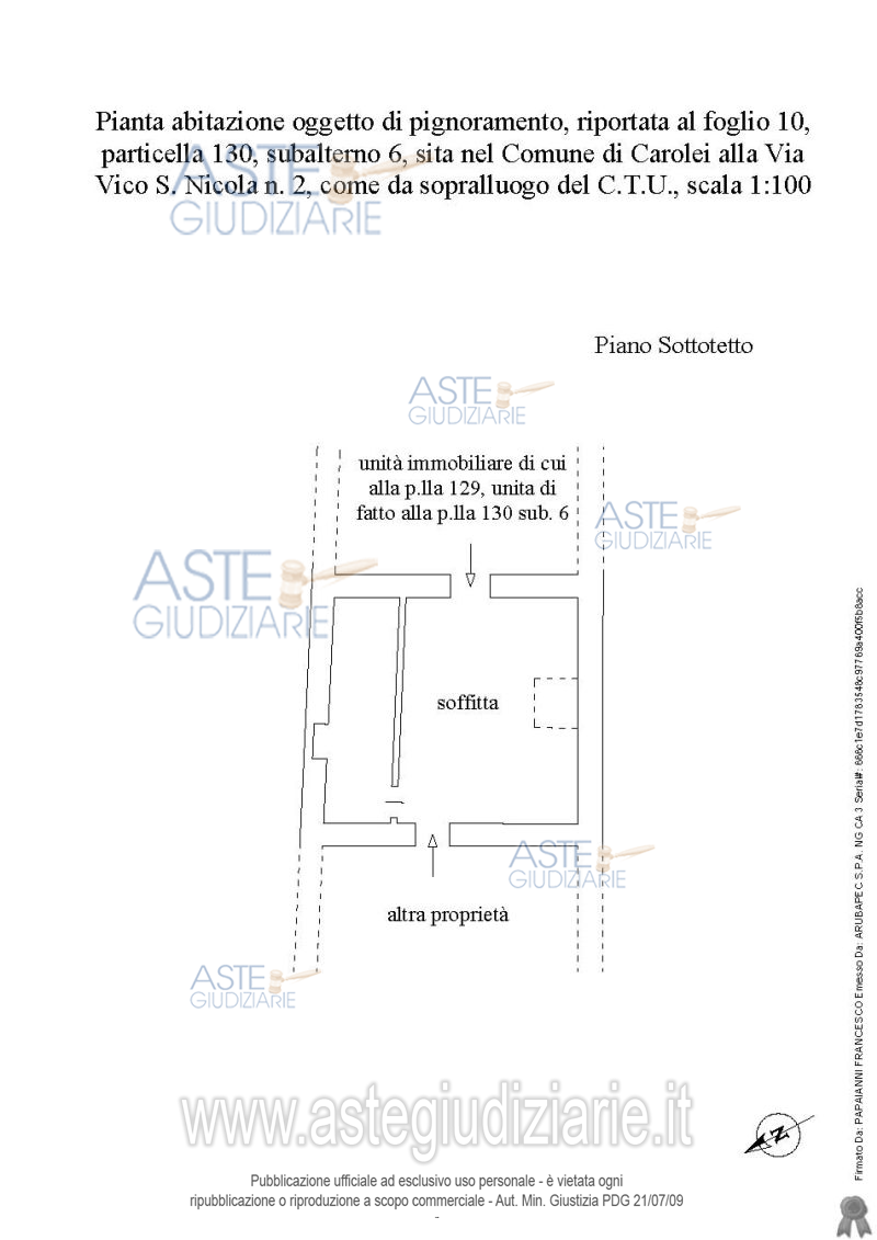 Vendita all'asta Senza incanto, con gara telematica sincrona - LOTTO 9: Piena proprietà bene pignorato riportato al foglio 10 p.lla 130 sub 6 sito in Carolei Via Vico San Nicola n.2 categoria A/5 di classe 2, piani secondo e sottotetto, rendita catastale euro 61,97, consistenza vani 2,5, superficie catastale 56 mq. Il lotto di cui sopra risulta meglio descritto nella relazione dell’esperto estimatore del 05/06/2023 che è da intendersi qui integralmente richiamata e trascritta e deve essere consultata dall’offerente per ogni informazione. Prezzo base € 11.266,55 (offerta minima € 8.449,92). Data vendita 24/10/2025 ore 15:30. Giudice Dott. Giuseppe Sicilia. Professionista delegato alla vendita Dott. Adriana Bajamonte - Email "abajamonte@gmail.com"; Tel. 3356300362. Custode Giudiziario Dott. Adriana Bajamonte - Email "abajamonte@gmail.com"; Tel. 3356300362. Rif. Tribunale di Cosenza - Esecuzione immobiliare post legge 80 n. 186/2021