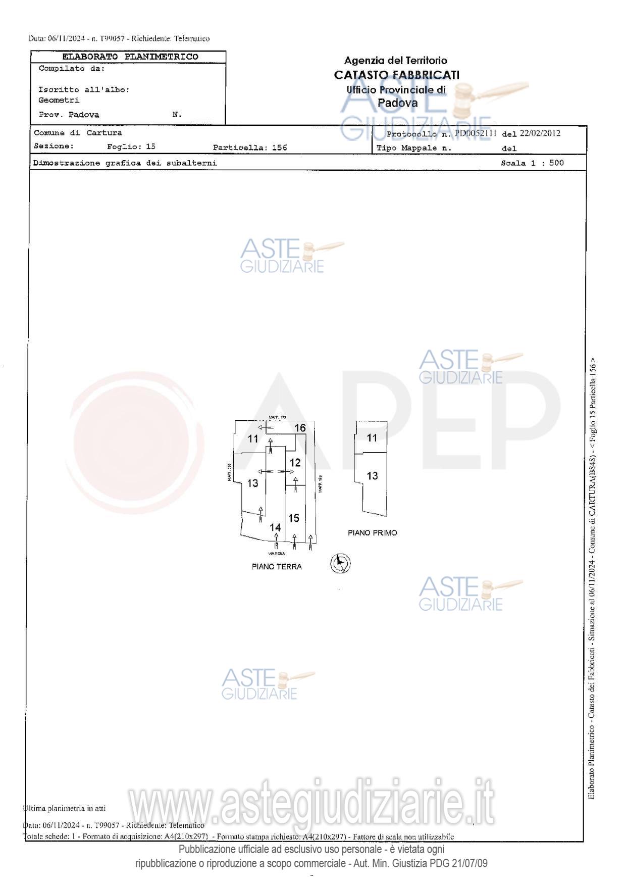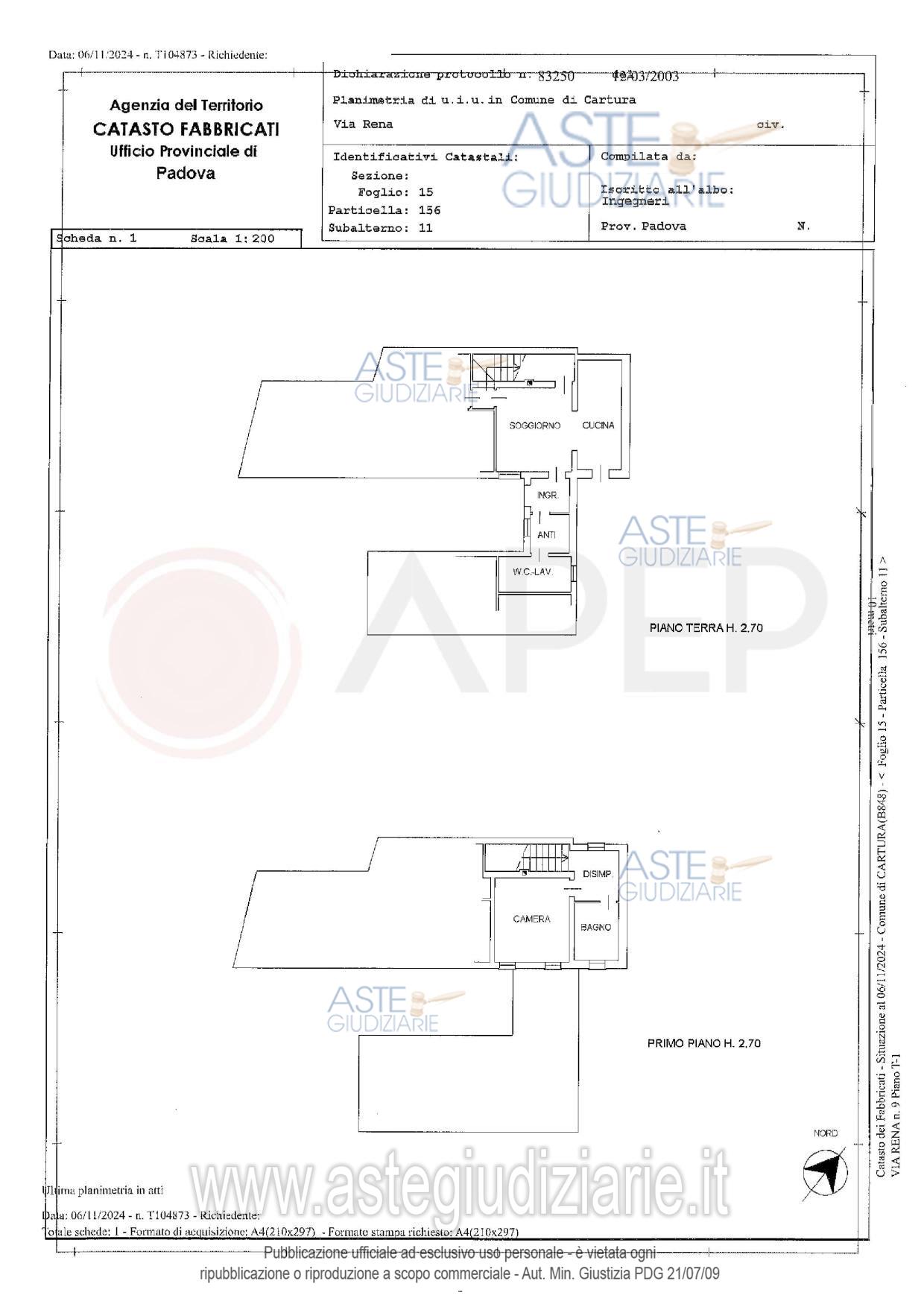 Vendita all'asta Senza incanto, con gara telematica sincrona - LOTTO UNICO: Lotto Unico - piena proprietà di unità immobiliare facente parte del fabbricato bifamiliare sito in Comune di Cartura (PD), via Rena n. 9 e precisamente trattasi di abitazione ai piani terra e primo con cortili esclusivi, della superficie commerciale complessiva di mq. 94. Libero. Prezzo base € 85.000,00 (offerta minima € 63.750,00). Data vendita 18/06/2026 ore 10:00. Giudice Rossi. Professionista delegato alla vendita Not. Alessia Callegari - Email "aste@apepnotai.it"; Tel. 049651228. Custode Giudiziario Apep - Email "visita@apepnotai.it"; Tel. 049651228. Rif. Tribunale di Padova - Espropriazione immobiliare (cartabia) n. 254/2024