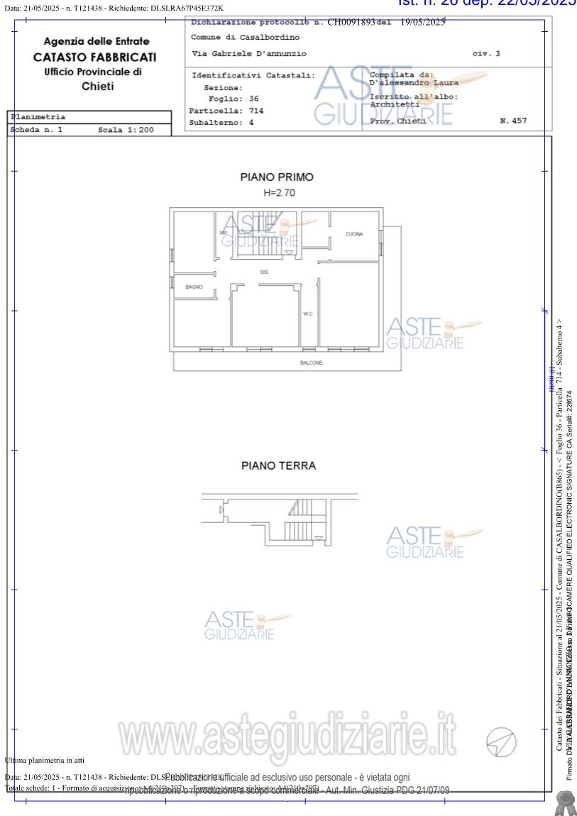 Vendita all'asta Senza incanto, con gara telematica asincrona - LOTTO UNICO: appartamento residenziale indipendente sito in Via D’Annunzio n.3, nel Comune di Casalbordino (CH), al primo piano di un fabbricato plurifamiliare a destinazione residenziale.L’appartamento è espo. Prezzo base € 74.614,00 (offerta minima € 59.691,00). Data inizio operazioni di vendita: 14/04/2026 ore 09:30. Giudice Tommaso David. Professionista delegato alla vendita Dott. Claudio De Nicolis - Email "claudio@studiodenicolis.it". Custode Giudiziario Ivg Abruzzo - Email "ivgpescara1@gmail.com"; Cell. 3666892779; Tel. 0859436430. Rif. Tribunale di Vasto - Esecuzione immobiliare post legge 80 n. 61/2016