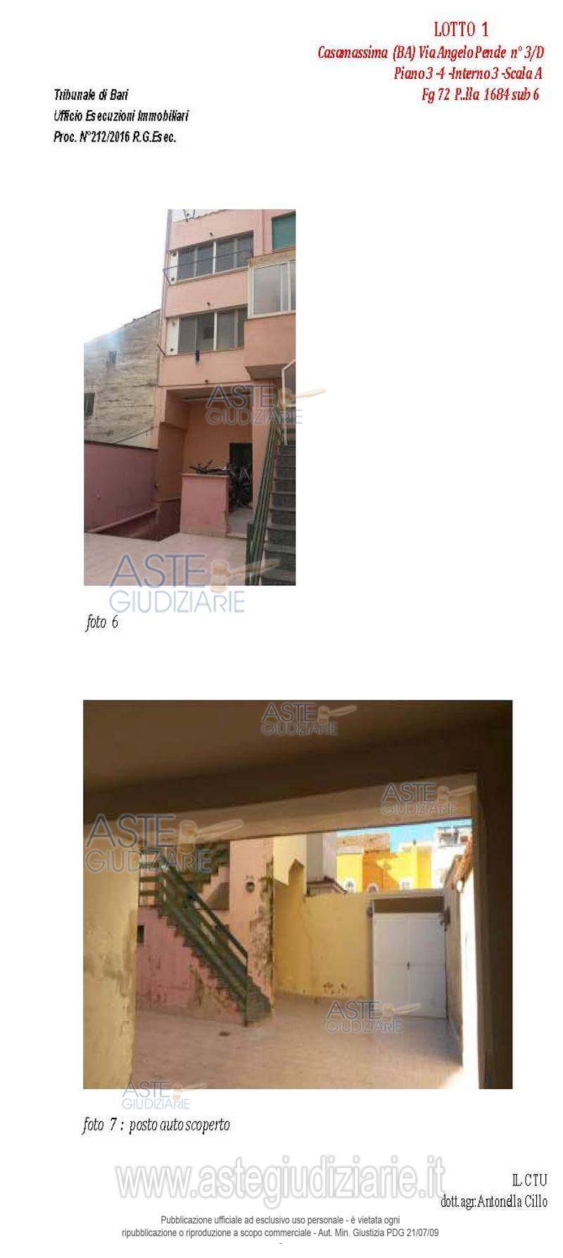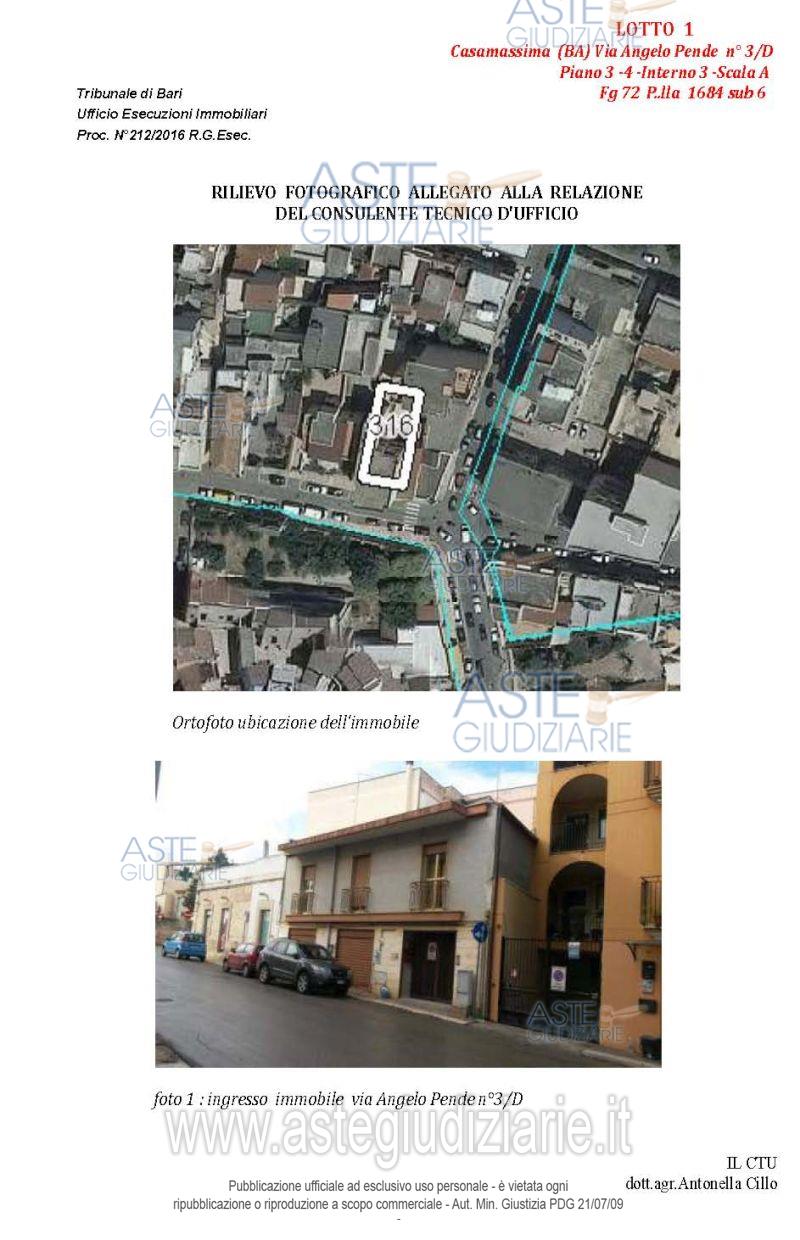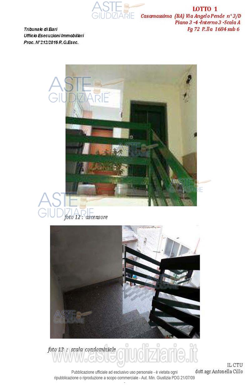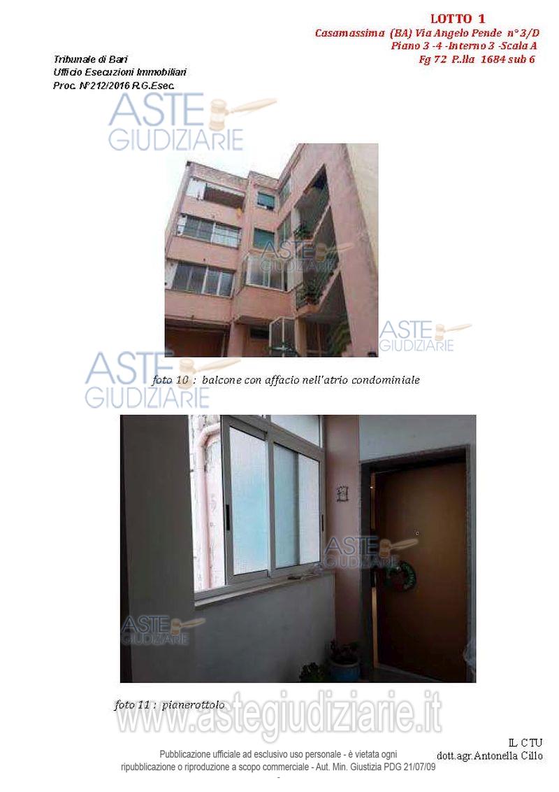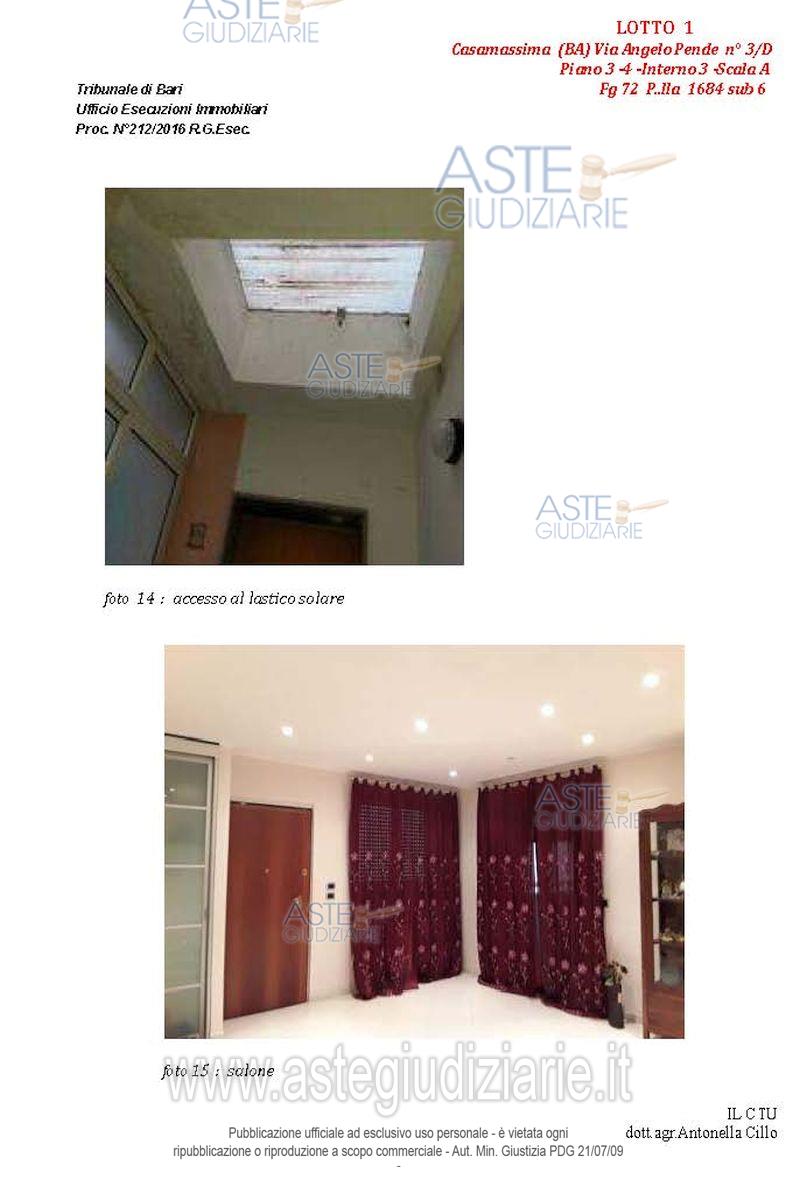 Vendita all'asta Senza incanto, con gara telematica asincrona - LOTTO 1: Appartamento al terzo piano composto da quattro vani e accessori, con pertinenziale lastrico solare e posto auto nell'atrio condominiale. Prezzo base € 102.235,86 (offerta minima € 76.677,00). Data inizio operazioni di vendita: 14/04/2026 ore 10:00. Giudice Dott. Marina Cavallo. Professionista delegato alla vendita Dott. Francesco Campobasso - Email "campobassoassociati@gmail.com"; Tel. 0805214596. Custode Giudiziario Dott. Francesco Campobasso - Email "campobassoassociati@gmail.com"; Tel. 0805214596. Rif. Tribunale di Bari - Esecuzione immobiliare post legge 80 n. 212/2016