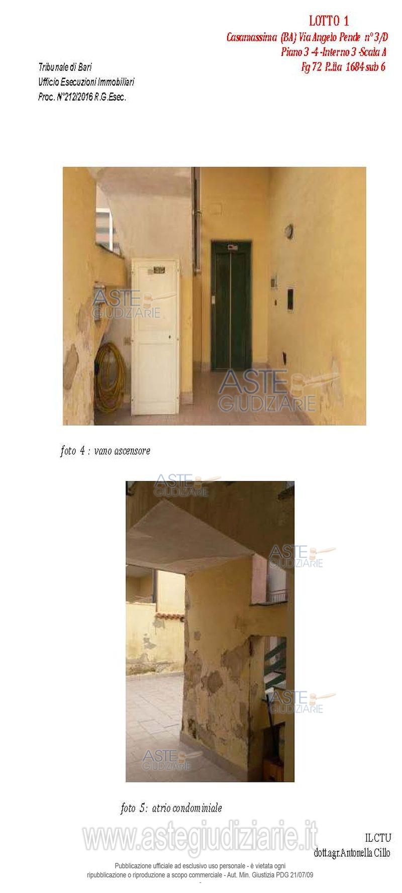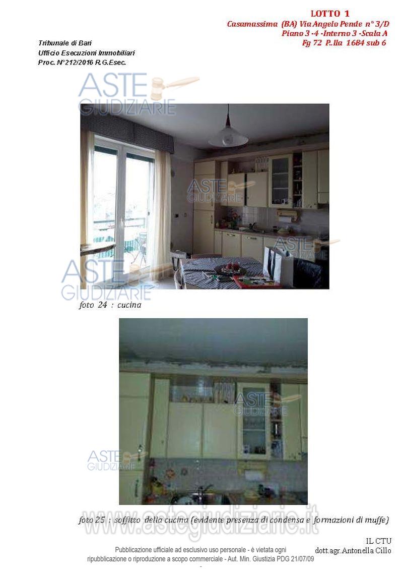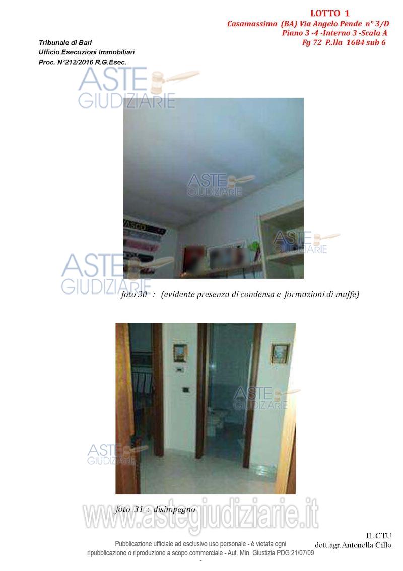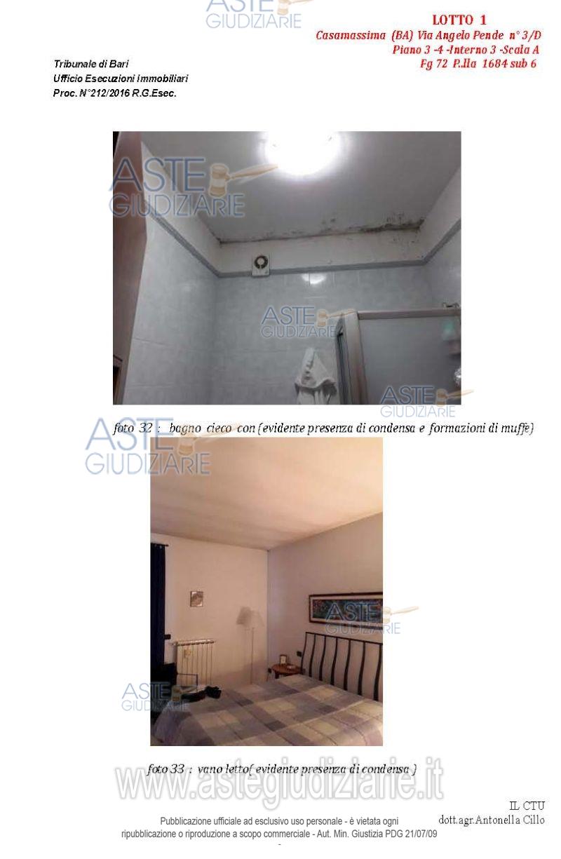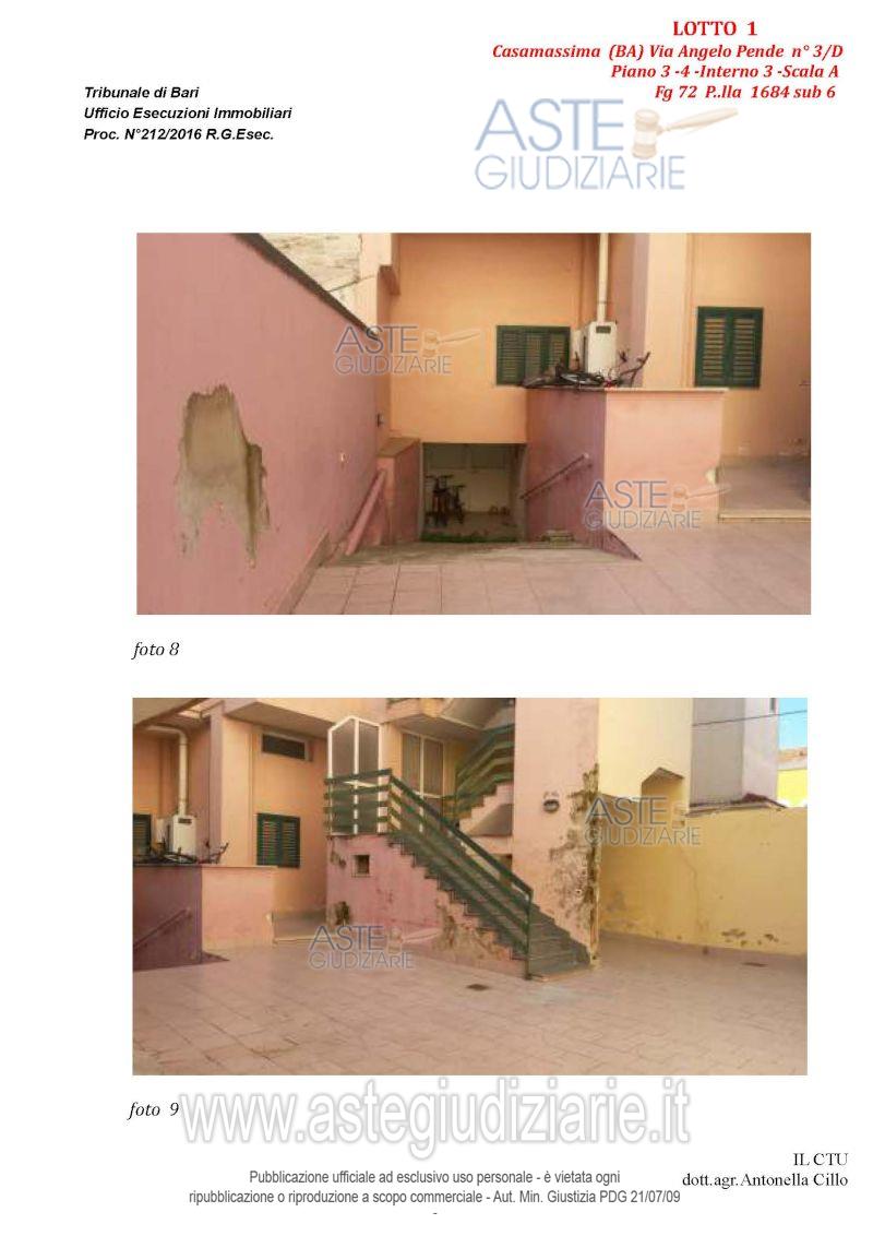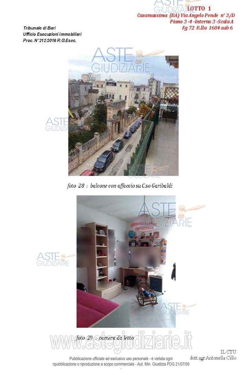Vendita all'asta Senza incanto, con gara telematica asincrona - LOTTO 1: Appartamento al terzo piano composto da quattro vani e accessori, con pertinenziale lastrico solare e posto auto nell'atrio condominiale. Prezzo base € 102.235,86 (offerta minima € 76.677,00). Data inizio operazioni di vendita: 14/04/2026 ore 10:00. Giudice Dott. Marina Cavallo. Professionista delegato alla vendita Dott. Francesco Campobasso - Email "campobassoassociati@gmail.com"; Tel. 0805214596. Custode Giudiziario Dott. Francesco Campobasso - Email "campobassoassociati@gmail.com"; Tel. 0805214596. Rif. Tribunale di Bari - Esecuzione immobiliare post legge 80 n. 212/2016