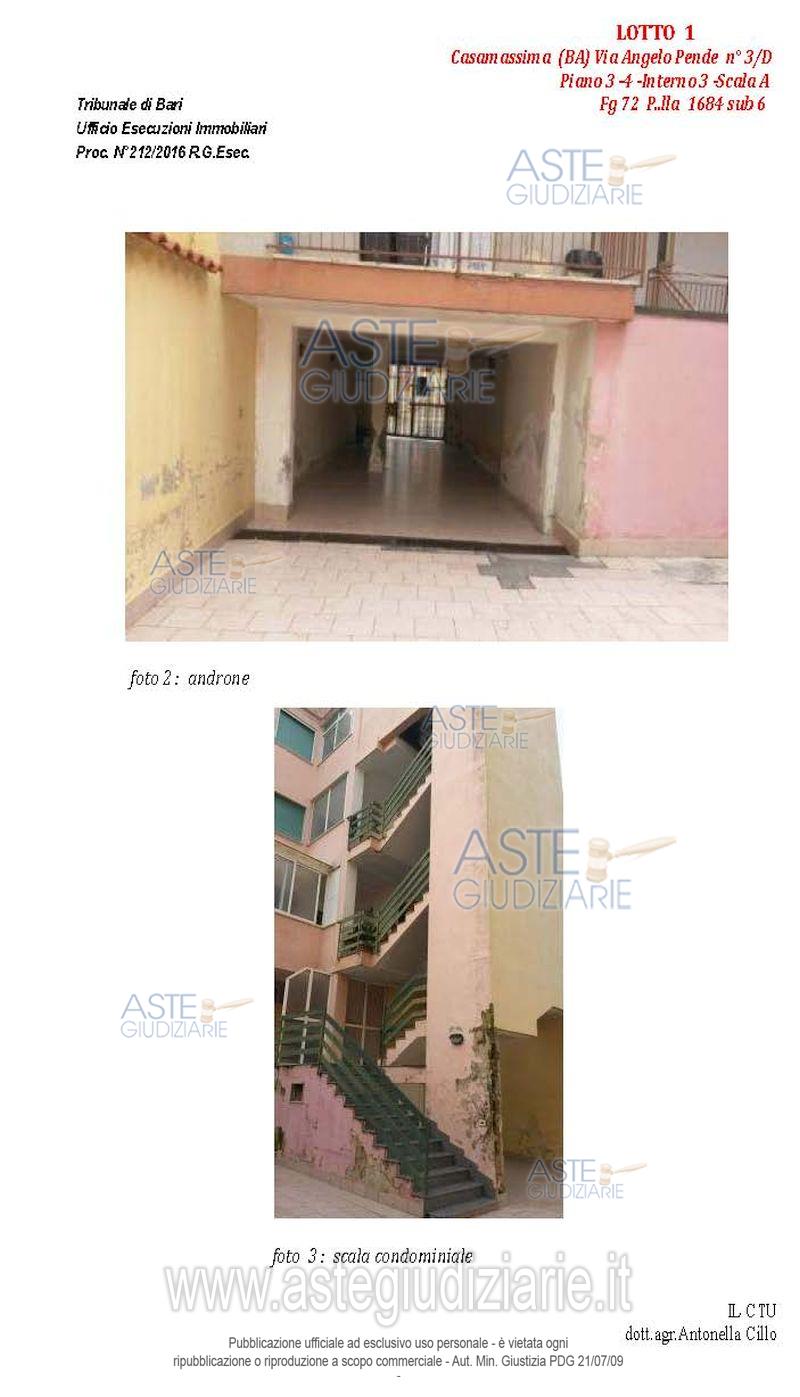 Vendita all'asta Senza incanto, con gara telematica asincrona - LOTTO 1: Appartamento al terzo piano composto da quattro vani e accessori, con pertinenziale lastrico solare e posto auto nell'atrio condominiale. Prezzo base € 102.235,86 (offerta minima € 76.677,00). Data inizio operazioni di vendita: 14/04/2026 ore 10:00. Giudice Dott. Marina Cavallo. Professionista delegato alla vendita Dott. Francesco Campobasso - Email "campobassoassociati@gmail.com"; Tel. 0805214596. Custode Giudiziario Dott. Francesco Campobasso - Email "campobassoassociati@gmail.com"; Tel. 0805214596. Rif. Tribunale di Bari - Esecuzione immobiliare post legge 80 n. 212/2016