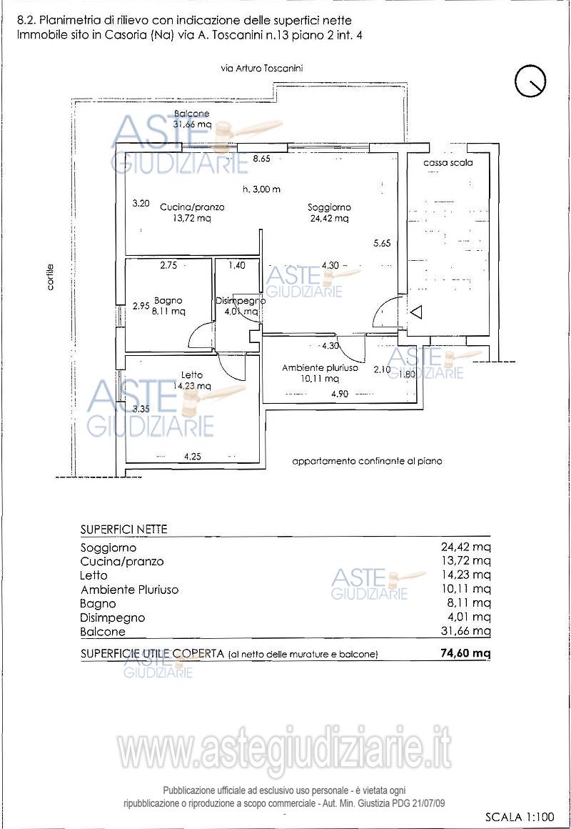 Vendita in attesa dell'emissione del nuovo bando d'asta. LOTTO UNICO: Appartamento in Casoria (NA) alla via Arturo Toscaninin.13, piano secondo scala unica, composta da soggiorno, cucina/pranzo, pluriuso, disimpegno, camera da letto, bagno, oltre balcone, avente superficie commerciale ca. mq 88, 35. Vi sono abusi. Occupato senza titolo con ordine di liberazione. Ultimo prezzo base € 41.500,00 (offerta minima € 31.125,00). Professionista delegato alla vendita Avv. Giorgio Parisi - Email "info.avv.giorgioparisi@gmail.com"; Tel. 0817877548. Custode Giudiziario Avv. Giorgio Parisi - Email "info.avv.giorgioparisi@gmail.com"; Tel. 0817877548. Rif. Tribunale di Napoli - Esecuzione immobiliare post legge 80 n. 774/2013