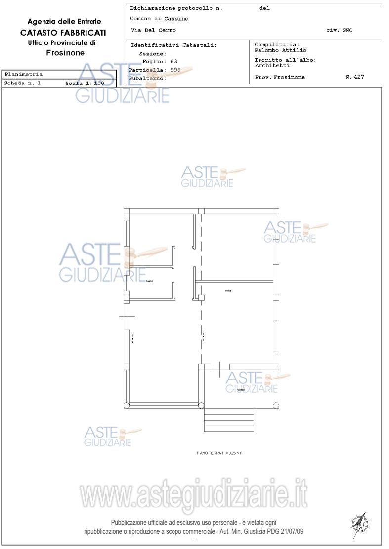 Vendita all'asta Senza incanto, con gara telematica asincrona - LOTTO UNICO: LOTTO UNICOPIENA PROPRIETA' Villetta ubicata a Cassino (FR) - VIA DEL CERRO LOCALITA' S. ANGELO, piano TIl bene oggetto di esecuzione e sito in zona periferica del Comune di Cassino. La villetta è realizzata con struttura in C.A., con copertura del tipo a doppia falda inclinata, realizzata con struttura in legno con sovrastante manto di copertura. La villetta si sviluppa su un solo livello, rialzata dal piano di campagna. Identificato NCEU Fg. 63, Part. 999, Zc. 2, Categoria A4, Graffato Si. Prezzo base € 72.000,00 (offerta minima € 54.000,00). Data inizio operazioni di vendita: 28/05/2026 ore 10:30. Giudice Anna Colombo. Professionista delegato alla vendita Avv. Maria Barbara Avv. Gradini - Email "mariabarbaragradini@gmail.com"; Cell. 3428626908; Tel. 3428626908. Custode Giudiziario Avv. Maria Barbara Avv. Gradini - Email "mariabarbaragradini@gmail.com"; Cell. 3428626908; Tel. 3428626908. Rif. Tribunale di Cassino - Espropriazione immobiliare (cartabia) n. 69/2024