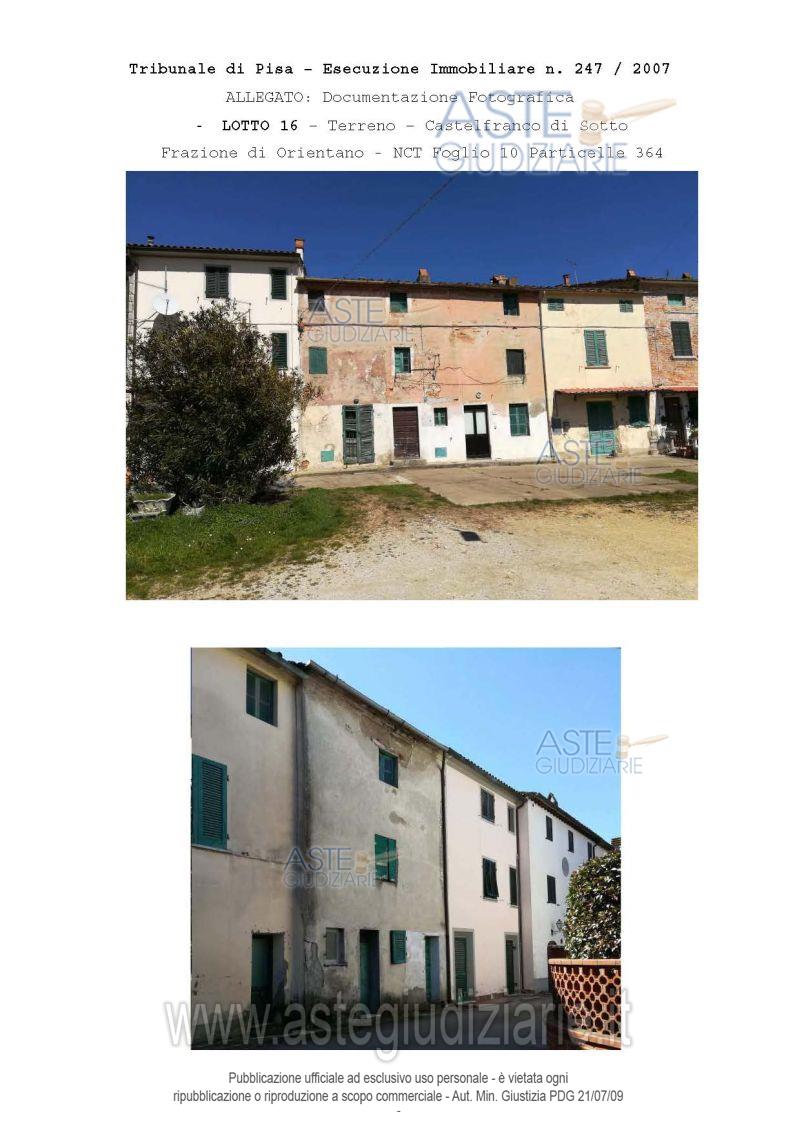 Vendita all'asta Senza incanto, con gara telematica asincrona - LOTTO 16: Lotto 16 - In Castelfranco di Sotto, frazione Orentano, Corte Bisti, via Morandi, piena proprietà dell’intero di fabbricato terratetto di tre piani a schiera e centrale, classificato nel R.U. come edifici di particolare valore storico; l’intero corpo di fabbrica risulta di vecchia realizzazione e da ristrutturare. Prezzo base € 18.000,00 (offerta minima € 13.500,00). Data inizio operazioni di vendita: 14/11/2025 ore 09:00. Giudice Marco Zinna. Professionista delegato alla vendita Not. Angelo Caccetta. Custode Giudiziario Cosimo Erriquez - Email "prenotazionipisa@astagiudiziaria.com". Rif. Tribunale di Pisa - Esecuzione immobiliare post legge 80 n. 247/2007