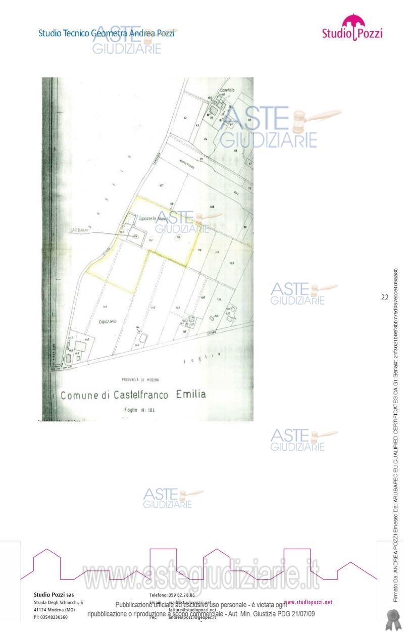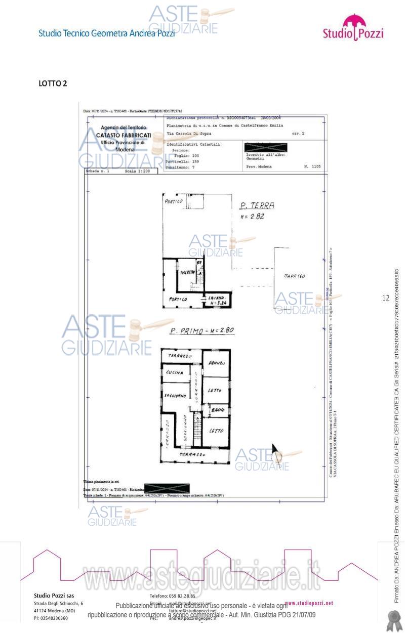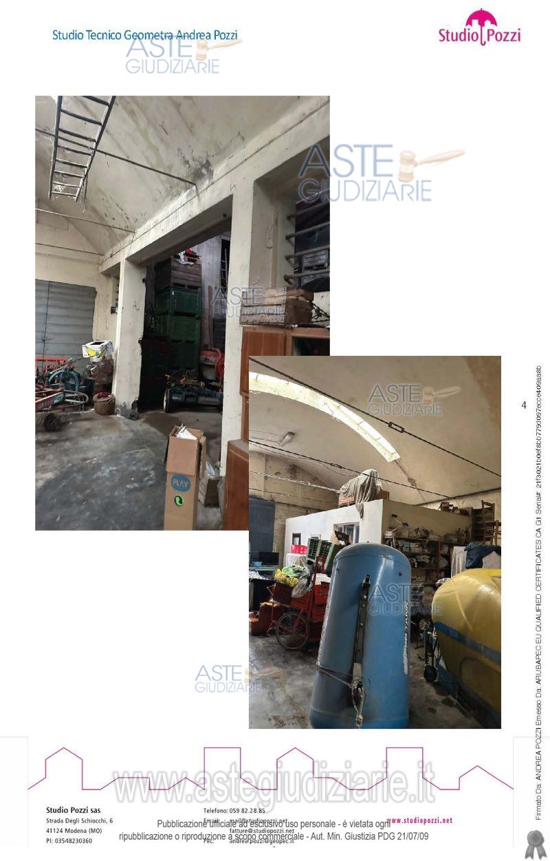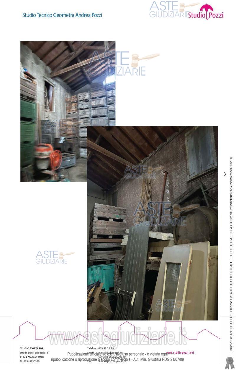 Vendita all'asta Senza incanto, con gara telematica asincrona - LOTTO 1: Piena proprietà in Castelfranco Emilia (MO), località Piumazzo, Via Cassola di Sopra n 6 inambito residenziale di:- abitazione di tipo civile in discrete condizioni con sup. 94 m2, dati catastali: foglio 103, particella 113, sub 3, cat. A/2, P.S1-T-1-2, Classe 2, consistenza vani 9,5, rendita euro 785,01;- attiguo magazzino (dati catastali: foglio 103 particella 113, sub 2, cat. C2, piano T-1, categoriaC/2, classe 6, consistenza mq. 420, superficie catastale totale mq.555, rendita euro 759,19). Prezzo base € 252.450,00 (offerta minima € 189.337,50). Data inizio operazioni di vendita: 24/03/2026 ore 10:30. Professionista delegato alla vendita Dott. Giada Sanneris - Email "giada.sanneris@gmail.com". Custode Giudiziario Alex Manelli - Email "visiteimmobili@ivgmodena.it"; Tel. 059847301. Rif. Tribunale di Modena - Espropriazione immobiliare (cartabia) n. 27/2024