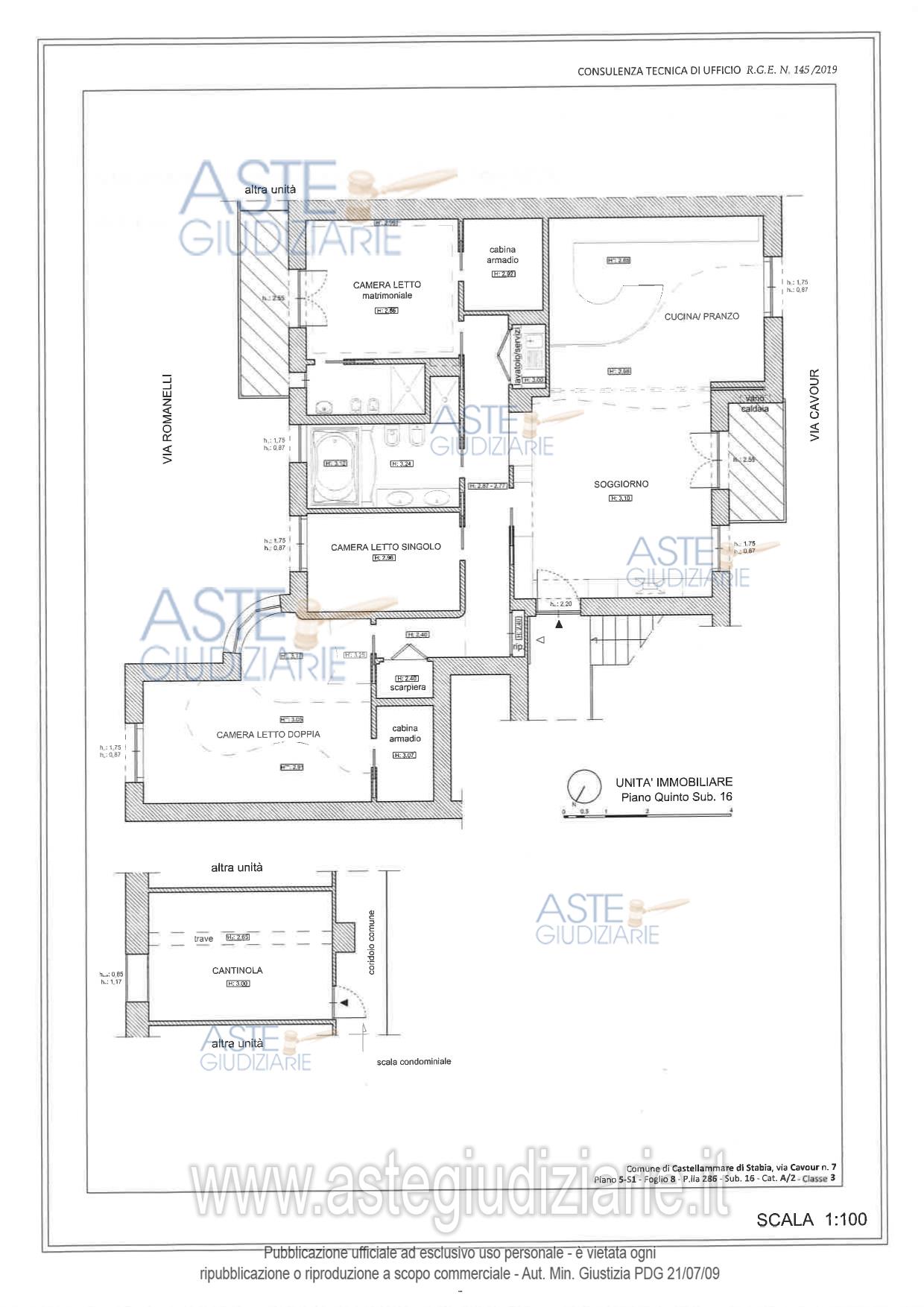 Vendita all'asta Senza incanto, con gara telematica asincrona - LOTTO UNICO: Appartamento al 5^ piano oltre rialzo (6^ livello fuori terra) in Castellammare di Stabia alla via Cavour 7 scala A, composto da soggiorno/cucina con balcone, zona notte con una camera padronale, cabina armadio, bagno riservato e balcone, nel corridoio un altro bagno ed altre due camere, di cui una con cabina armadio. All'immobile è annessa una cantinola al piano seminterrato. La superficie interna netta dell’abitazione è di circa mq. 120 oltre i due balconi di circa mq. 9,20 e la cantinola circa mq.13,50. Prezzo base € 322.500,00 (offerta minima € 241.875,00). Data inizio operazioni di vendita: 14/01/2026 ore 11:00. Professionista delegato alla vendita Avv. Simona Castellano - Email "simocastel@yahoo.it"; Cell. 3384584906; Tel. 0818812377. Custode Giudiziario Avv. Simona Castellano - Email "simocastel@yahoo.it"; Cell. 3384584906; Tel. 0818812377. Rif. Tribunale di Torre Annunziata - Esecuzione immobiliare post legge 80 n. 145/2019
