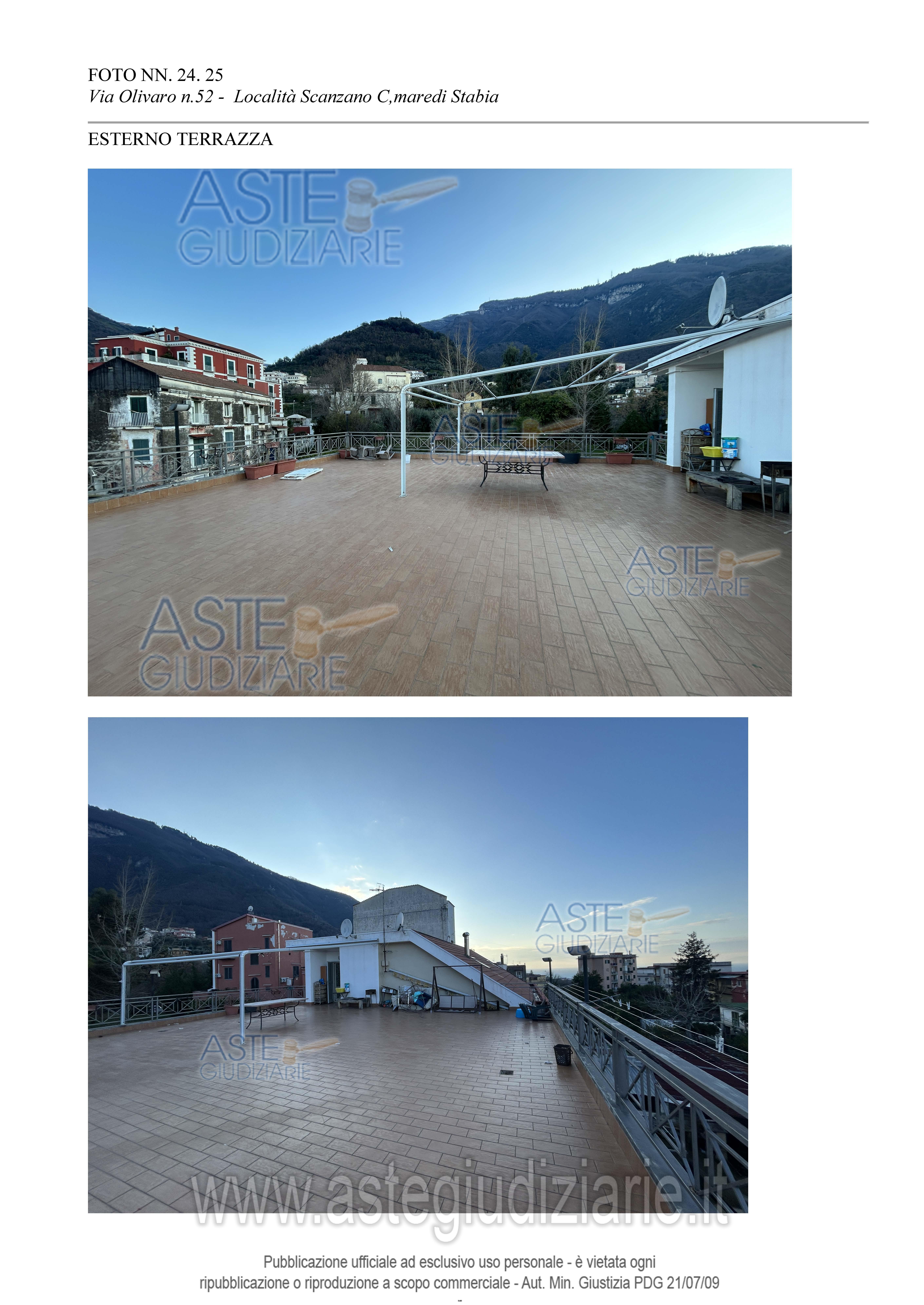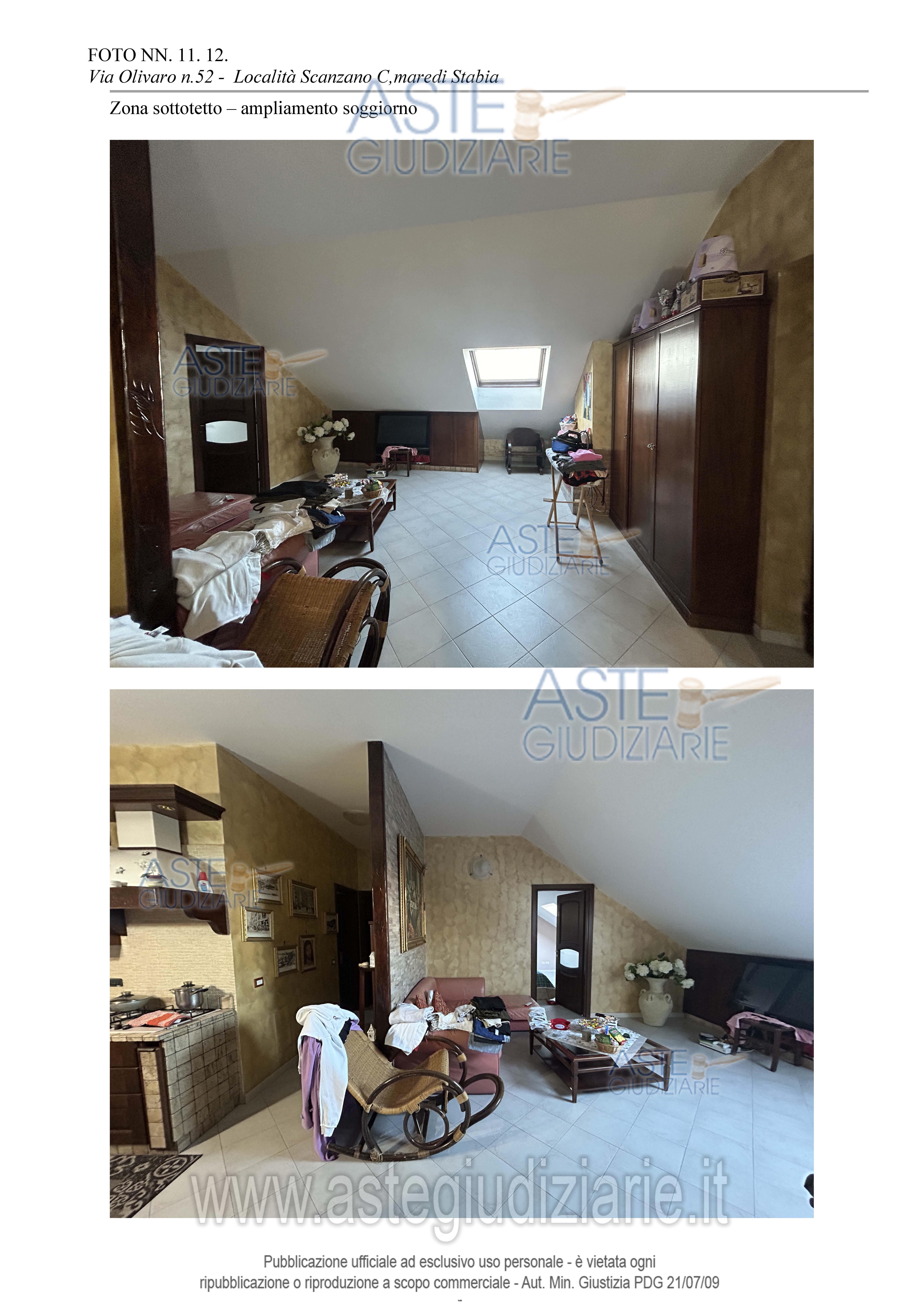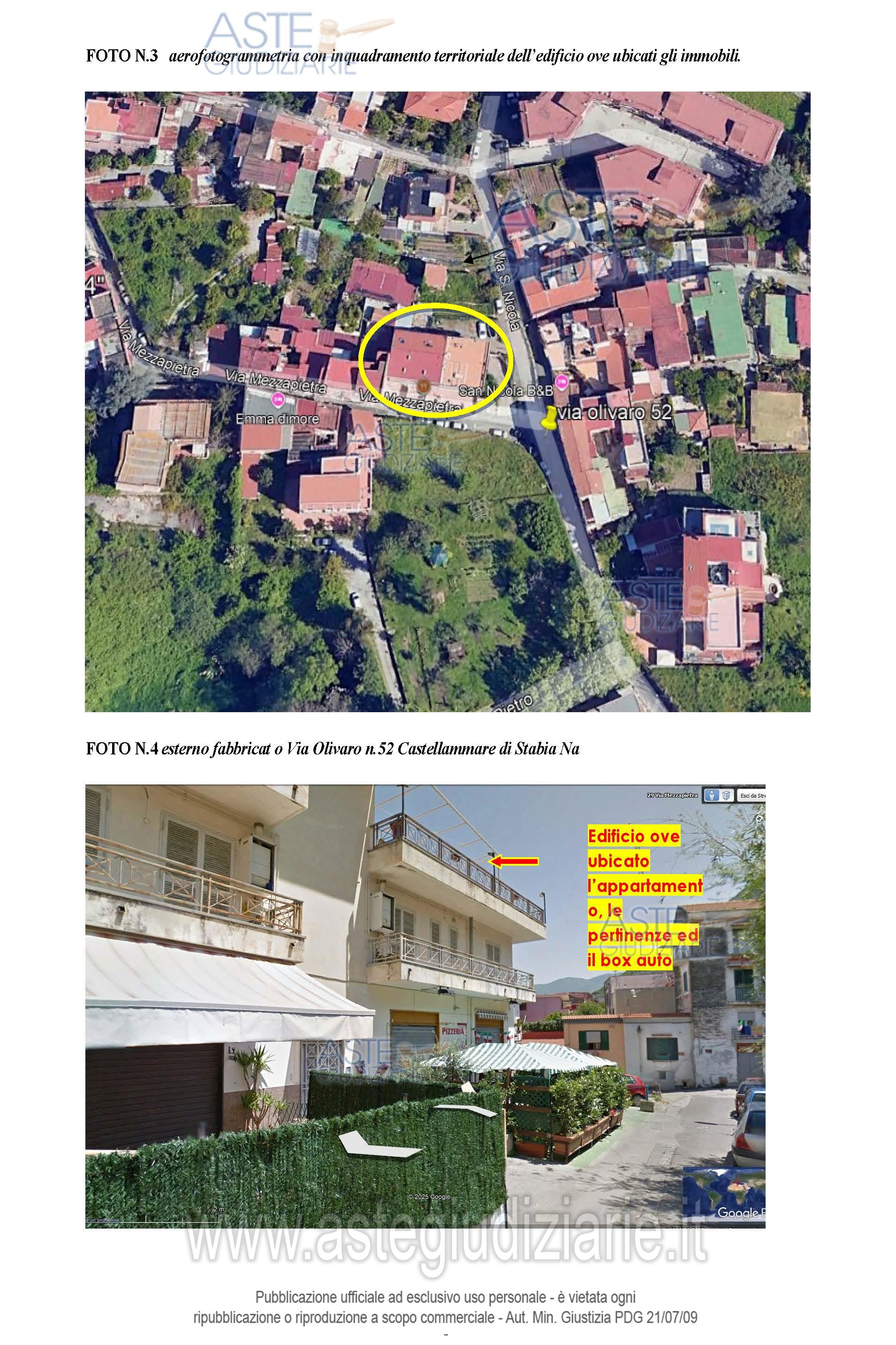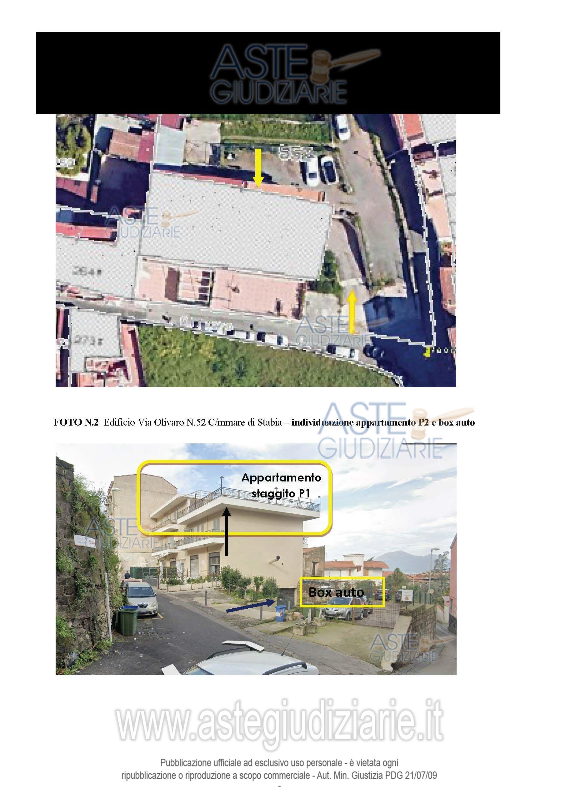 Vendita all'asta Senza incanto, con gara telematica asincrona - LOTTO UNICO: Lotto Unico Piena ed esclusiva proprietà appartamento, pertinenze e locale box auto, censito in NCEU comune di Castellammare di Stabia, foglio 14, p.lla 552, sub 7, Cat. A/2, classe 6, vani 3, rendita € 371,85, Via Olivaro n.52, (già via Monaciello) – località Scanzano Superficie complessiva 92 mq + Locale box auto in NCEU foglio 14, p.lla 552, e sub 19, Cat. C/6, classe 7, mq 21, rendita € 100,86, Sup. catastale mq 26. Trattasi di cespite occupato dall’esecutato. Prezzo base € 175.000,00 (offerta minima € 131.250,00). Data inizio operazioni di vendita: 12/03/2026 ore 15:30. Custode Giudiziario Dott. Giovanni Casillo - Email "studiocasillorusso@libero.it"; Tel. 0815404454. Rif. Tribunale di Torre Annunziata - Espropriazione immobiliare (cartabia) n. 160/2024