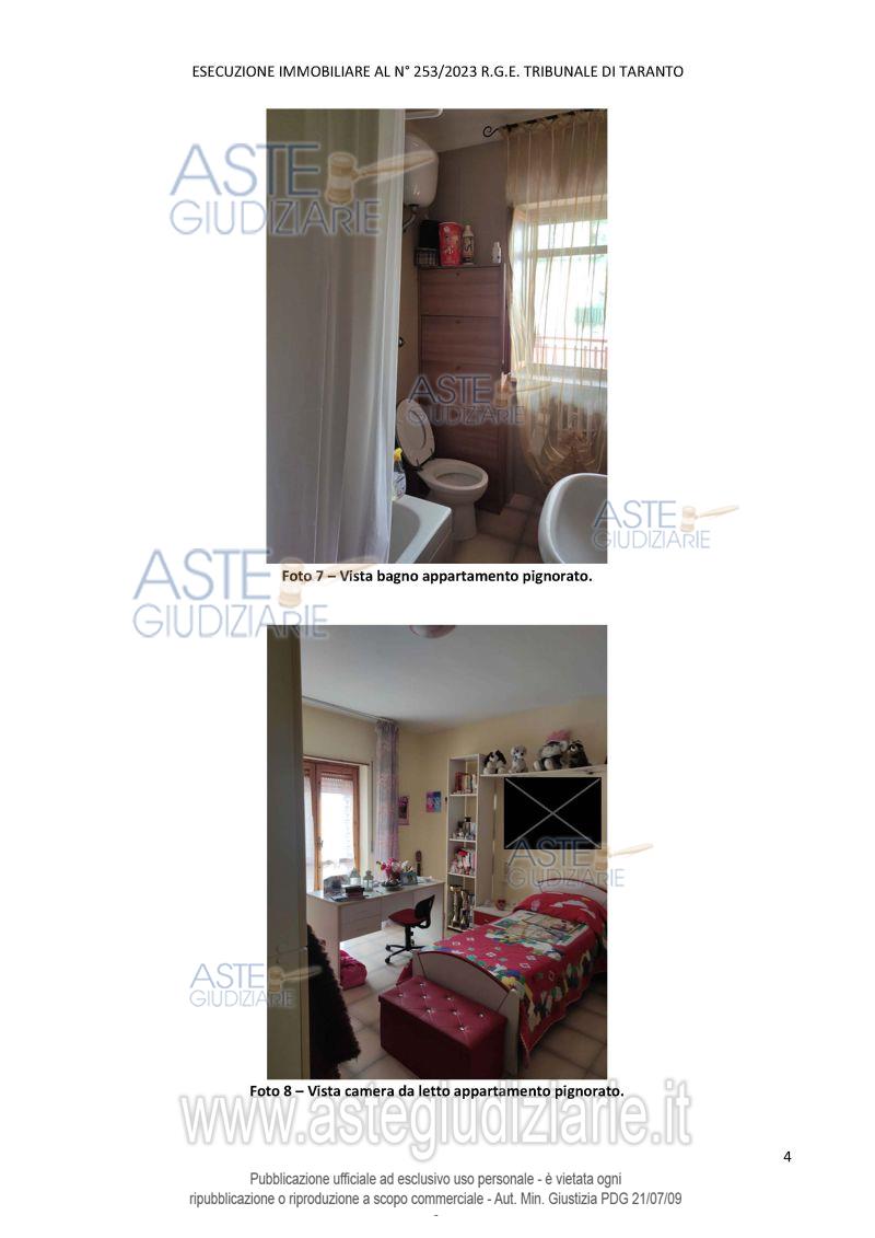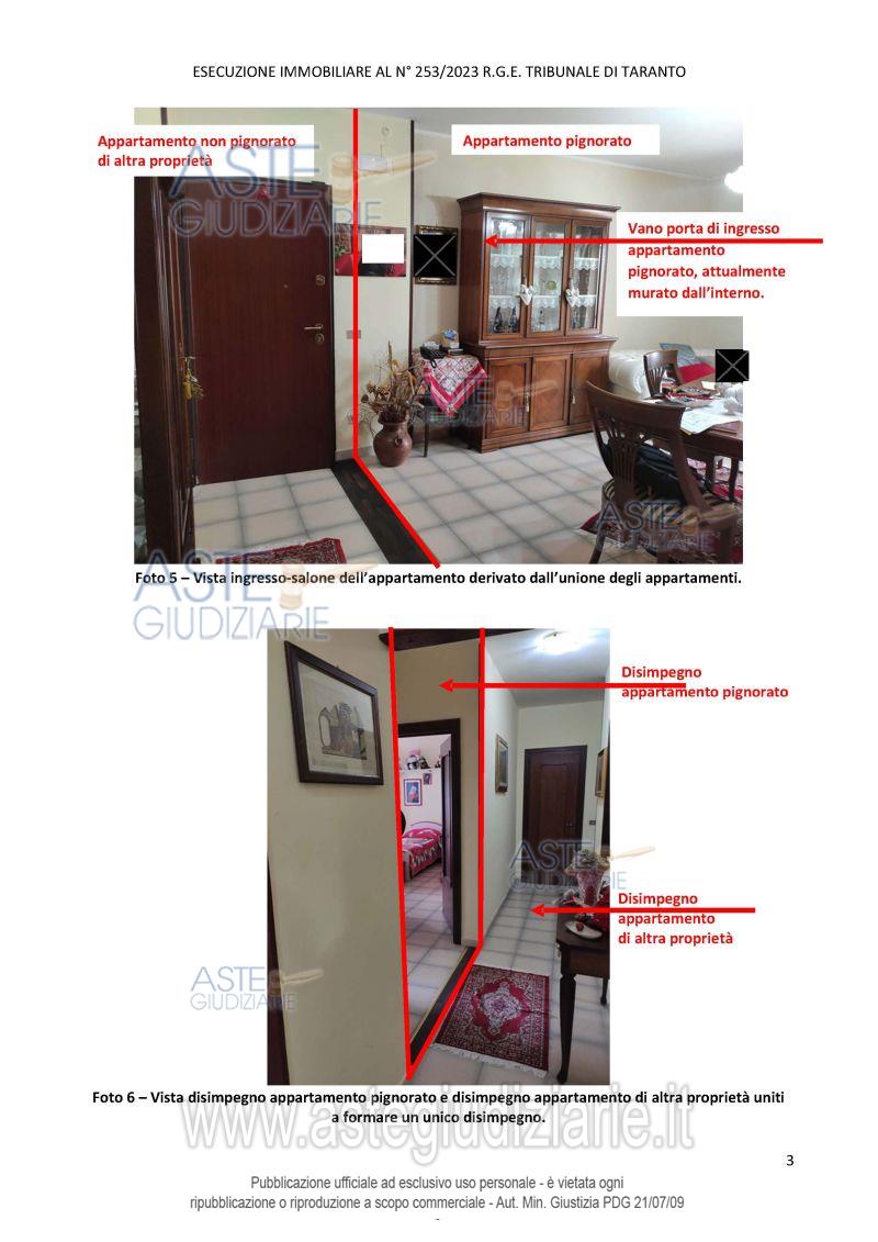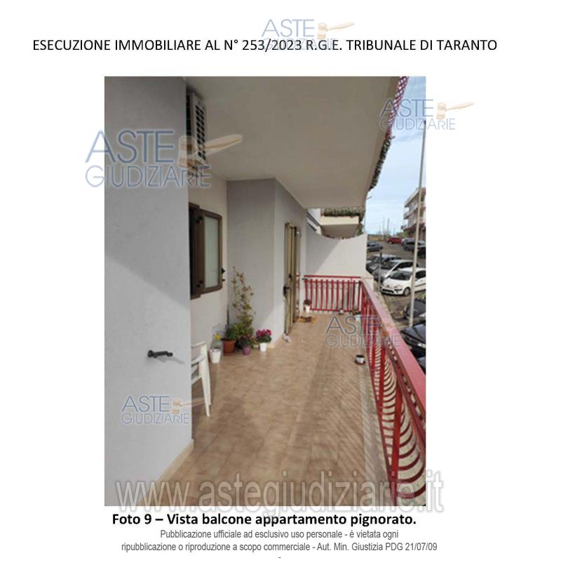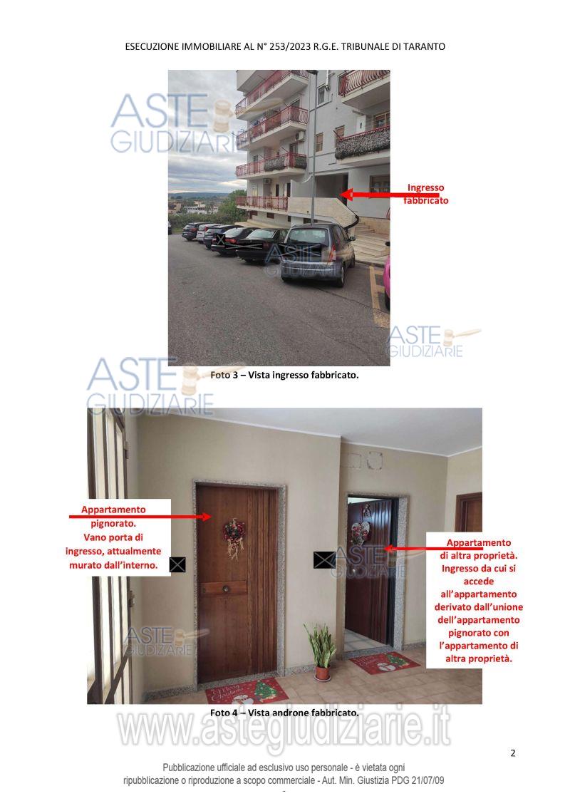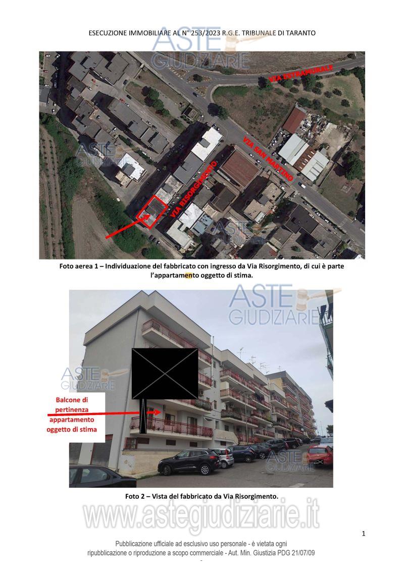 Vendita all'asta Senza incanto, con gara telematica asincrona - LOTTO UNICO: Piena proprietà di appartamento ad uso abitazione, posto al piano terra rialzato del fabbricato sito nel Comune di Castellaneta (TA) in via Risorgimento, al catasto Via San Marino, snc scala D, con ingresso dalla prima porta a sinistra entrando nell’androne condominiale, attualmente privo di autonomia funzionale e accesso autonomo perché unito, senza soluzione di continuità, a formare un unico appartamento con unità immobiliare contigua di altra proprietà non oggetto di pignoramento. Prezzo base € 22.350,00 (offerta minima € 16.762,00). Data inizio operazioni di vendita: 04/11/2025 ore 10:30. Giudice Dott. Andrea Paiano. Professionista delegato alla vendita Avv. Andrea Trani - Email "avv.andreatrani@gmail.com"; Cell. 3926585961; Tel. 0997302531. Custode Giudiziario Ivg Taranto - Email "ivgta.visiteimmobili@gmail.com". Rif. Tribunale di Taranto - Esecuzione immobiliare post legge 80 n. 253/2023