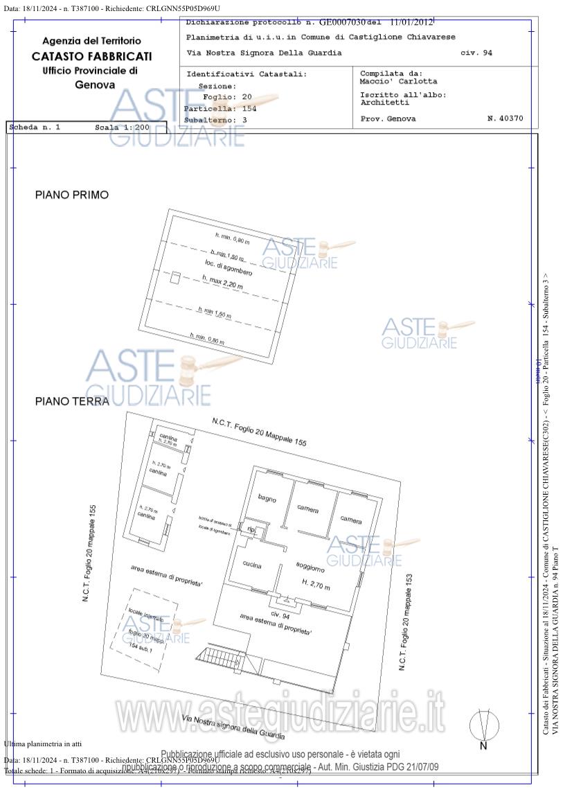 Vendita all'asta Senza incanto, con gara telematica sincrona mista - LOTTO UNICO: Villetta ubicata a Castiglione Chiavarese (GE) - Via Nostra Signora della Guardia 94 composto da piano terra, sottotetto e piccolo edificio con cantine di pertinenza insistente sulla corte per complessivi 128 mq. Garage ubicato a Castiglione Chiavarese (GE) - Via Nostra Signora della Guardia 94 + Garage ubicato a Castiglione Chiavarese (GE) - Via Nostra Signora della Guardia 94. Prezzo base € 44.983,00 (offerta minima € 33.738,00). Data vendita 20/05/2026 ore 14:30. Professionista delegato alla vendita Dott. Maria Pellegrino - Email "maria@studiopellegrino.net"; Tel. 0105533030. Custode Giudiziario Dott. Renata Boilini - Email "immobiliare@sovemo.com"; Tel. 0105299253. Rif. Tribunale di Genova - Espropriazione immobiliare (cartabia) n. 344/2024