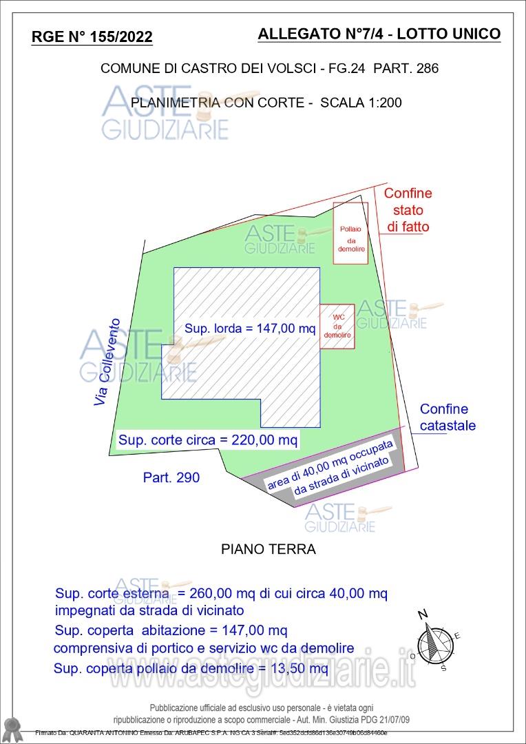Vendita all'asta Senza incanto, con gara telematica asincrona - LOTTO UNICO: 1/1 piena proprietà di Fabbricato civile ubicato a Castro dei Volsci (FR), via Collevento, 11, costituito da abitazione singola disposta su unico piano con corte esclusiva. Identificata in Catasto Fabbricati al fg. 24 part. 286, Cat. A4, consistenza di 6,5 vani. Prezzo base € 23.625,00 (offerta minima € 17.718,75). Data inizio operazioni di vendita: 05/11/2025 ore 16:30. Giudice Simona Di Nicola. Professionista delegato alla vendita Avv. Elena De Angelis - Email "avv.elena.deangelis.fr@gmail.com"; Cell. 3356545152; Tel. 0775855349. Custode Giudiziario Avv. Elena De Angelis - Email "avv.elena.deangelis.fr@gmail.com"; Cell. 3356545152; Tel. 0775855349. Rif. Tribunale di Frosinone - Esecuzione immobiliare post legge 80 n. 155/2022
