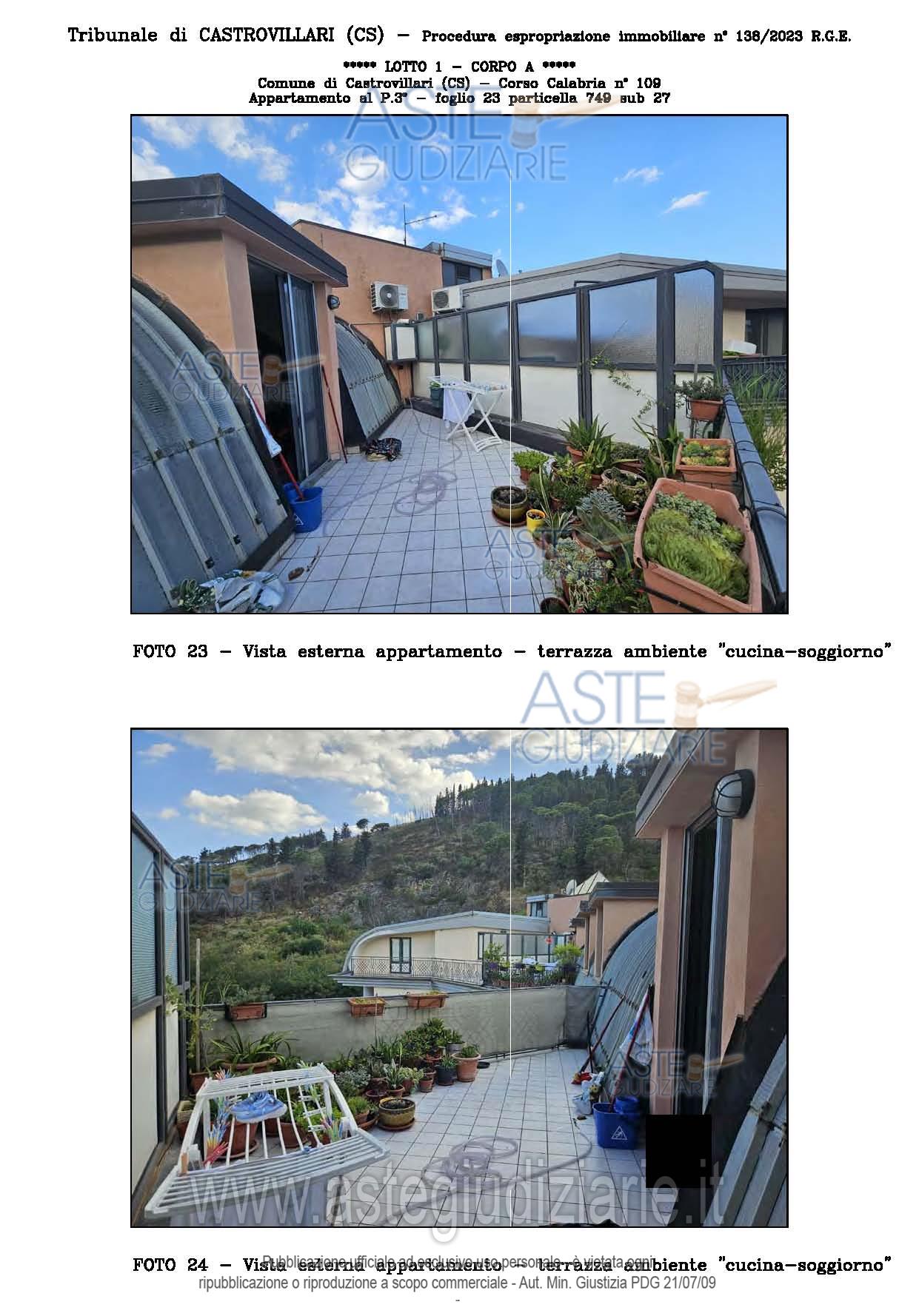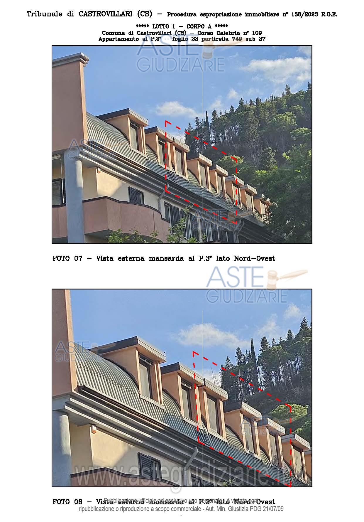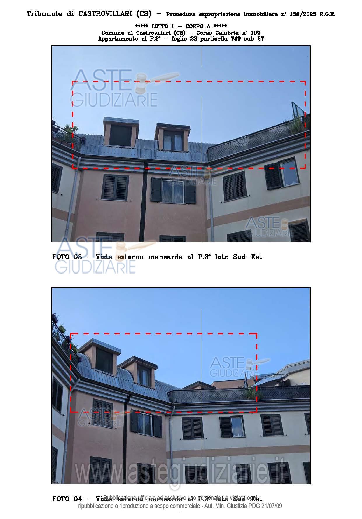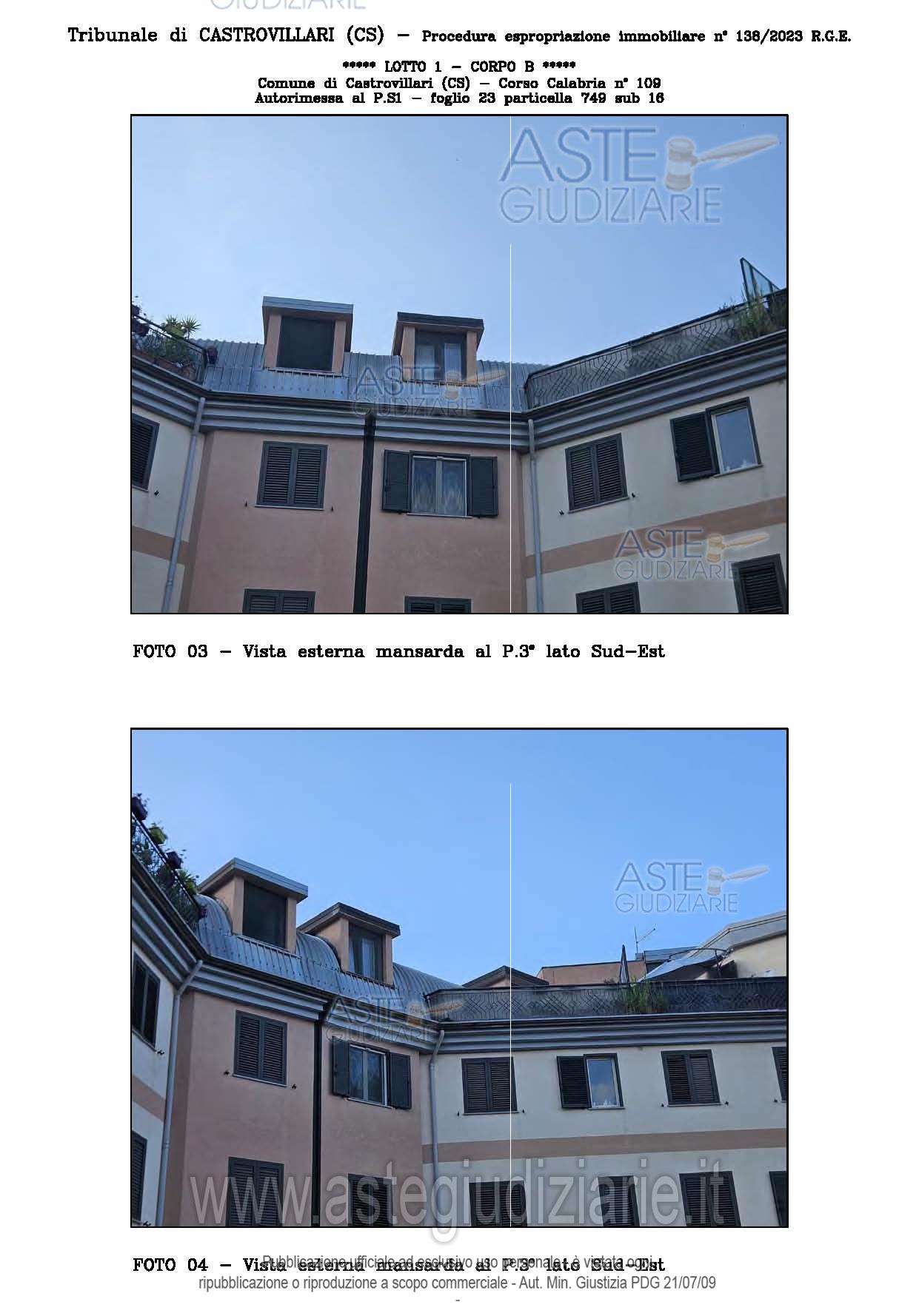 Vendita all'asta Senza incanto, con gara telematica sincrona - LOTTO UNICO: A: piena proprietà 1/1 dell’APPARTAMENTO MANSARDATO B: piena proprietà 1/1 dell’AUTORIMESSA in box singolo ubicata al P.S1 (interrato) del fabbricato “A”. Prezzo base € 48.499,32 (offerta minima € 36.374,49). Data vendita 03/02/2026 ore 16:00. Giudice Giuliana Gaudiano. Professionista delegato alla vendita Dott. Giuseppe Gammaro - Email "studiogammaro@gmail.com". Custode Giudiziario Dott. Giuseppe Gammaro - Email "studiogammaro@gmail.com"; Tel. 3298913665. Rif. Tribunale di Castrovillari - Espropriazione immobiliare (cartabia) n. 138/2023