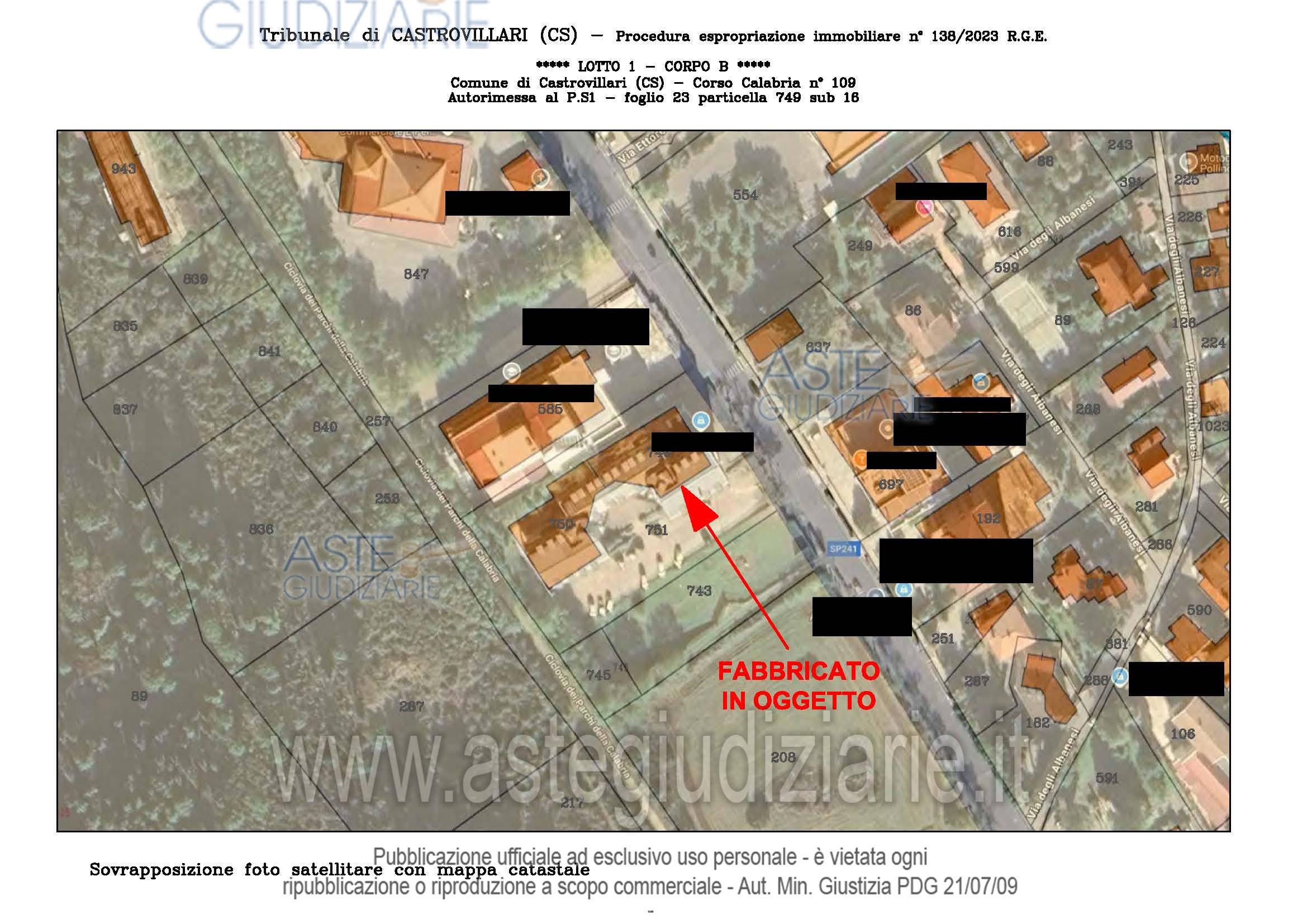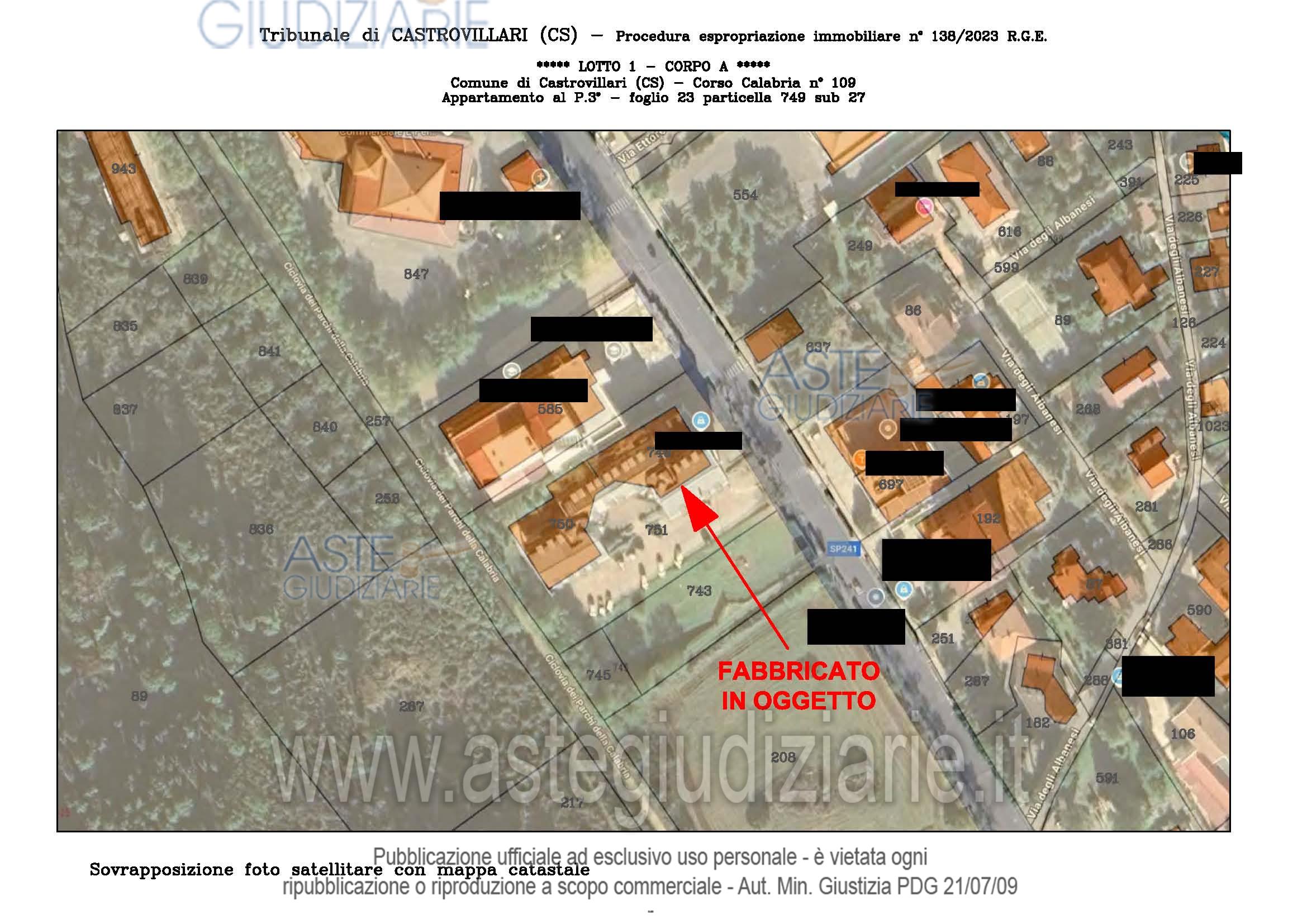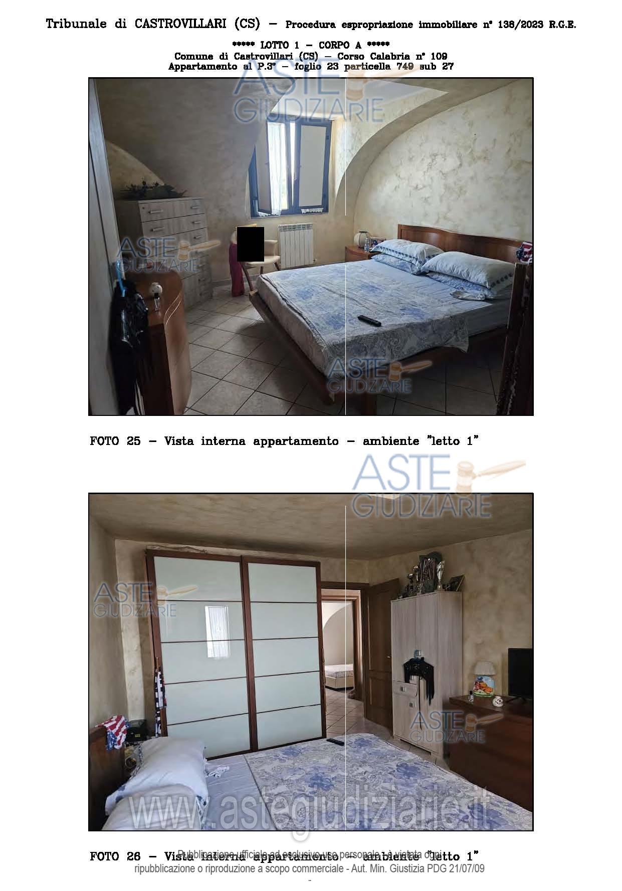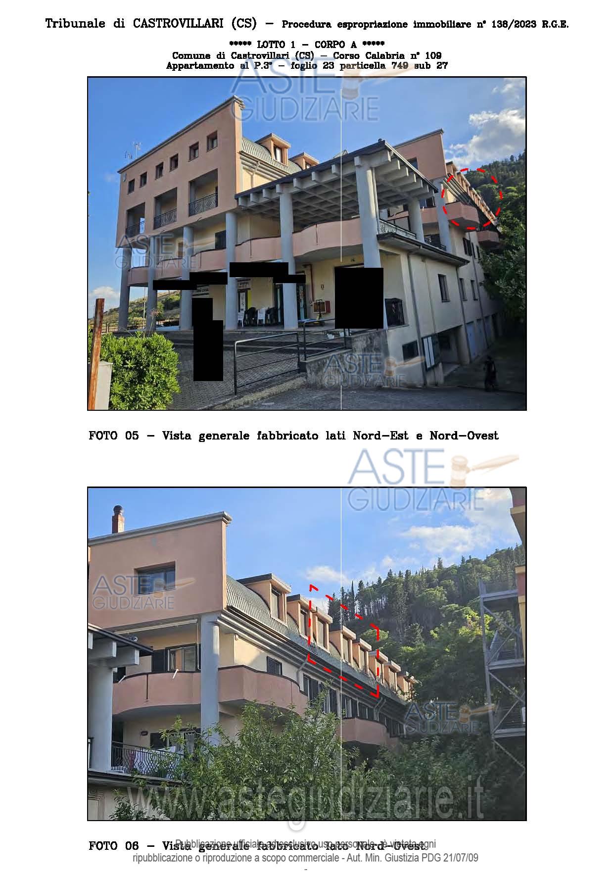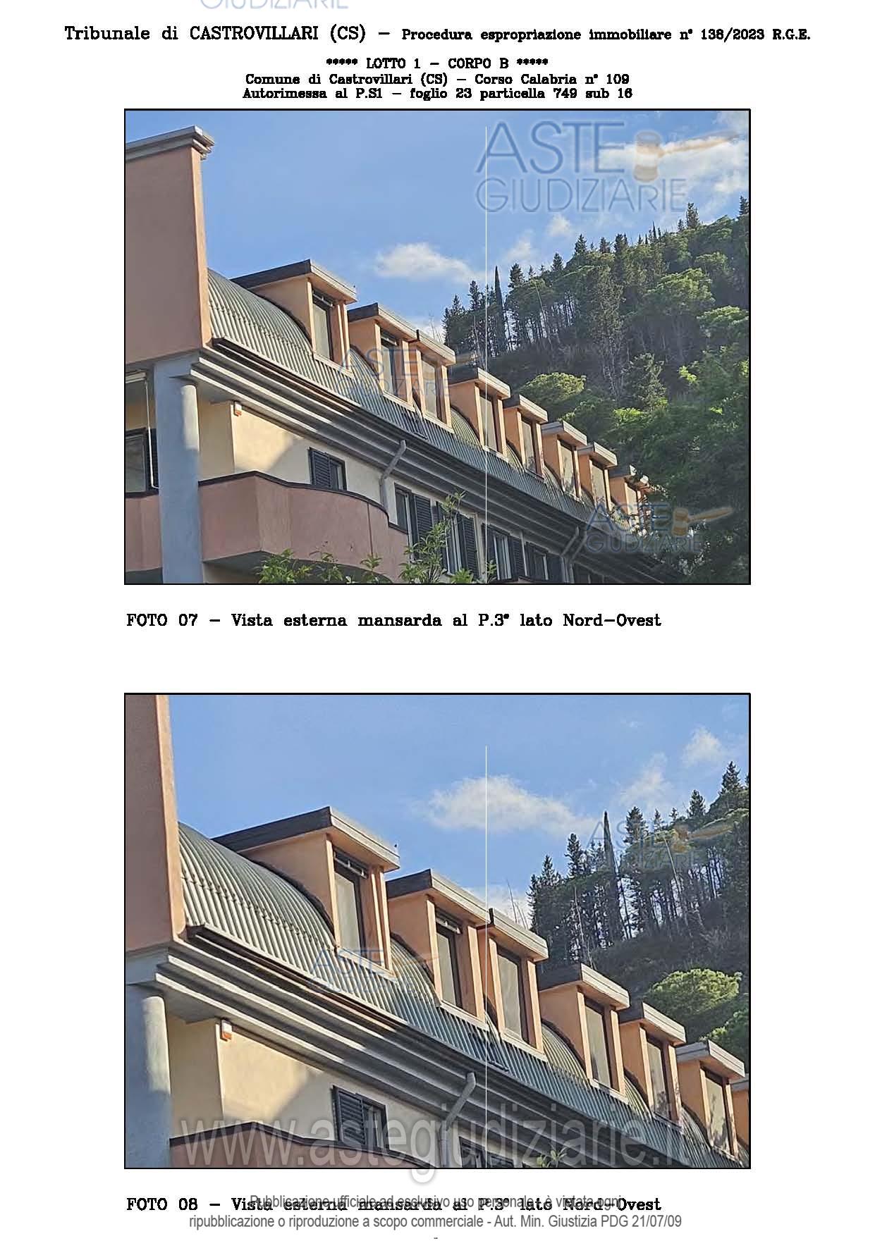 Vendita all'asta Senza incanto, con gara telematica sincrona - LOTTO UNICO: A: piena proprietà 1/1 dell’APPARTAMENTO MANSARDATO B: piena proprietà 1/1 dell’AUTORIMESSA in box singolo ubicata al P.S1 (interrato) del fabbricato “A”. Prezzo base € 48.499,32 (offerta minima € 36.374,49). Data vendita 03/02/2026 ore 16:00. Giudice Giuliana Gaudiano. Professionista delegato alla vendita Dott. Giuseppe Gammaro - Email "studiogammaro@gmail.com". Custode Giudiziario Dott. Giuseppe Gammaro - Email "studiogammaro@gmail.com"; Tel. 3298913665. Rif. Tribunale di Castrovillari - Espropriazione immobiliare (cartabia) n. 138/2023