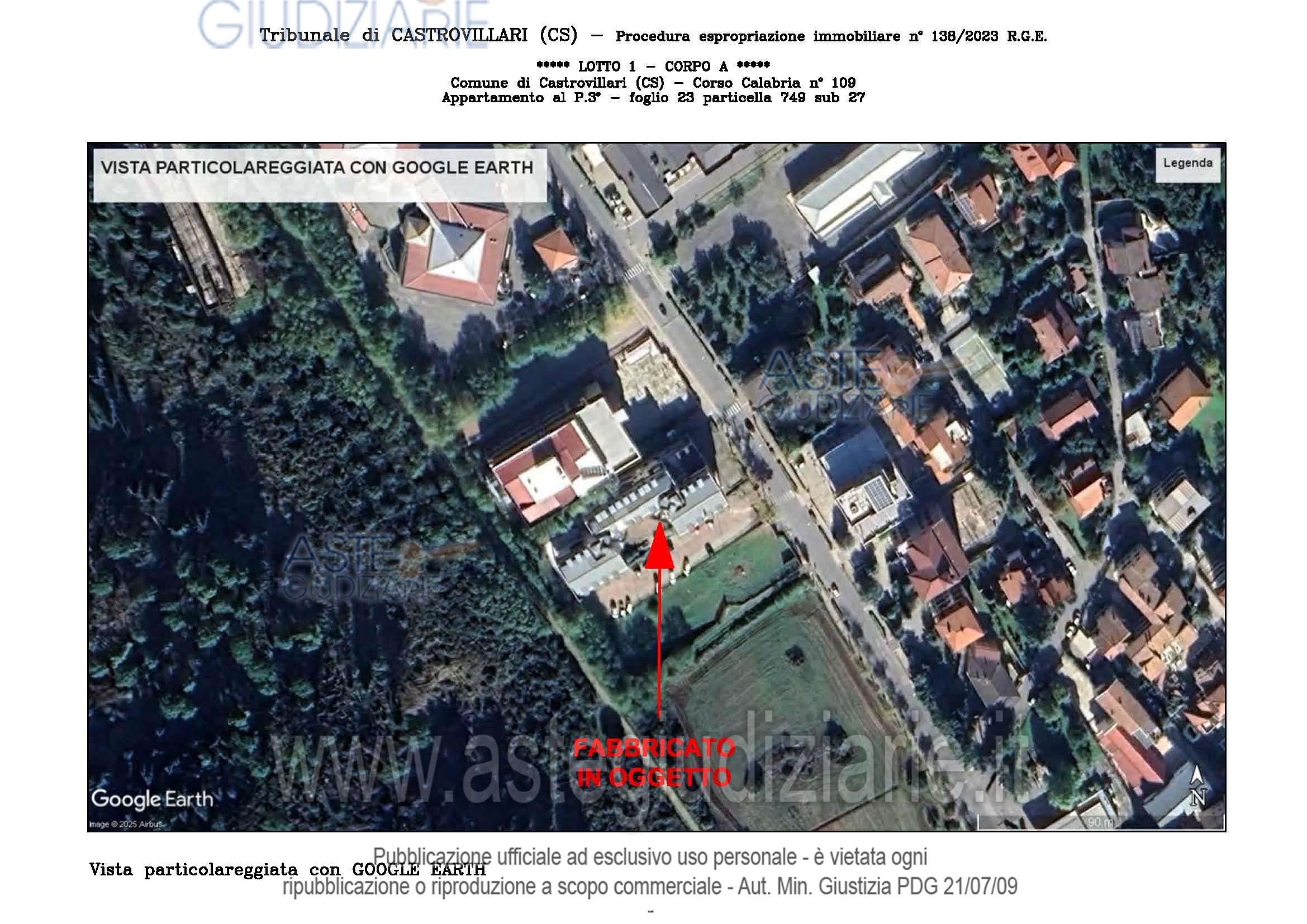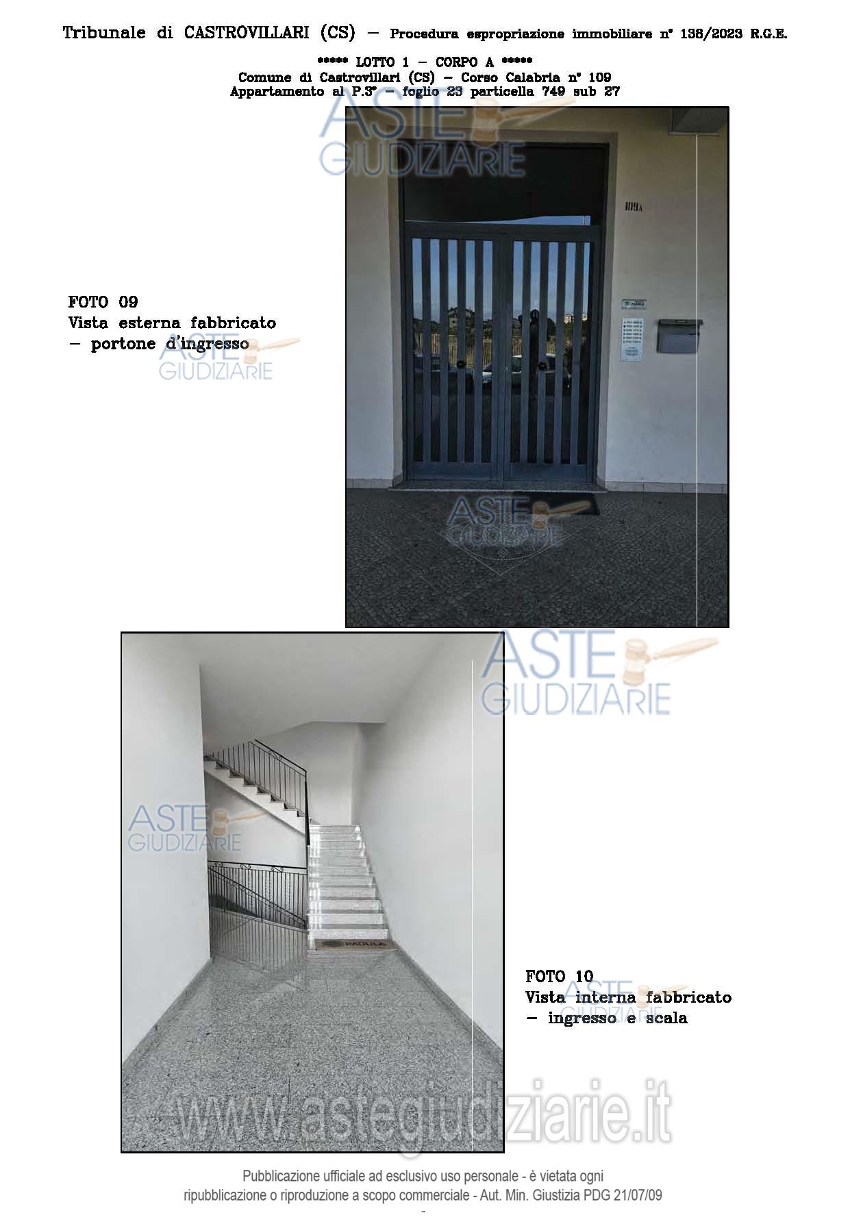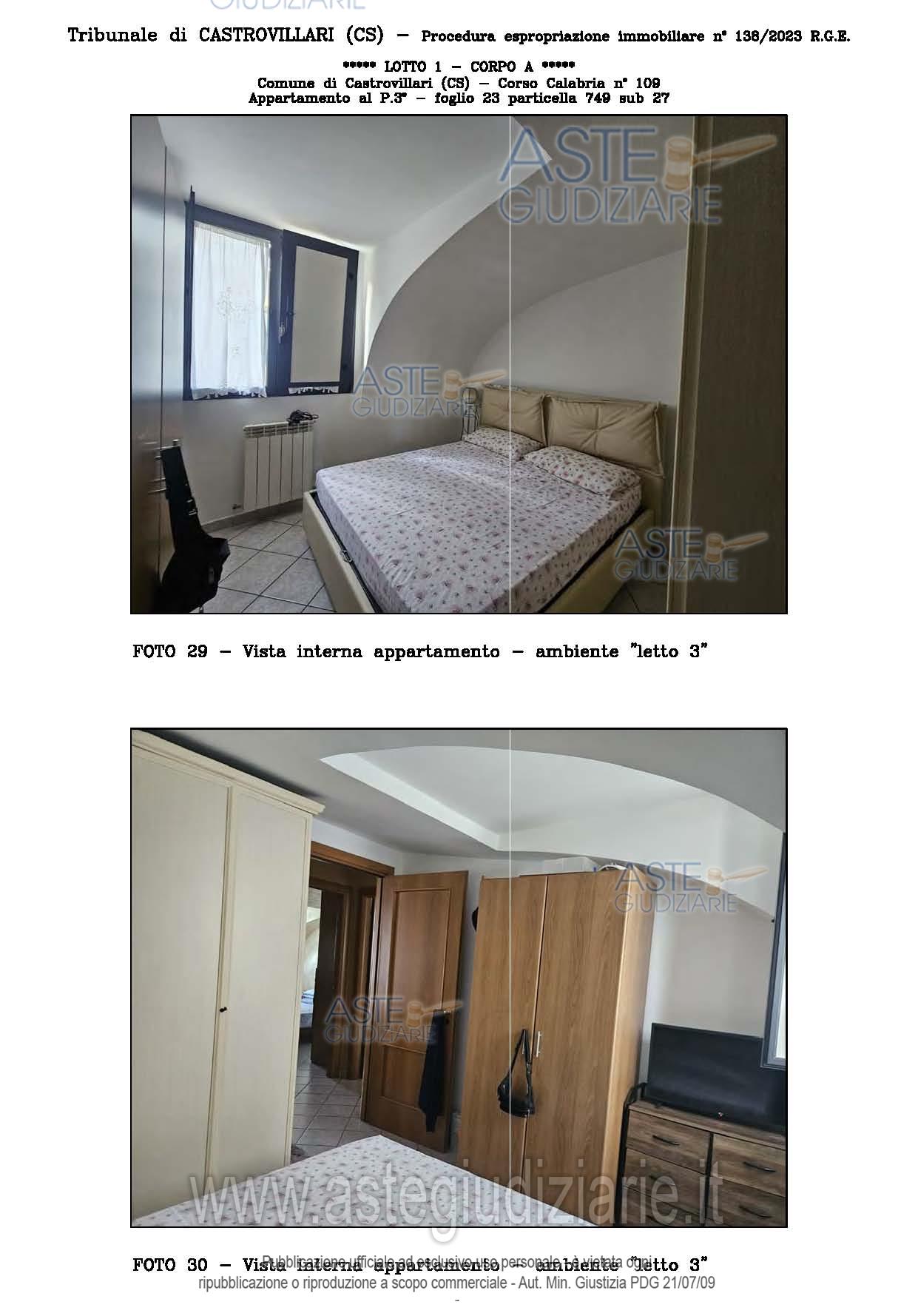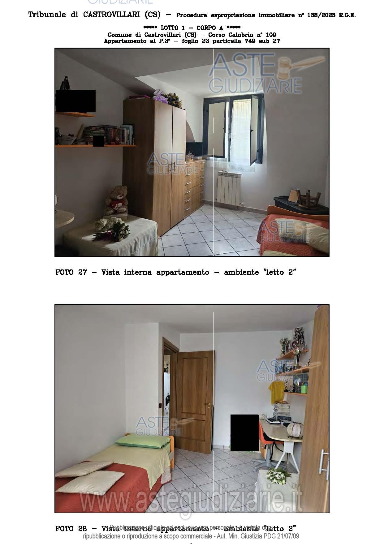 Vendita all'asta Senza incanto, con gara telematica sincrona - LOTTO UNICO: A: piena proprietà 1/1 dell’APPARTAMENTO MANSARDATO B: piena proprietà 1/1 dell’AUTORIMESSA in box singolo ubicata al P.S1 (interrato) del fabbricato “A”. Prezzo base € 48.499,32 (offerta minima € 36.374,49). Data vendita 03/02/2026 ore 16:00. Giudice Giuliana Gaudiano. Professionista delegato alla vendita Dott. Giuseppe Gammaro - Email "studiogammaro@gmail.com". Custode Giudiziario Dott. Giuseppe Gammaro - Email "studiogammaro@gmail.com"; Tel. 3298913665. Rif. Tribunale di Castrovillari - Espropriazione immobiliare (cartabia) n. 138/2023