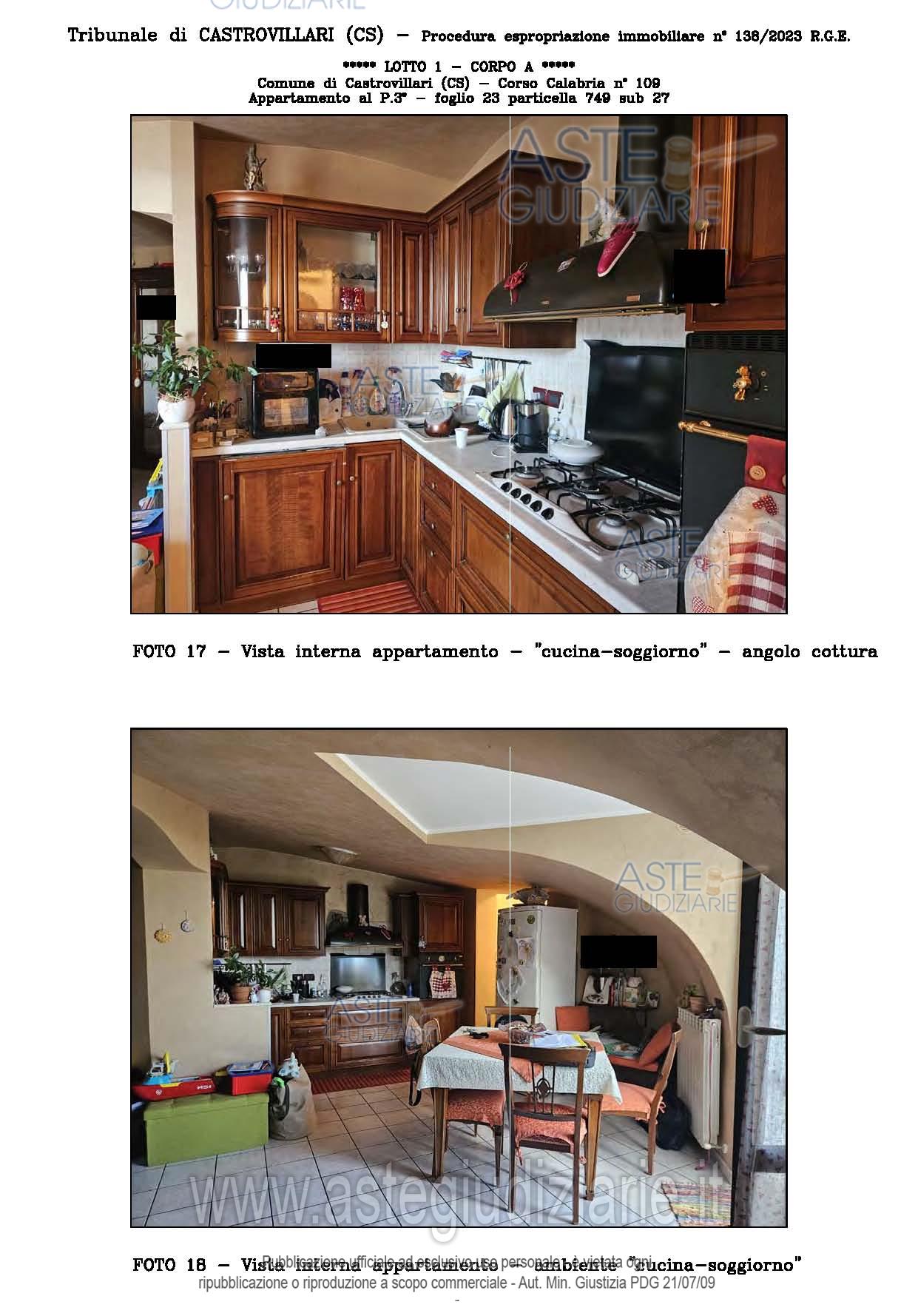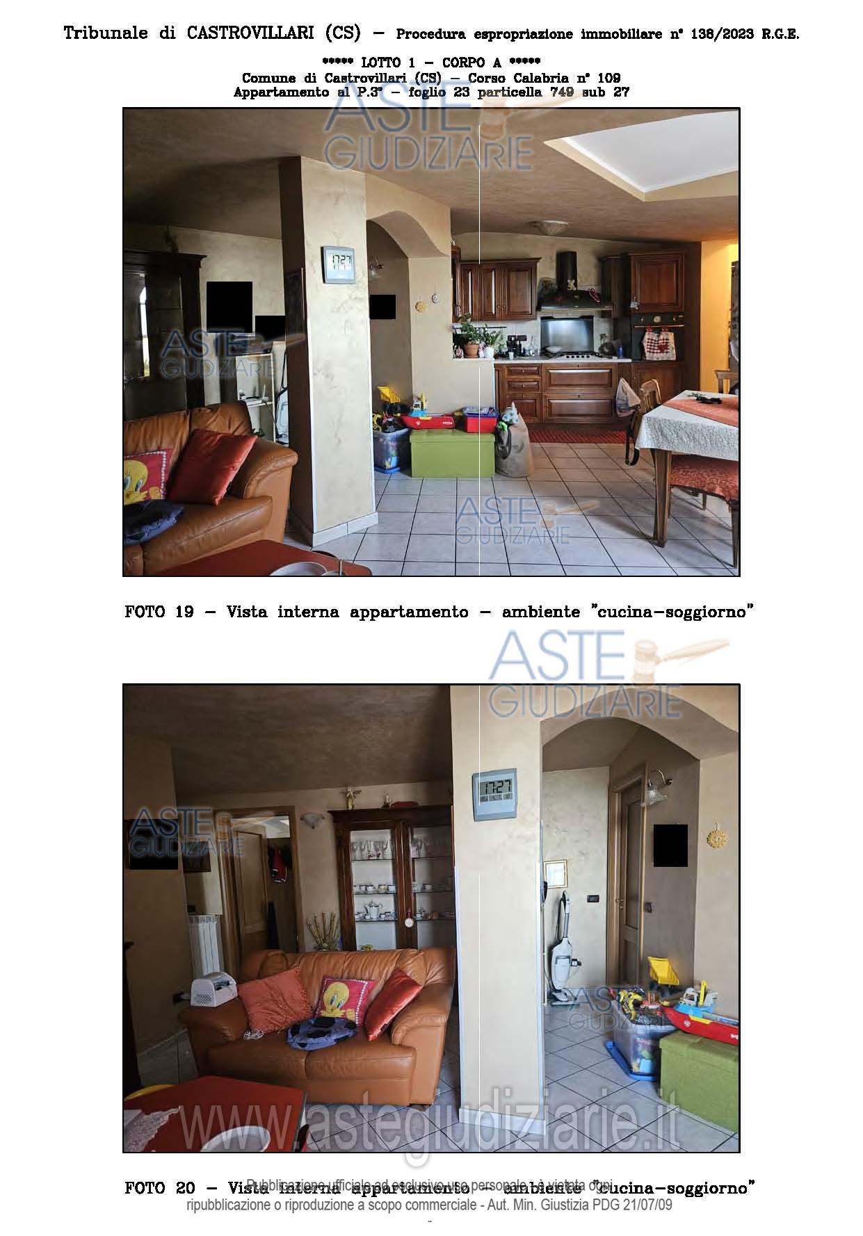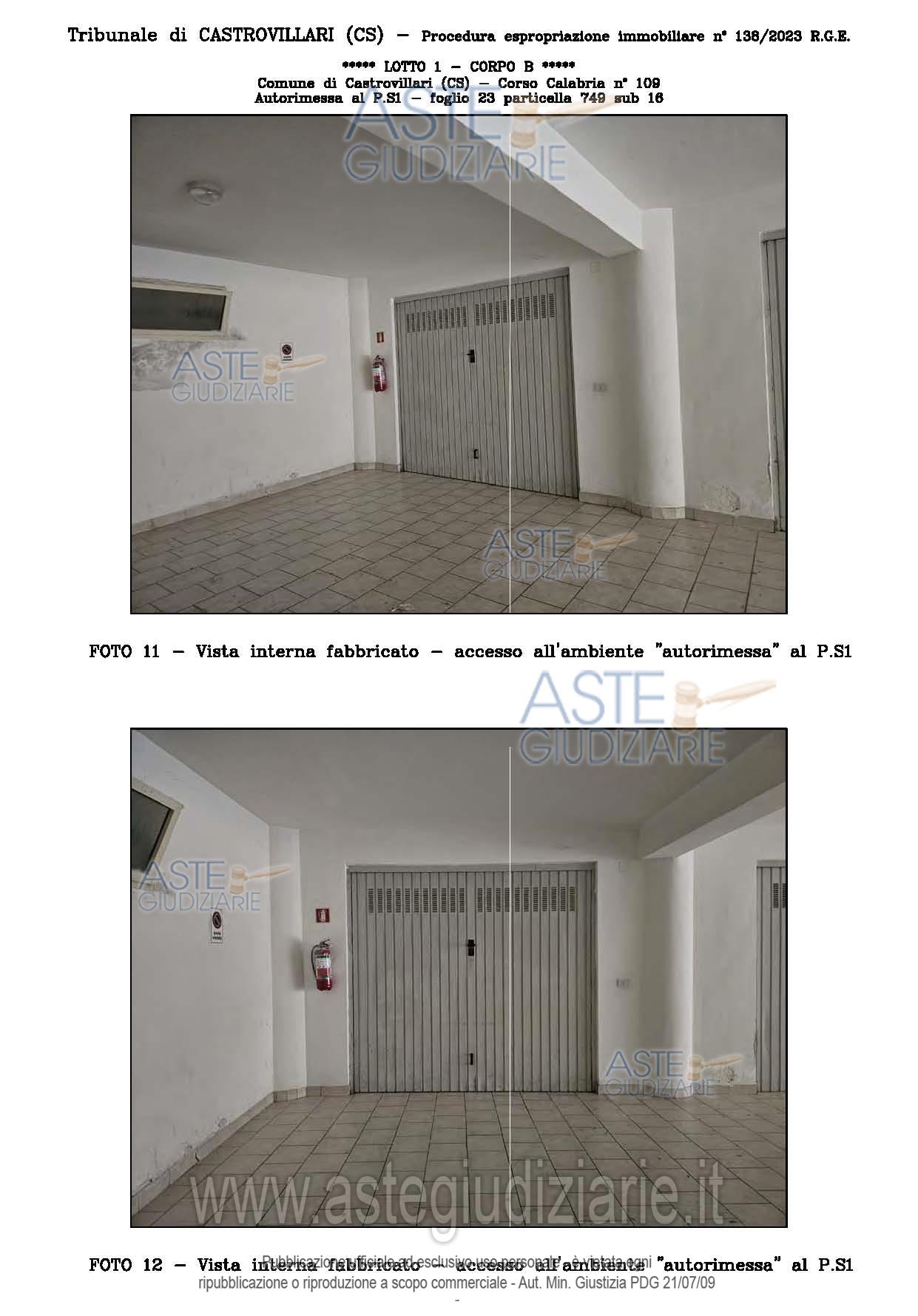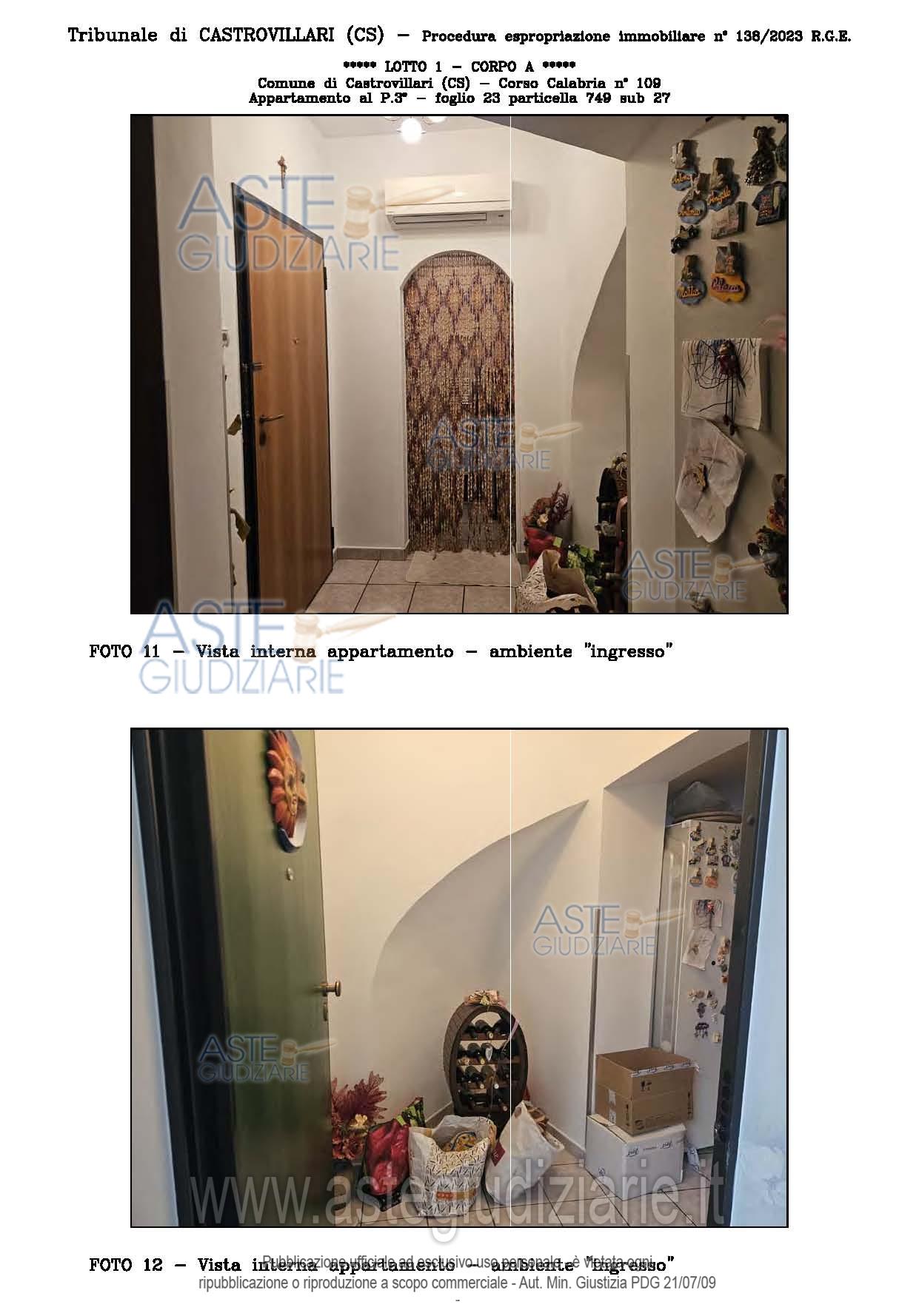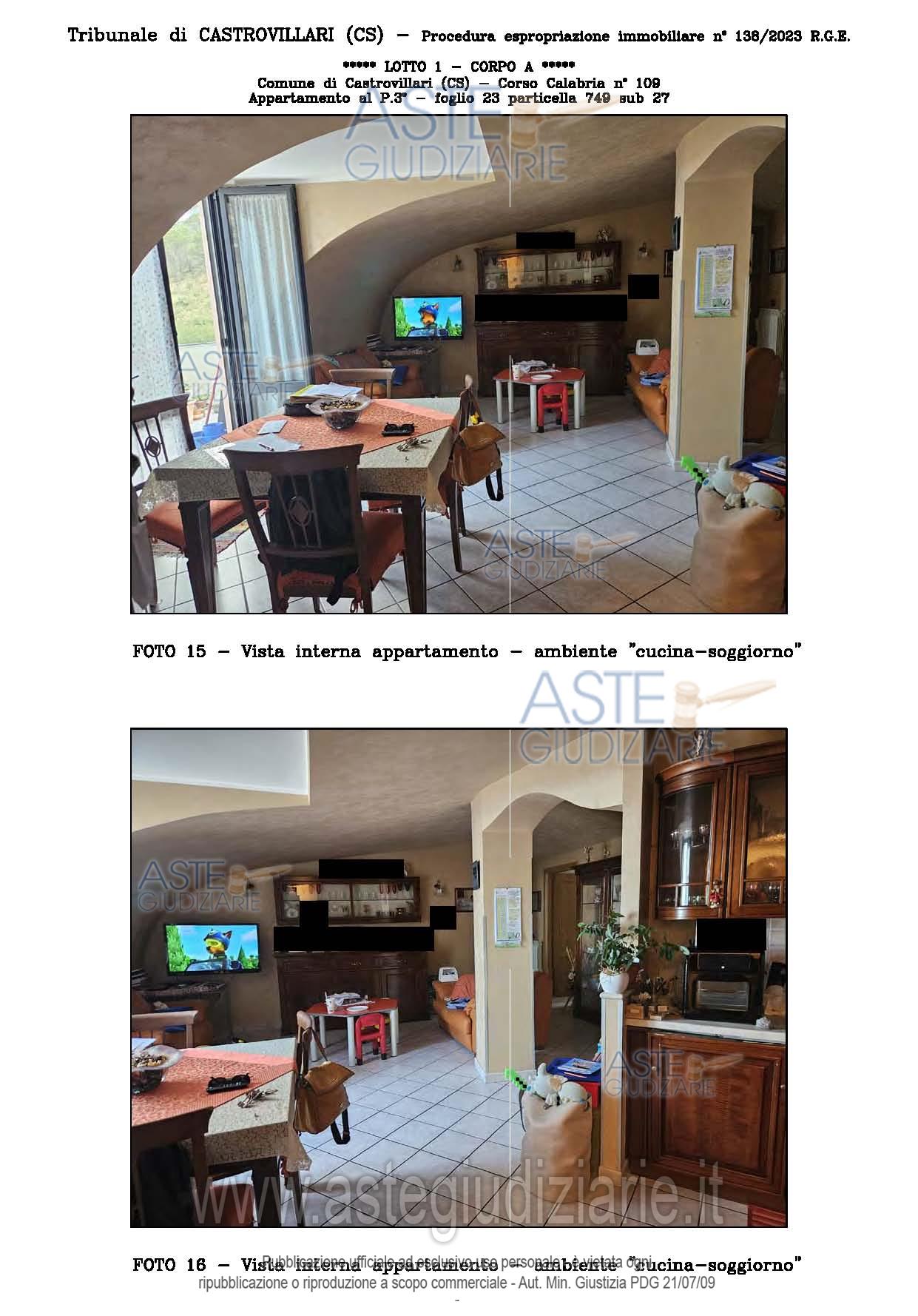Vendita all'asta Senza incanto, con gara telematica sincrona - LOTTO UNICO: A: piena proprietà 1/1 dell’APPARTAMENTO MANSARDATO B: piena proprietà 1/1 dell’AUTORIMESSA in box singolo ubicata al P.S1 (interrato) del fabbricato “A”. Prezzo base € 48.499,32 (offerta minima € 36.374,49). Data vendita 03/02/2026 ore 16:00. Giudice Giuliana Gaudiano. Professionista delegato alla vendita Dott. Giuseppe Gammaro - Email "studiogammaro@gmail.com". Custode Giudiziario Dott. Giuseppe Gammaro - Email "studiogammaro@gmail.com"; Tel. 3298913665. Rif. Tribunale di Castrovillari - Espropriazione immobiliare (cartabia) n. 138/2023