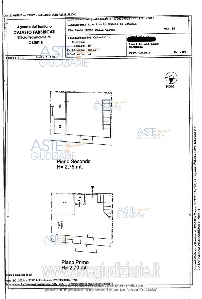 Vendita all'asta Competitiva, con gara telematica sincrona - LOTTO 8: LOTTO OTTO: Diritto di piena proprietà sulla seguente unità immobiliare: unità immobiliare urbana sita in Catania posta al primo e secondo piano, avente accesso dal civico n. 51 di Via Santa Maria della Catena, composta da 3,5 vani, censito al NCEU al fg. 69 part. 15491, sub. 24, piano 1-2, z.c.1, cat. A/3, cl. 5, vani 3,5, RC € 325,37;. Prezzo base € 48.750,00 (offerta minima € 36.562,50). Data vendita 14/04/2026 ore 10:00. Giudice Cristiana Delfa. Professionista delegato alla vendita Avv. Gaetano Messina. Custode Giudiziario Avv. Gaetano Messina - Email "g.messina@testaavvocati.it". Rif. Tribunale di Catania - Esecuzione immobiliare post legge 80 n. 618/2021