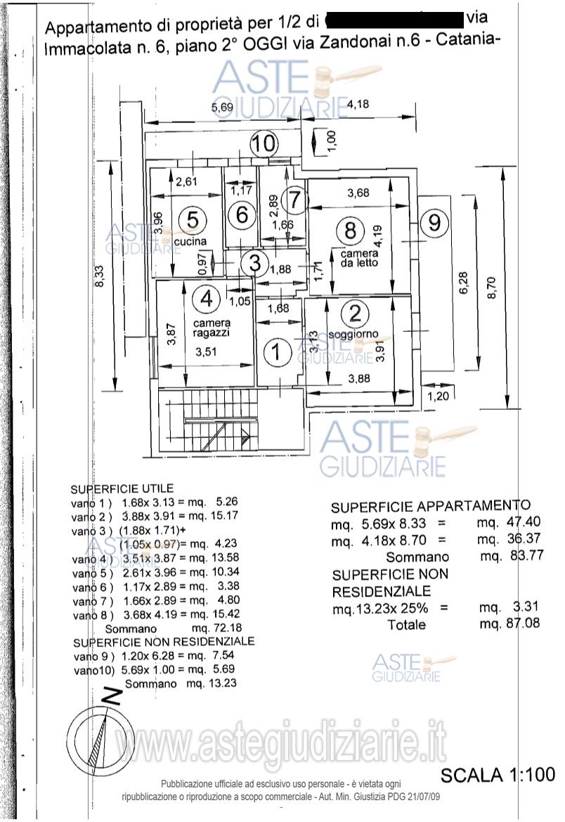 Vendita all'asta Competitiva, con gara telematica sincrona mista - LOTTO UNICO: Quota indivisa pari al 50% della piena proprietà su appartamento per civile abitazione al piano 2, facente parte di un fabbricato condominiale in Catania, Via Zandonai, n. 6 (già Via Immacolata n. 6), composto da ingresso, soggiorno, due camere, cucina, lavanderia e bagno, per una superficie totale di mq. 87,08. Prezzo base € 45.000,00 (offerta minima € 33.750,00). Data vendita 25/06/2026 ore 12:00. Professionista delegato alla vendita Avv. Giovanni Perrotta - Email "gperrotta@perrottalex.it"; Cell. 3387893973; Tel. 0957463369. Custode Giudiziario Avv. Giovanni Perrotta - Email "gperrotta@perrottalex.it"; Cell. 3387893973; Tel. 0957463369. Rif. Tribunale di Catania - Esecuzione immobiliare post legge 80 n. 853/2015