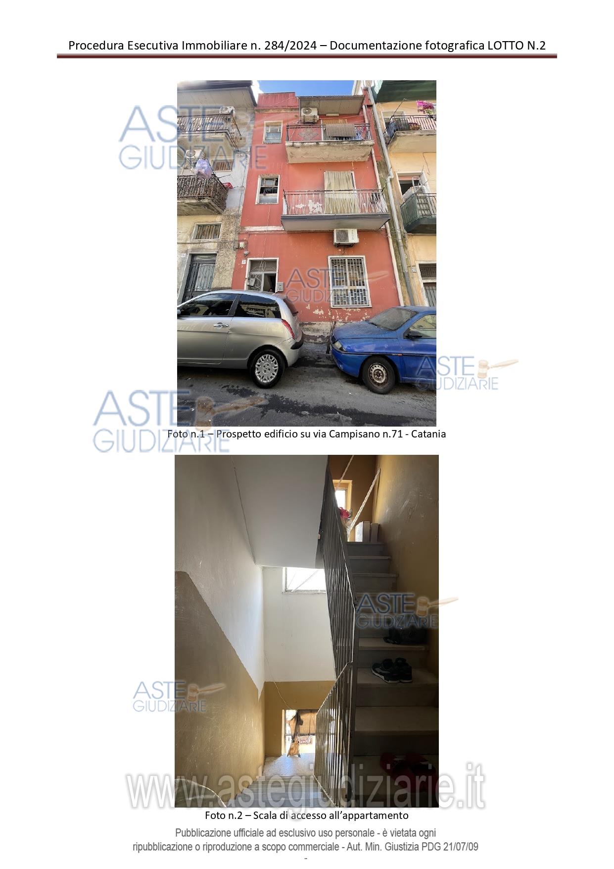 Vendita all'asta Senza incanto, con gara telematica sincrona - LOTTO 2: piena proprietà appartamento per civile abitazione sito a Catania, via Campisano n. 71, piano secondo, privo di ascensore, facente parte di un edificio residenziale a due elevazioni fuori terra, composto da due vani ed accessori, superficie comm. mq. 48,90. Prezzo base € 30.000,00 (offerta minima € 22.500,00). Data vendita 19/06/2026 ore 11:00. Professionista delegato alla vendita: Dott. Rosario Maria Garra - Email "rosariomariagarra@gmail.com"; Tel. 095/504410; Cell. 375/5361199.