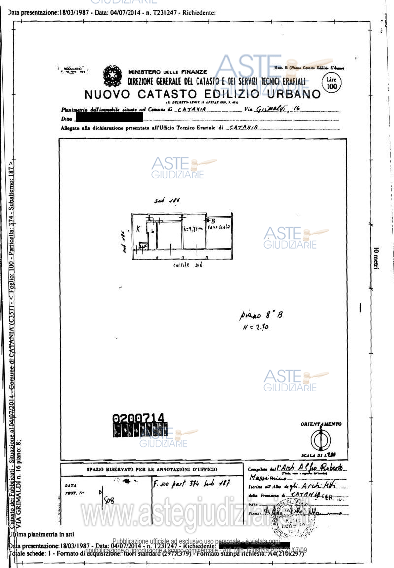 Vendita all'asta Senza incanto - LOTTO UNICO: Appartamento per civile abitazione sito nel comune di Catania, Viale Grimaldi num. 16, Scala “F”, al piano ottavo, composto da vani due oltre accessori, della superficie di mq. 70,31. Iscritto nel N.C.E.U. del comune censuario di Catania, al Foglio 100, particella 374, Subalterno 187, Categoria A/3, Classe 5, consistenza vani catastali 4, Rendita euro 371,85. Prezzo base € 20.541,09 (offerta minima € 15.405,81). Data vendita 21/04/2026 ore 11:30. Professionista delegato alla vendita Avv. Domenico Barbarino - Email "studiolegalebarbarino@gmail.com"; Cell. 3271352092; Tel. 3271352092. Custode Giudiziario Avv. Domenico Barbarino - Email "studiolegalebarbarino@gmail.com"; Cell. 3271352092; Tel. 3271352092. Rif. Tribunale di Catania - Esecuzione immobiliare post legge 80 n. 563/2012
