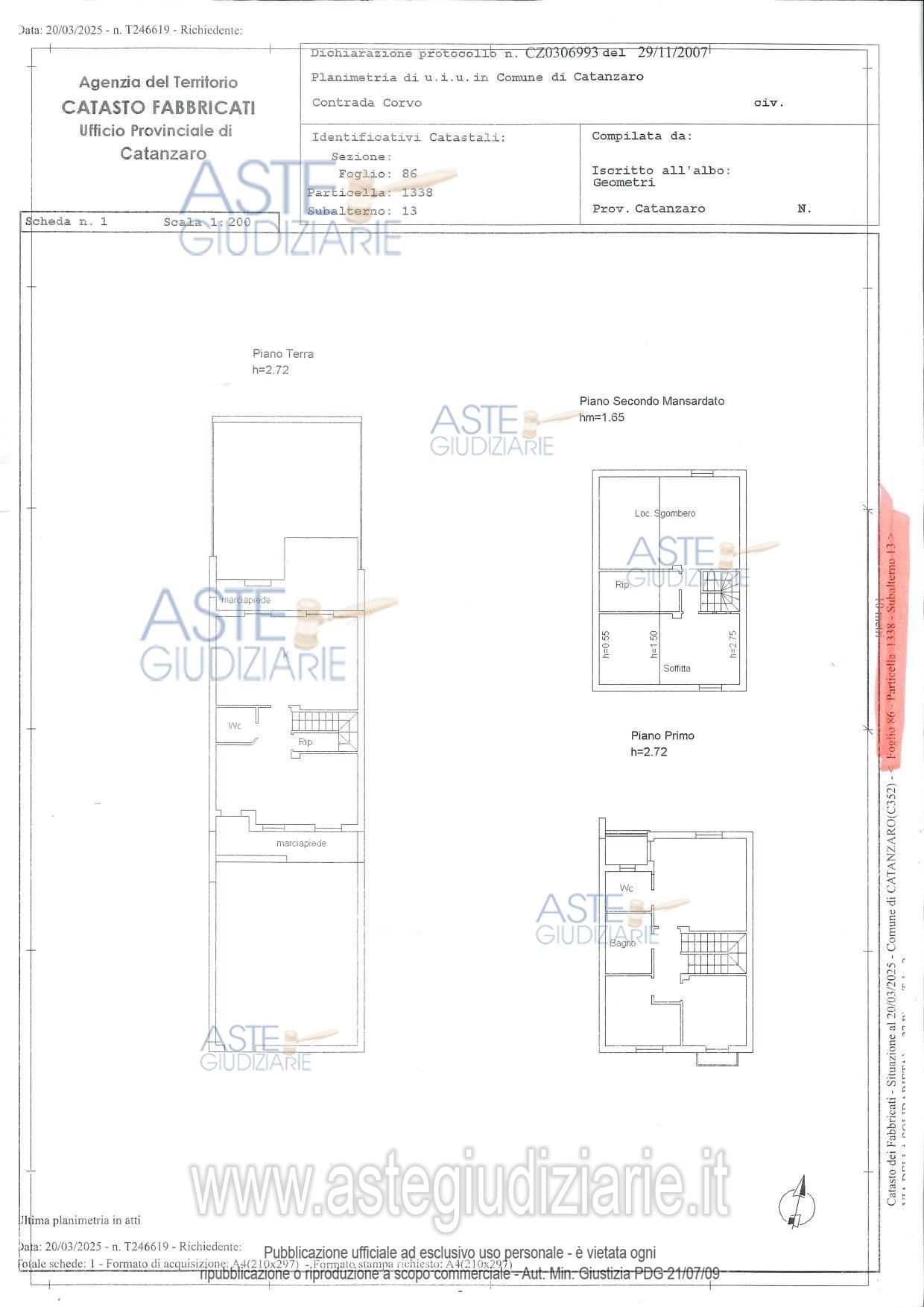Vendita all'asta Senza incanto, con gara telematica asincrona - LOTTO 0: Piena proprietà per la quota di 1000/1000 di unità immobiliare, superficie catastale mq 149,00, piano T-1-2; Resta compreso nel cespite esecutato il diritto di comproprietà pari a 2/10 dell’area urbana dellasuperfice di mq 384,00. , nella quale sono ubicati due posti auto contraddistinti dal numero 13 da attribuirsi al cespite esecutato in catasto al foglio 86 part. 1338, sub. 21. Prezzo base € 176.740,40 (offerta minima € 132.555,30). Data inizio operazioni di vendita: 11/05/2026 ore 10:00. Giudice Dott. Elais Mellace. Professionista delegato alla vendita Dott. Giuseppe Tomasello - Email "studiotomasello1@gmail.com"; Tel. 3289630353. Custode Giudiziario Dott. Giuseppe Tomasello - Email "studiotomasello1@gmail.com"; Tel. 3289630353. Rif. Tribunale di Catanzaro - Espropriazione immobiliare (cartabia) n. 64/2024