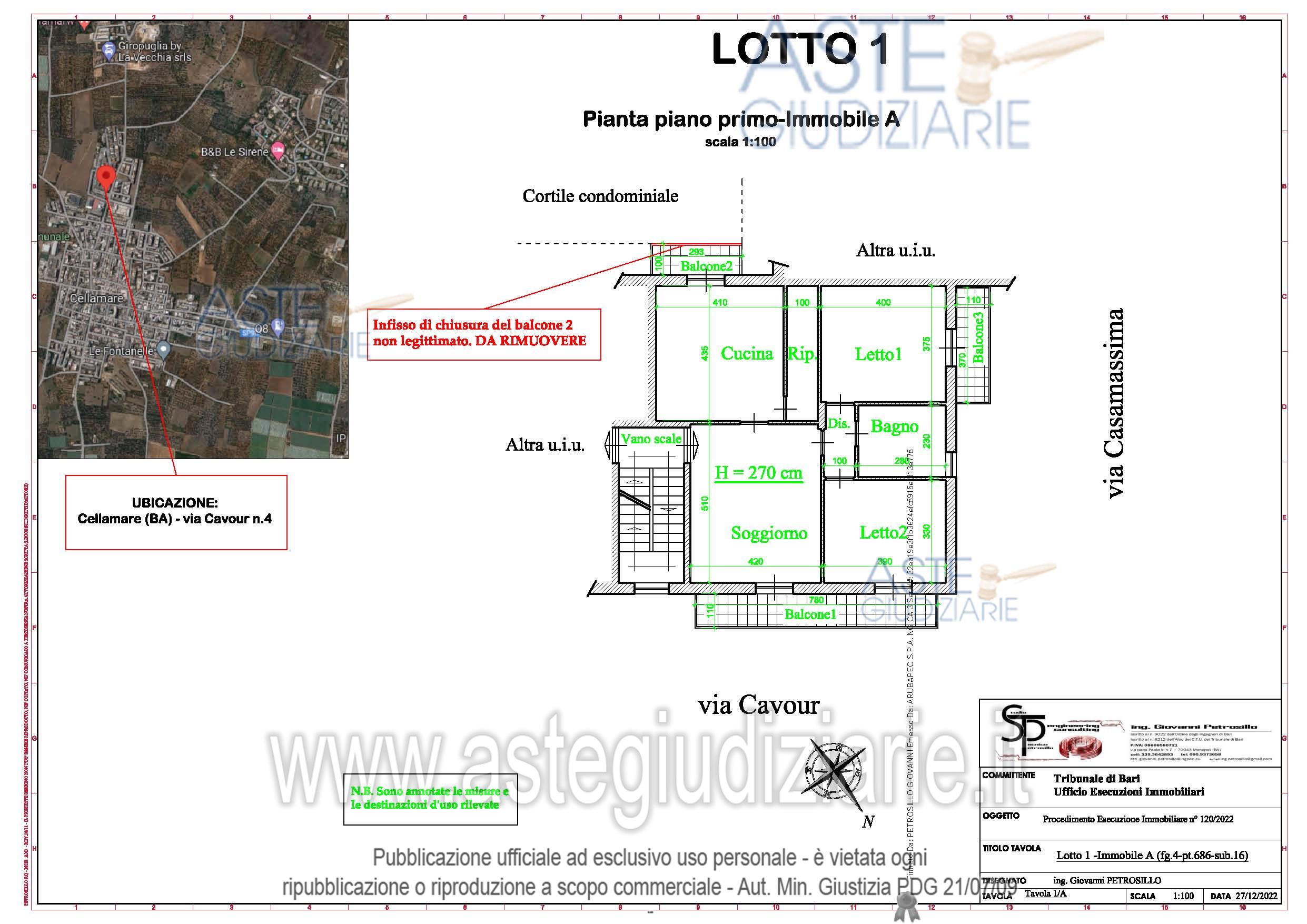 Vendita all'asta Senza incanto, con gara telematica asincrona - LOTTO 1: Abitazione di tipo economico censita al N.C.E.U. del Comune di Cellamare al fg.4 p. lla 686 sub. 16, categoria A/3, classe 4, vani 5, via Cavour n. 4, scala M piano 1, rendita €. 387,34. Nella vendita è compreso il diritto di parcheggio auto nel cortile retrostante, nonché un piccolo locale a piano terra sempre nel cortile retrostante, destinato alla centrale termica autonoma. Prezzo base € 82.500,00 (offerta minima € 61.875,00). Data inizio operazioni di vendita: 08/10/2025 ore 15:30. Giudice Dott. Chiara Cutolo. Professionista delegato alla vendita Avv. Dorotea D'amico - Email "dorisdamico@gmail.com"; Cell. 3393074528; Tel. 3393074528. Custode Giudiziario Avv. Dorotea D'amico - Email "dorisdamico@gmail.com"; Cell. 3393074528; Tel. 3393074528. Rif. Tribunale di Bari - Esecuzione immobiliare post legge 80 n. 120/2022