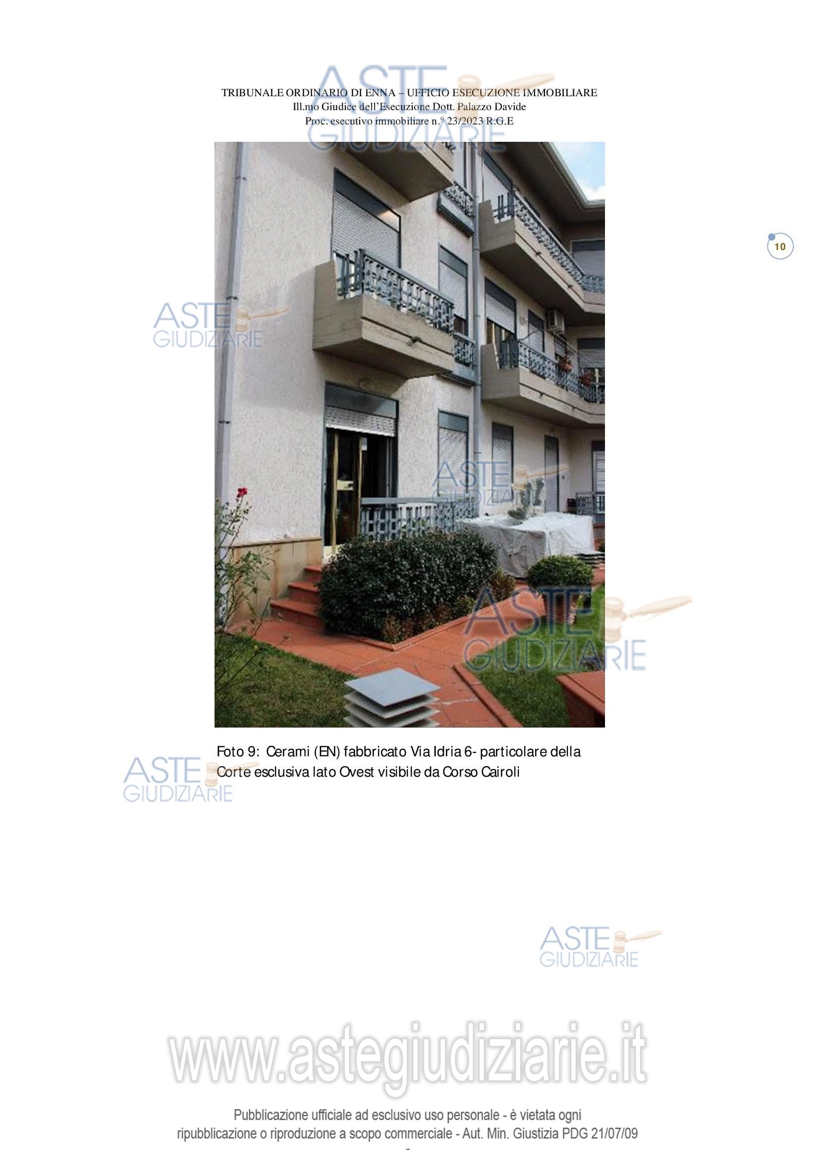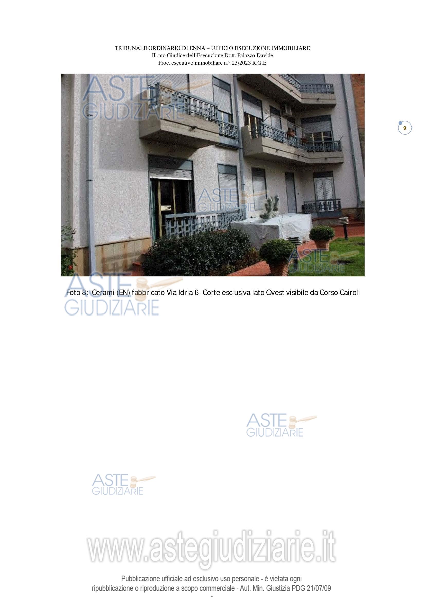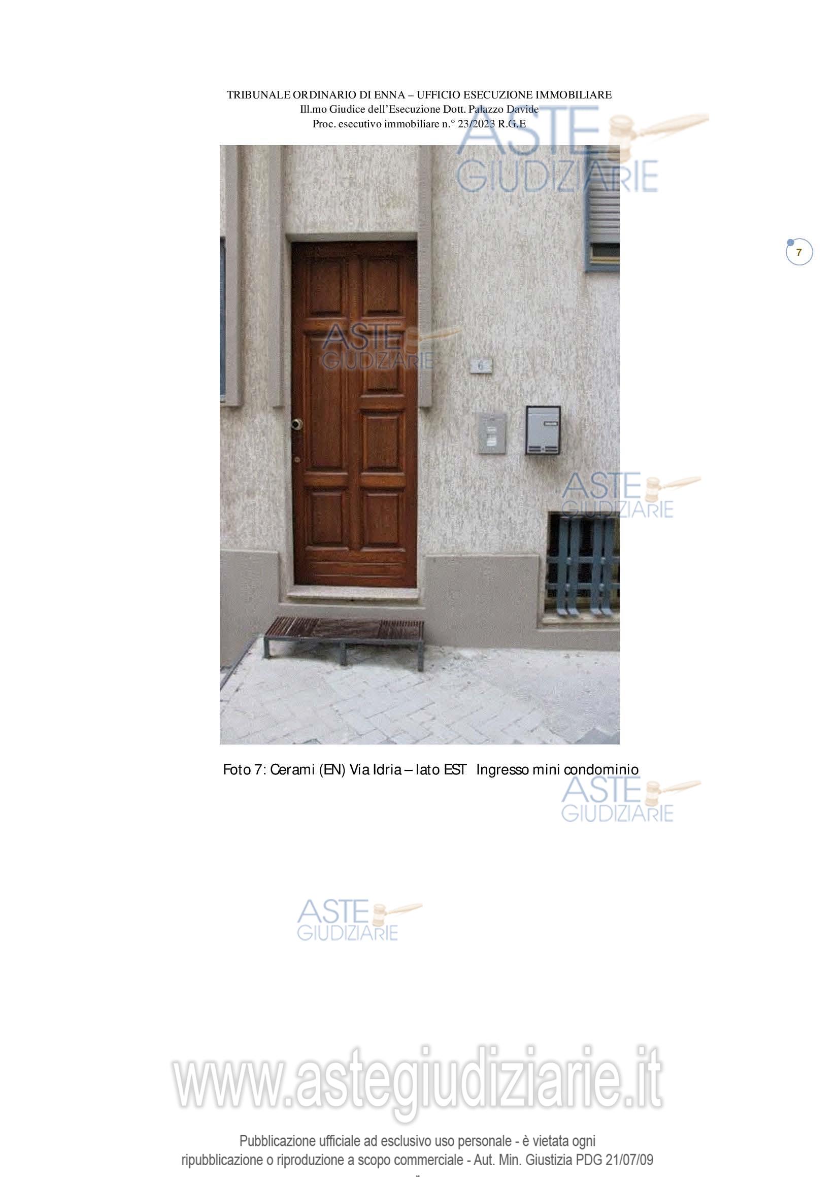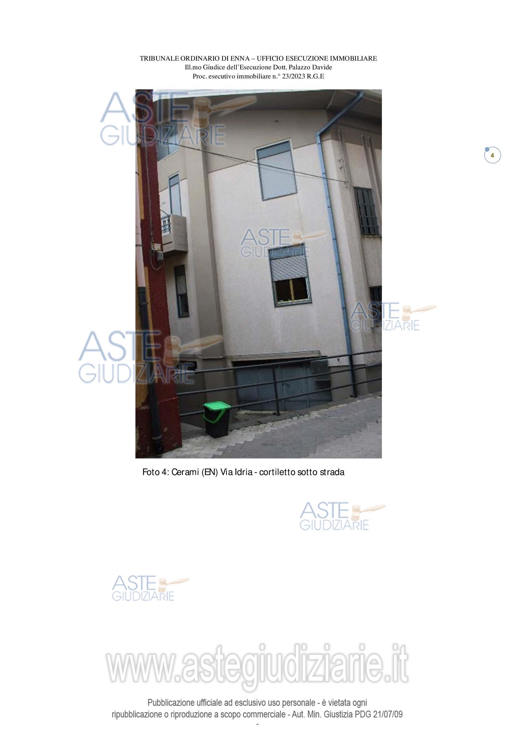Vendita all'asta Senza incanto, con gara telematica sincrona mista - LOTTO 1: Piena proprietà di un appartamento ad uso abitazione sito in Cerami alla via Idria n 6, al piano primo ed al piano seminterrato “S1”, di un edificio condominiale, composto complessivamente da due u. Prezzo base € 61.822,00 (offerta minima € 46.366,50). Data vendita 18/02/2026 ore 15:00. Giudice Davide Palazzo. Professionista delegato alla vendita Avv. Angela Cammarata - Email "cammarata.angela@alice.it". Custode Giudiziario Avv. Angela Cammarata - Email "cammarata.angela@alice.it"; Tel. 0935533254. Rif. Tribunale di Enna - Espropriazione immobiliare (cartabia) n. 23/2023