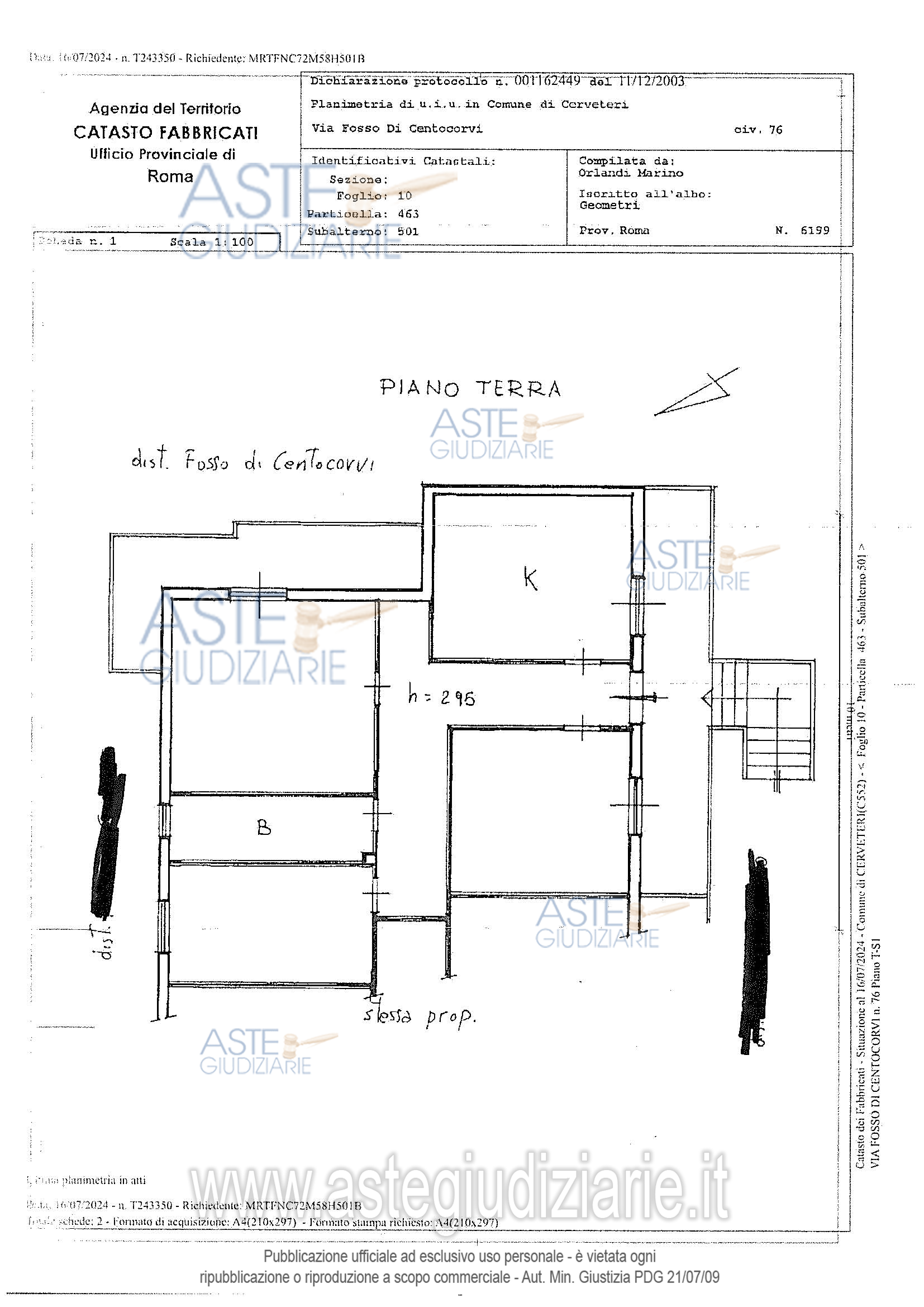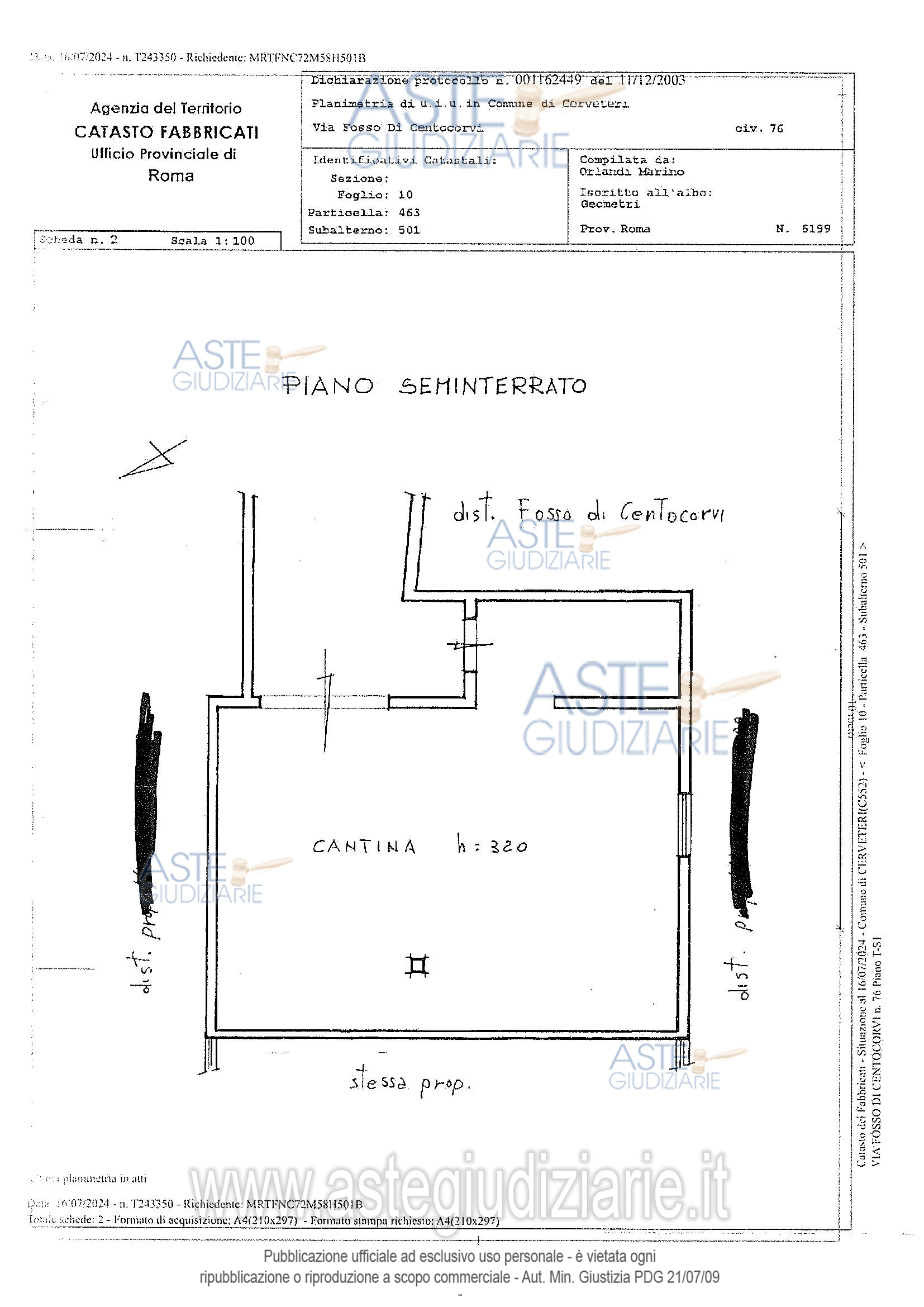 Vendita all'asta Senza incanto, con gara telematica asincrona - LOTTO UNICO: Piena proprietà della porzione immobiliare sita in Comune di Cerveteri, via Fosso dei Centocorvi n. 76 e precisamente: appartamento sito al piano rialzato composto da soggiorno/ingresso/angolo cottura, corridoio, tre camere, un bagno e due balconi, con annesso locale cantina al piano seminterrato. Prezzo base € 80.000,00 (offerta minima € 60.000,00). Data inizio operazioni di vendita: 15/04/2026 ore 16:00. Giudice Stefano Palmaccio. Professionista delegato alla vendita Avv. Renato Arseni - Email "avv.renato.arseni@gmail.com"; Tel. 069953073. Custode Giudiziario Avv. Renato Arseni - Email "avv.renato.arseni@gmail.com"; Tel. 069953073. Rif. Tribunale di Civitavecchia - Espropriazione immobiliare (cartabia) n. 54/2024