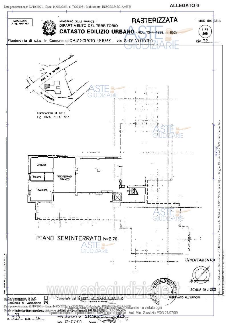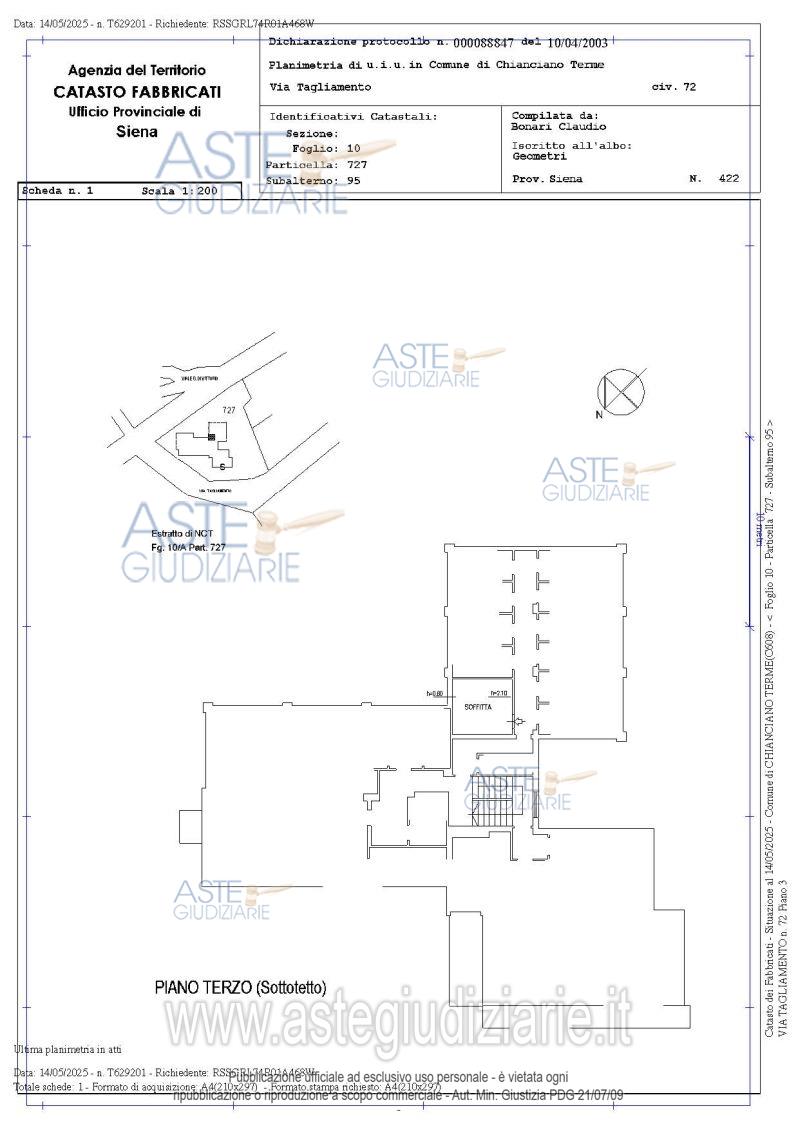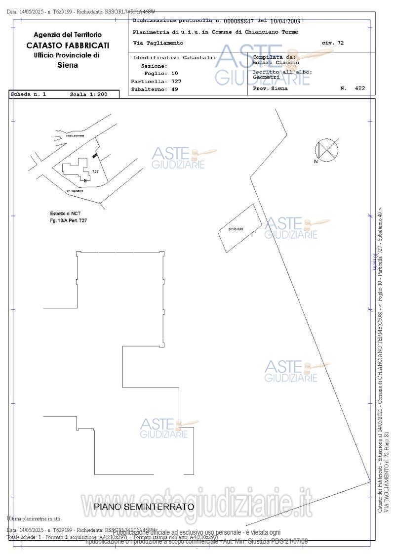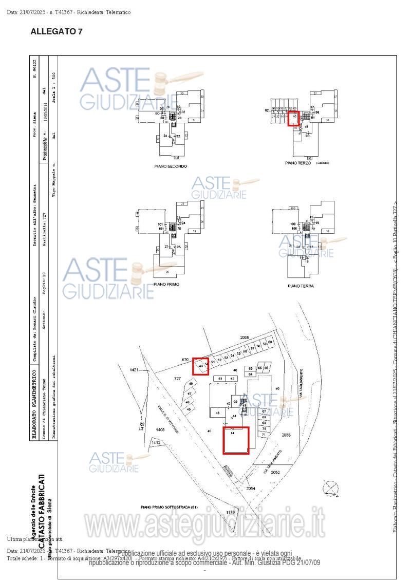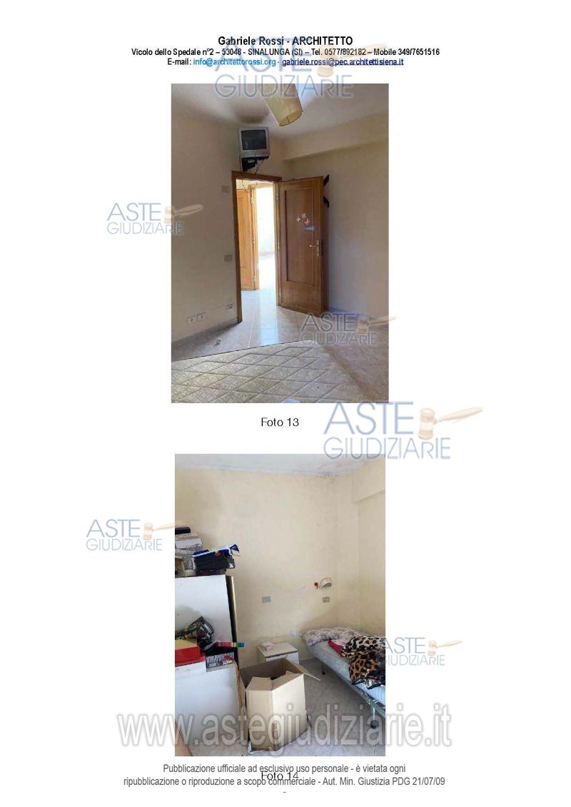 Vendita all'asta Senza incanto, con gara telematica asincrona - LOTTO UNICO: Diritto di piena proprietà su unità immobiliari a destinazione abitativa ed accessoria poste a Chianciano Terme (SI) in zona urbana, Via Tagliamento n°72 – Int. 14.Trattasi di un appartamento, un magazzino (soffitta) ed un posto auto esterno scoperto nello specifico: appartamento posto a piano terra di mq netti 42,75, formato da un soggiorno/pranzo con angolo cottura, un disimpegno, due camere e un bagno; magazzino posto al piano terzo (soffitta); posto auto esterno scoperto. Prezzo base € 33.000,00 (offerta minima € 25.000,00). Data inizio operazioni di vendita: 09/06/2026 ore 10:00. Giudice Marta Dell'unto. Professionista delegato alla vendita Avv. Gloria Bassi - Email "gloria@studiobruni.org"; Cell. 3204103458; Tel. 0550127087. Custode Giudiziario Avv. Istituto Vendite Giudiziarie Tribunale Di Siena - Email "visite@giustiziaivg.it"; Cell. 3397337017; Tel. 0577318111. Rif. Tribunale di Siena - Espropriazione immobiliare (cartabia) n. 193/2024